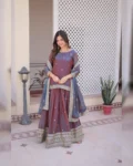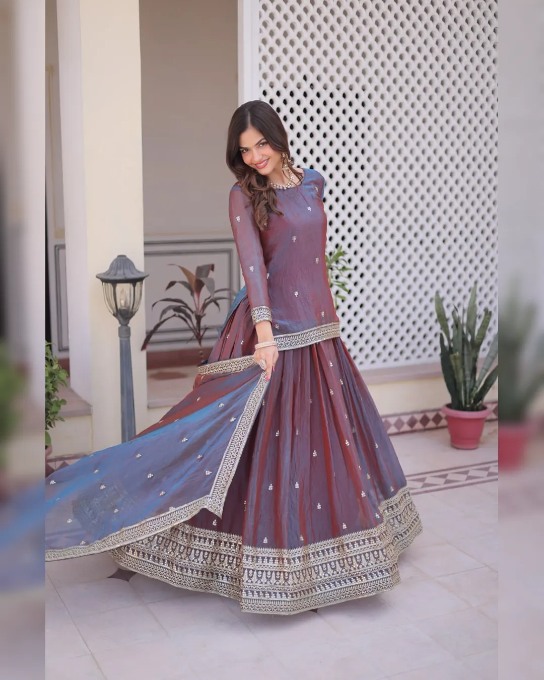 The fully stitched top features graceful bell sleeves and a classic round neckline, beautifully coordinated with a flowy embroidered lehenga enhanced with canvas patta for perfect flare. Completing the look is a matching dupatta detailed with designer lace borders — making this set ideal for weddings, sangeet nights, festive gatherings, and party occasions.