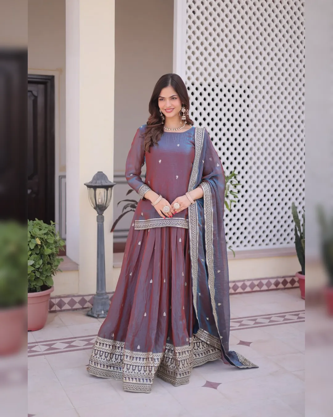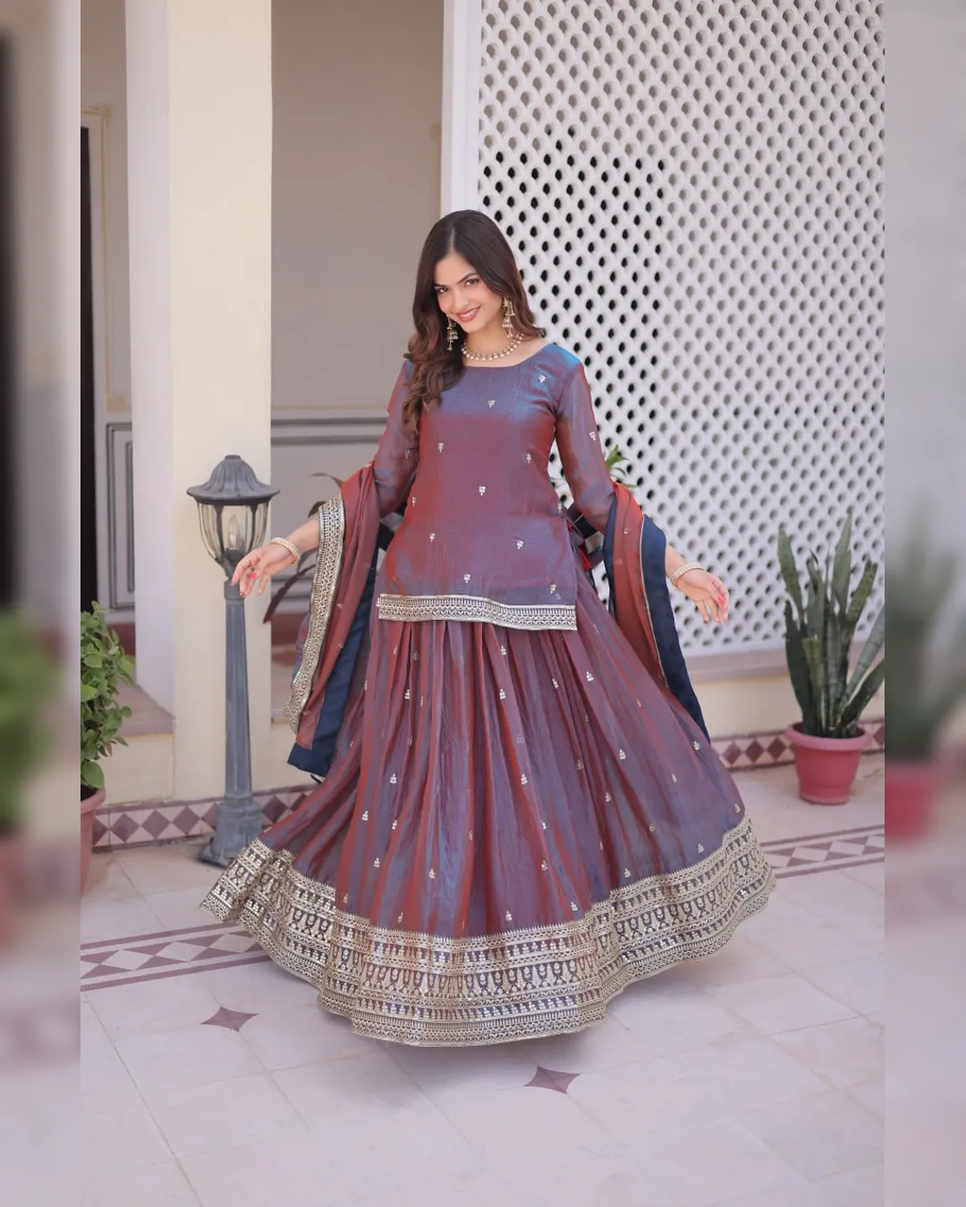 Turn every celebration into a fashion moment with this Premium Readymade Fendi Chiffon Top Lehenga Set, designed for modern festive elegance. Crafted in lightweight Fendi chiffon and adorned with rich zari and sequins embroidery, this ensemble delivers the perfect blend of comfort, shimmer, and sophistication.