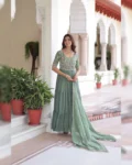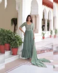Step into elegance with this premium readymade designer gown collection, crafted in faux blooming fabric with exquisite sequins, multithread and beads embroidery work. Designed for modern royalty, this gown features a breathtaking 12-meter grand flair, giving you a graceful and flowy silhouette perfect for special occasions.