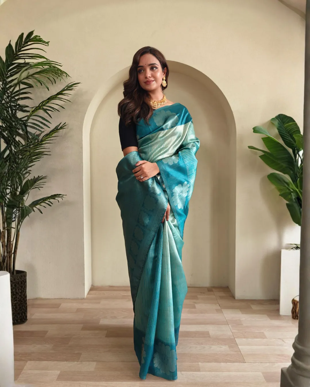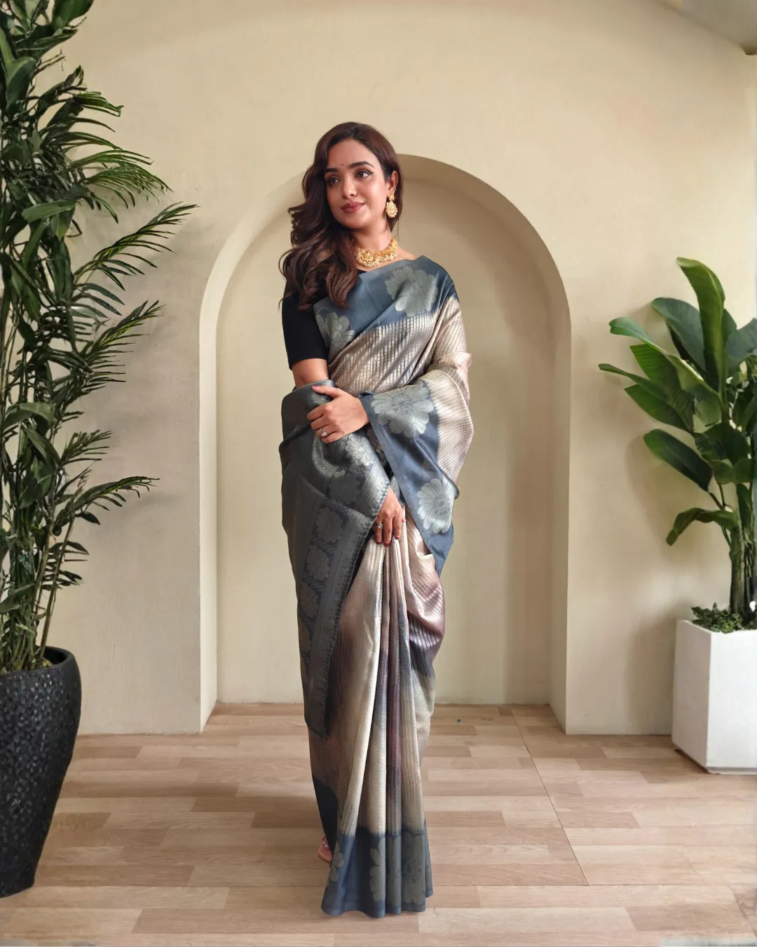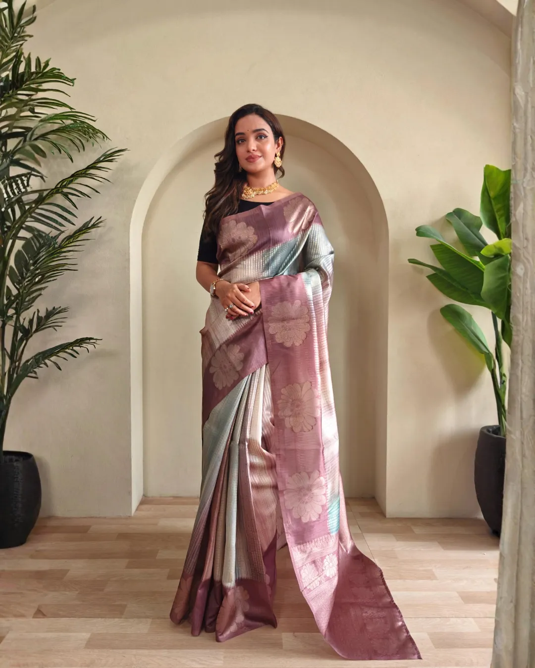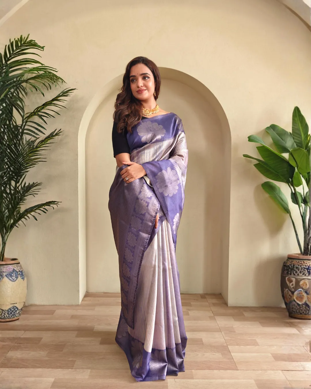 Paired with a contrast blouse matching the saree design, this outfit is ideal for festive occasions, weddings, and special gatherings. A perfect choice for women who love timeless elegance with a contemporary twist.