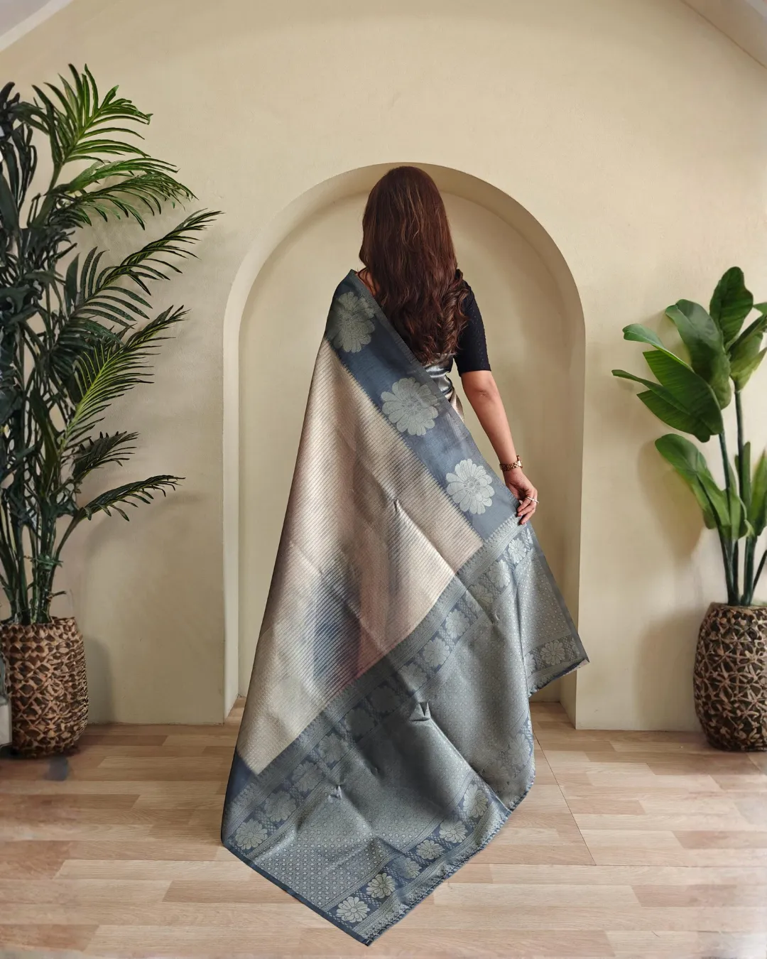 Adorned with elegant silver zari motif designs, the saree exudes a rich and sophisticated appeal. The highlight of this piece is its beautiful weaving flower pattern border and a striking contrast pallu, adding depth and grace to the overall design.