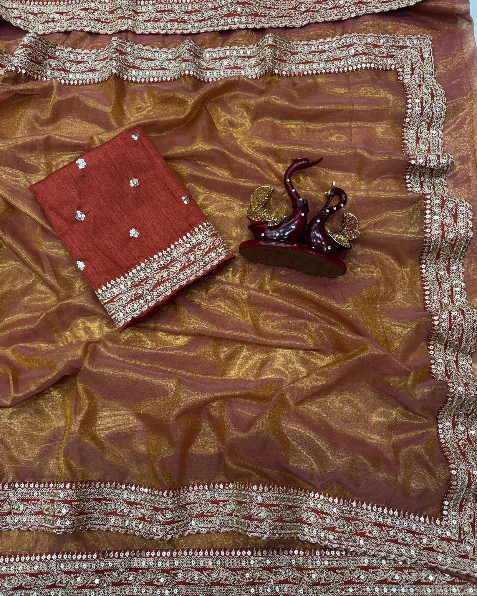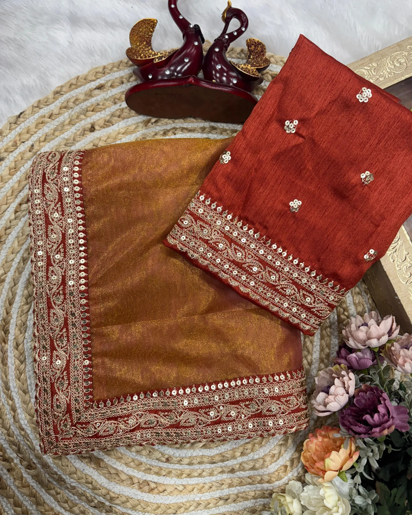 Stunning designer saree crafted in soft NC twill fabric featuring intricate sequins and dori embroidery work, paired with a mono banglori blouse with matching embroidery.