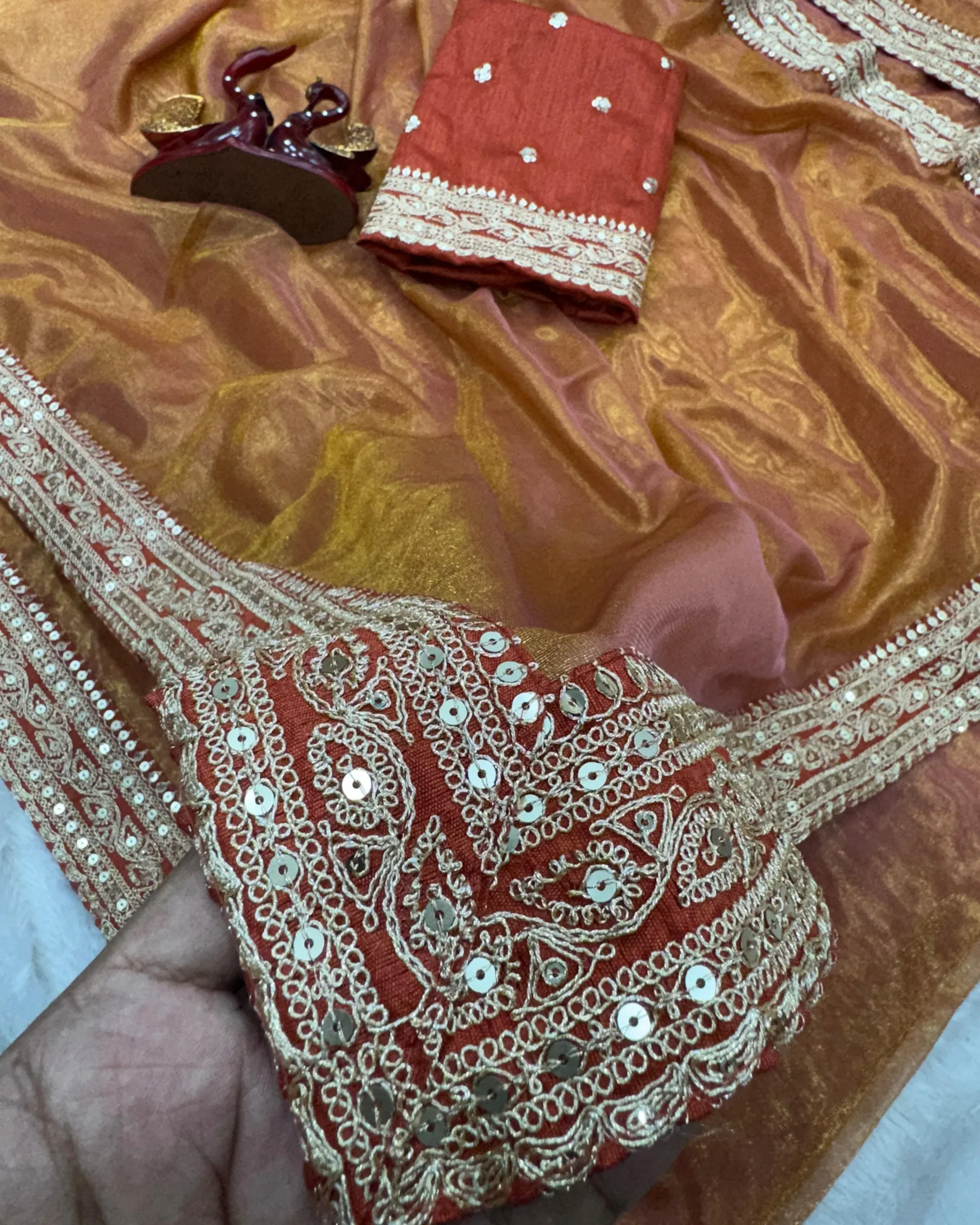 Paired with a mono banglori blouse featuring sequins embroidery work, this set completes your look with a touch of glamour. Ideal for parties, festive occasions, weddings, and special events, this saree is designed to make you stand out effortlessly.