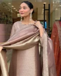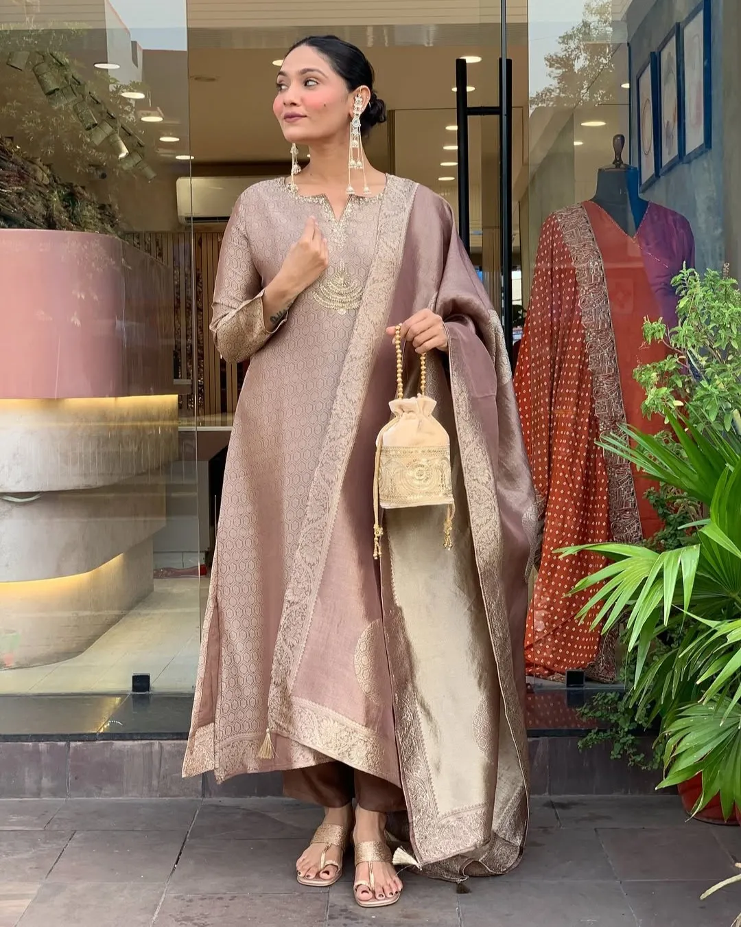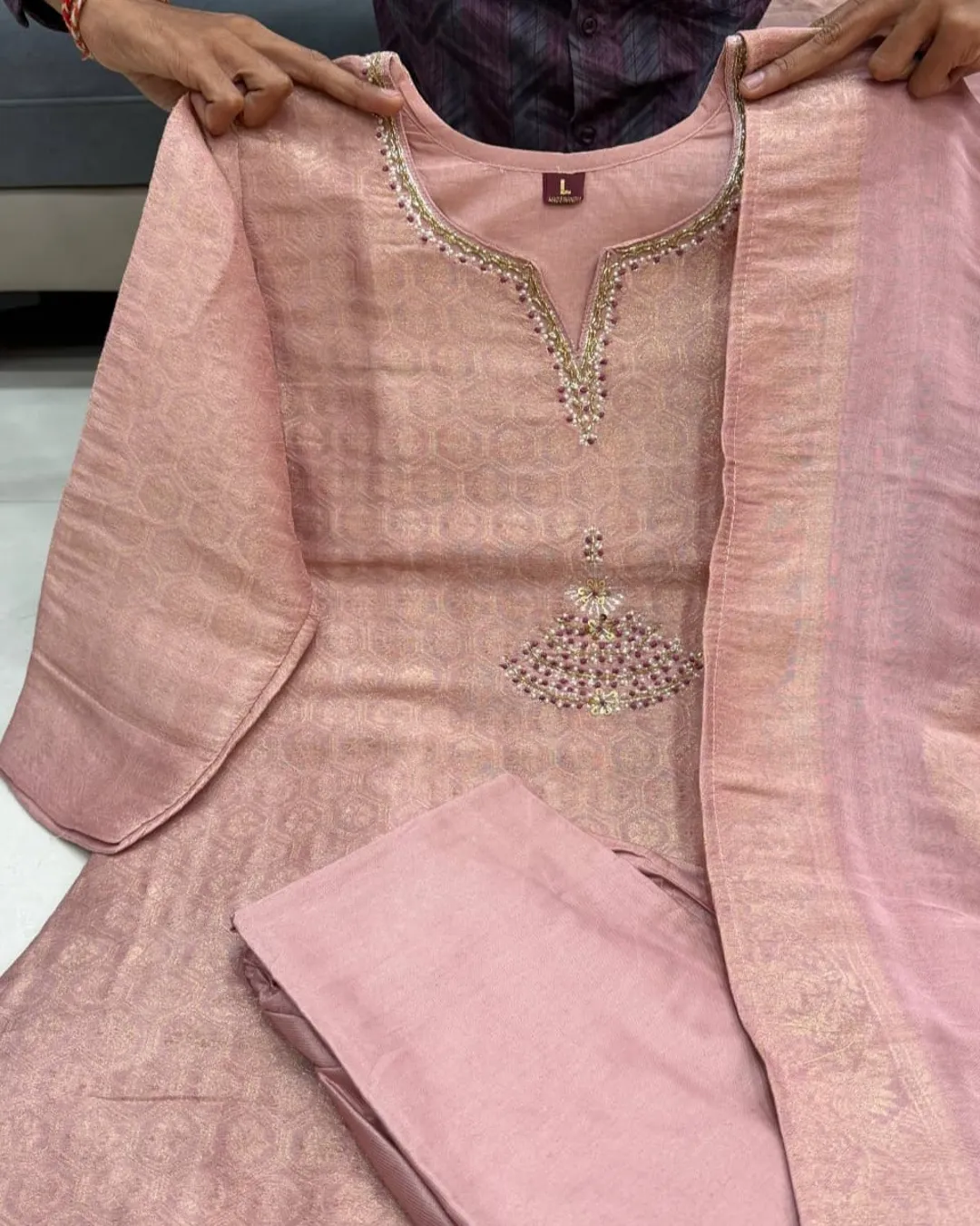 The highlight of this set is the beautifully designed kurti with full handwork neckline, adding a touch of craftsmanship and sophistication. It is paired with a Maharaja silky pant for a refined look and a pure zari weaving jacquard dupatta, enhancing the overall grace of the outfit.