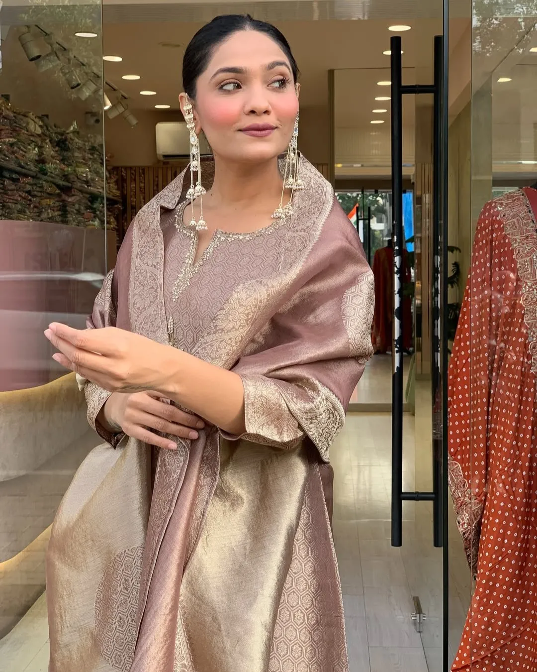 Introducing the Arivells Banarasi Special Suit Set, a perfect blend of luxury, tradition, and elegance. Crafted from pure Banarasi fabric, this outfit features rich zari weaving and intricate jacquard designs, giving it a premium showroom-quality finish.