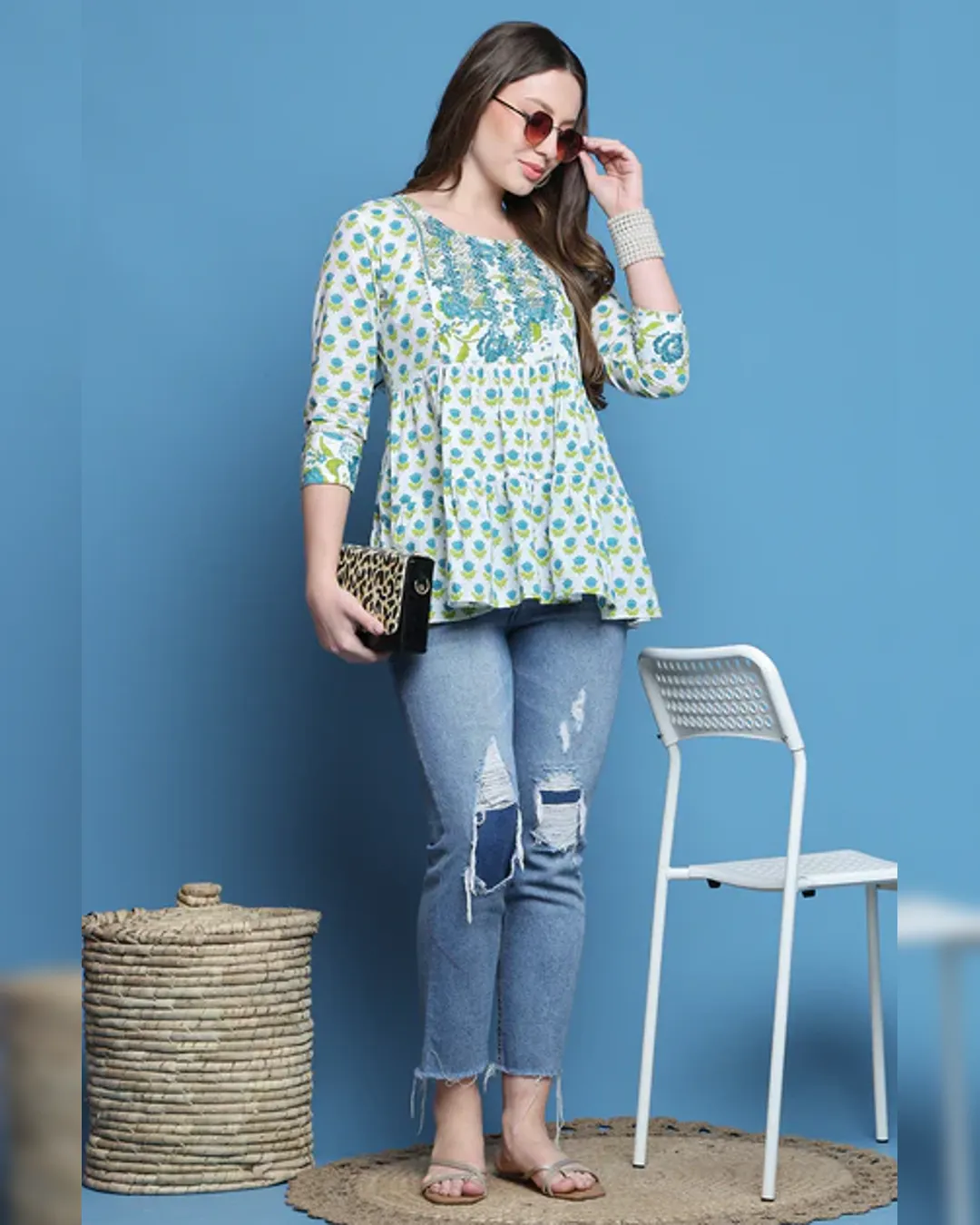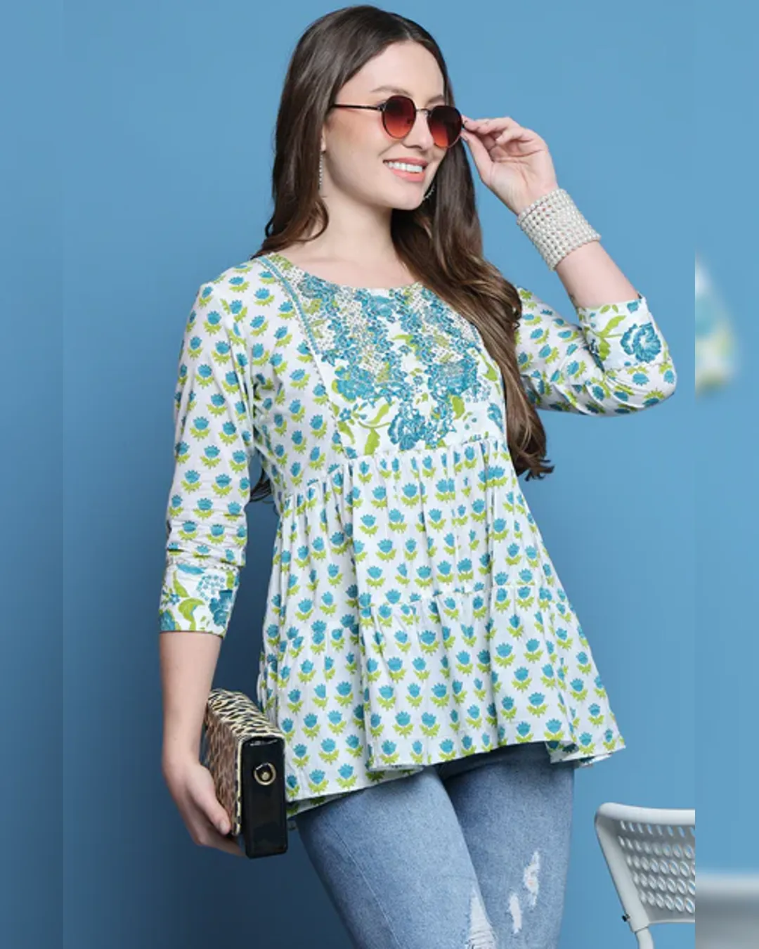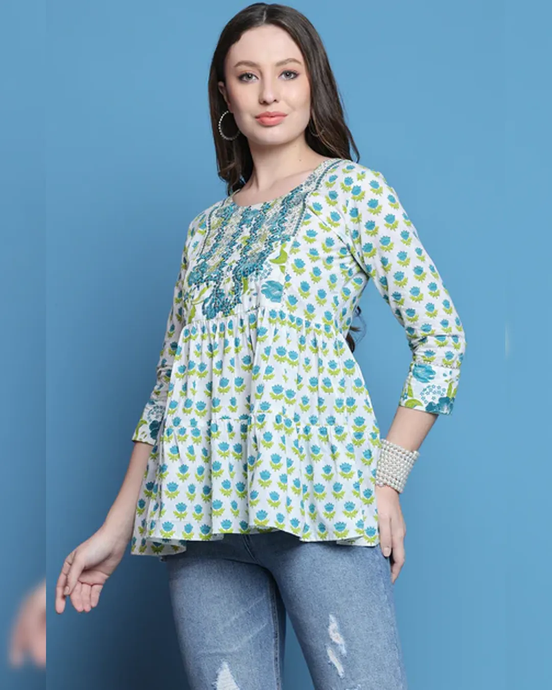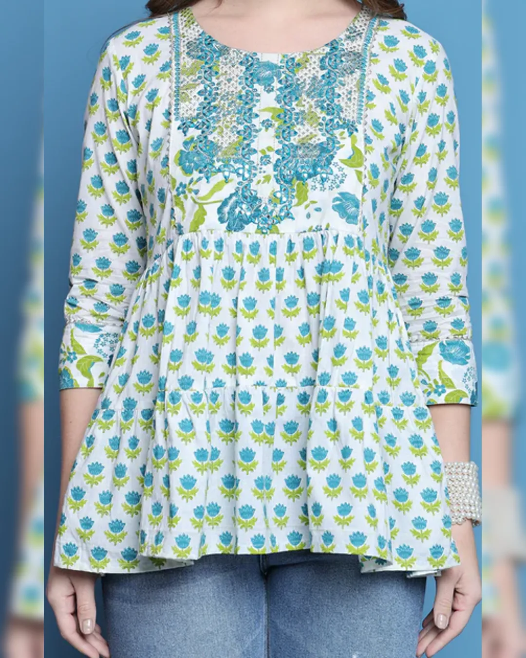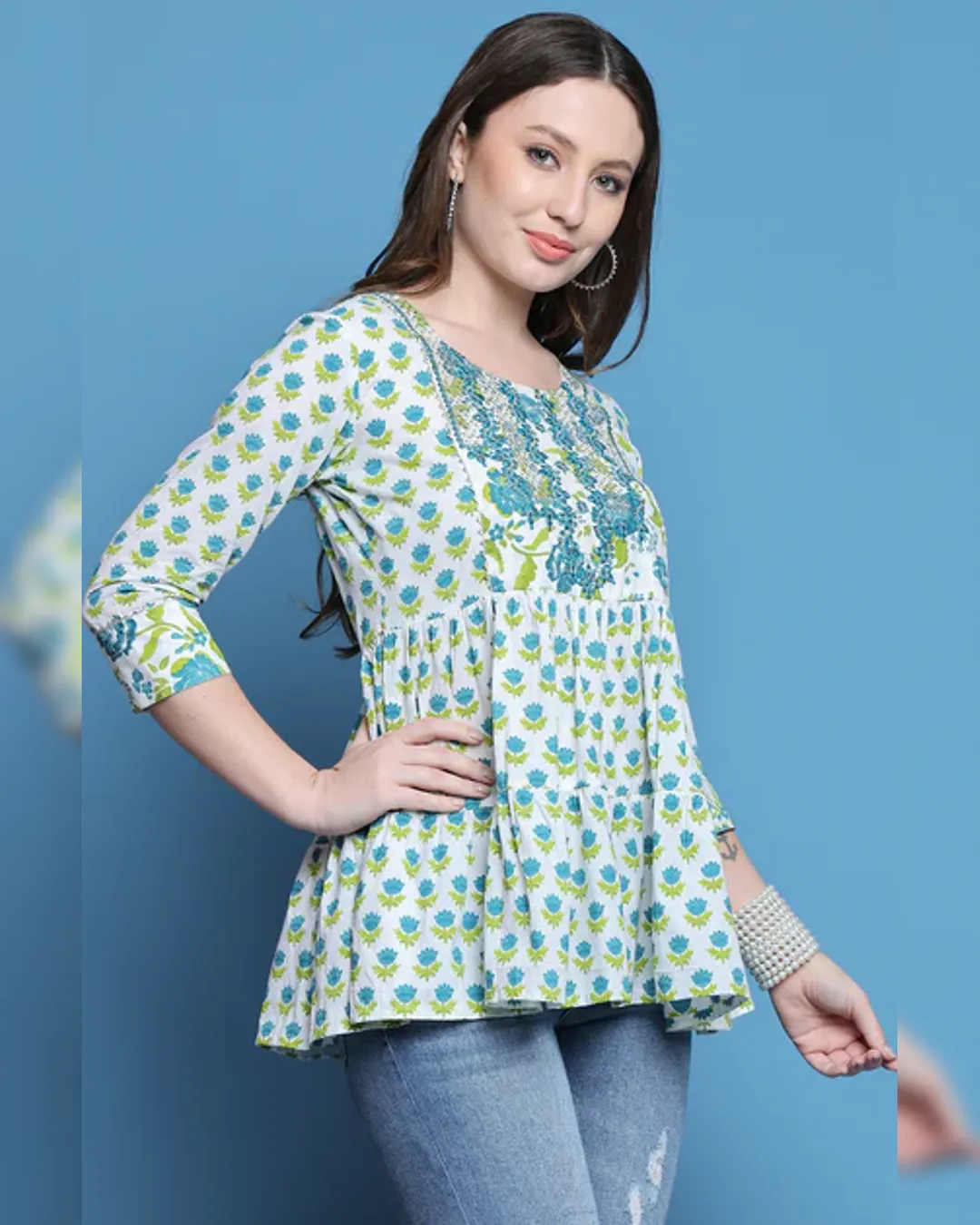 Slim-fit cotton short kurti with delicate thread work—ideal with jeans for a smart, effortless look.