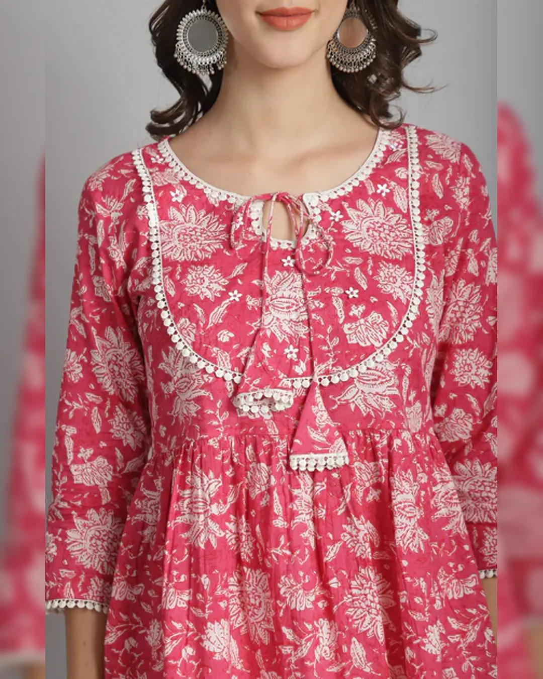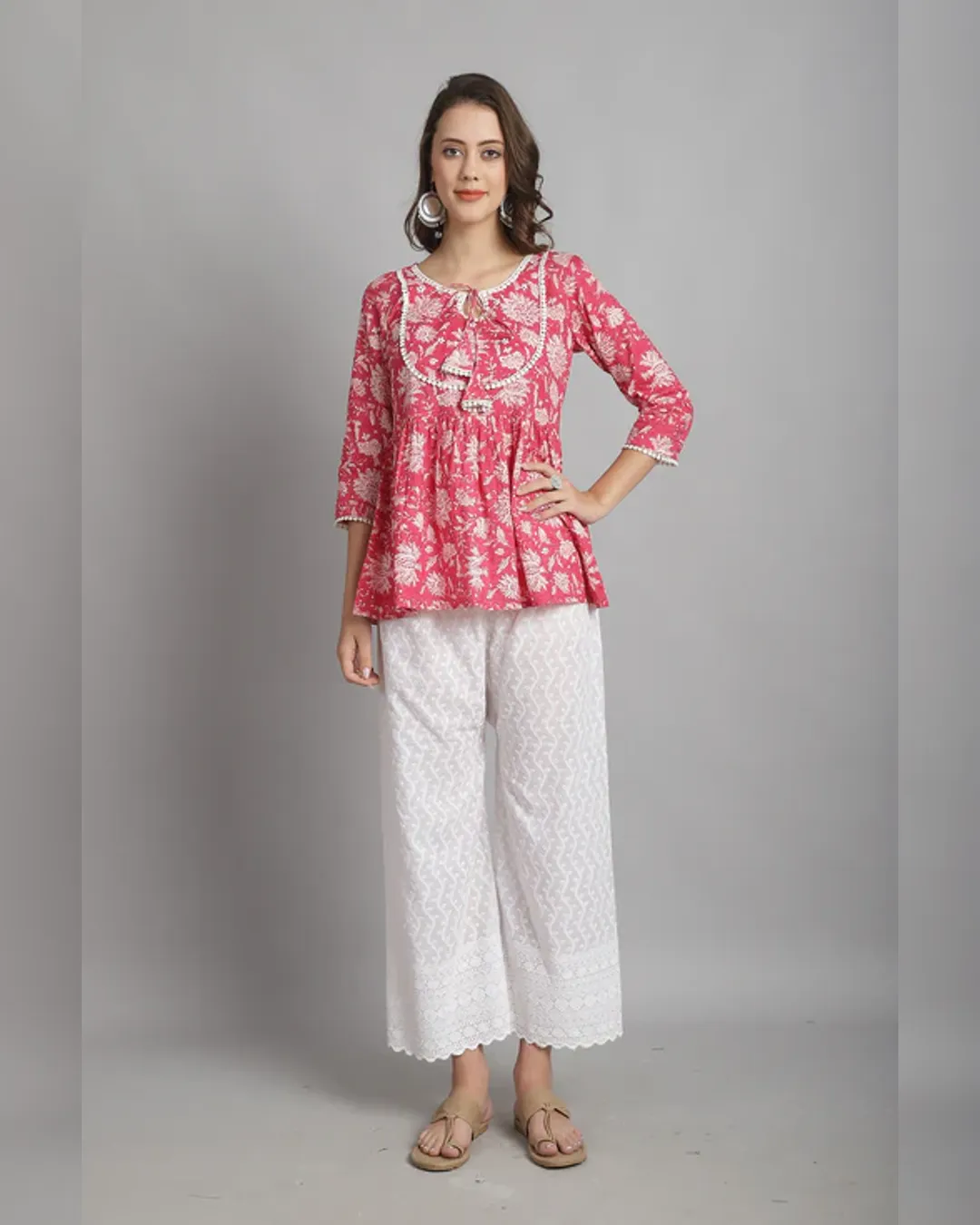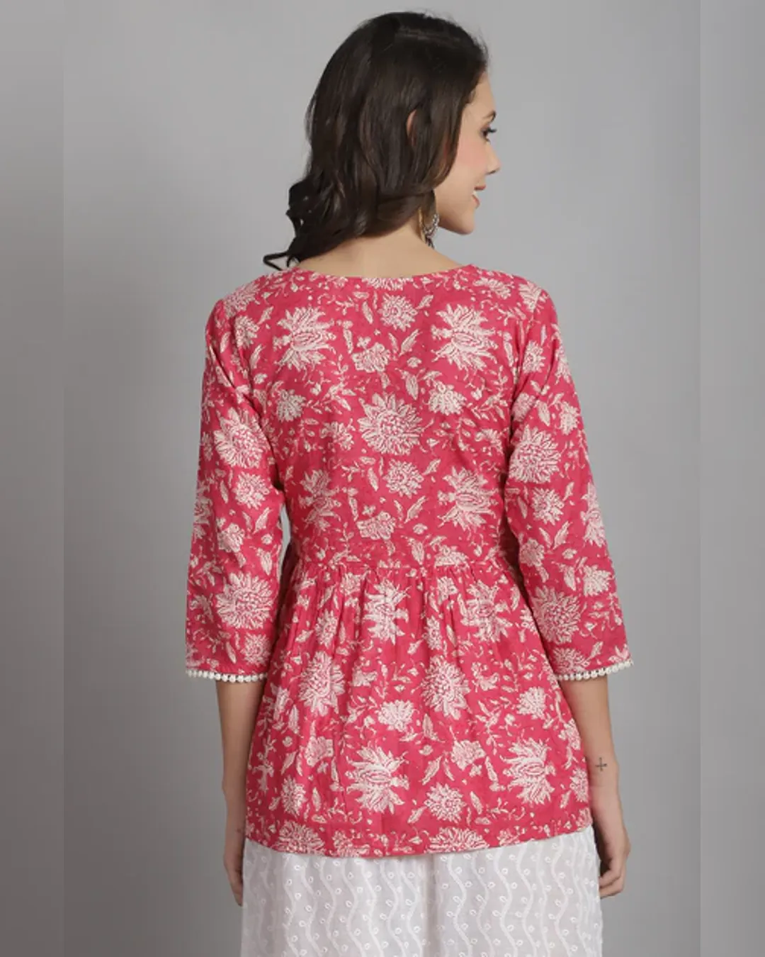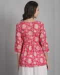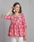 Slim-fit cotton short kurti with delicate thread work—ideal with jeans for a smart, effortless look.