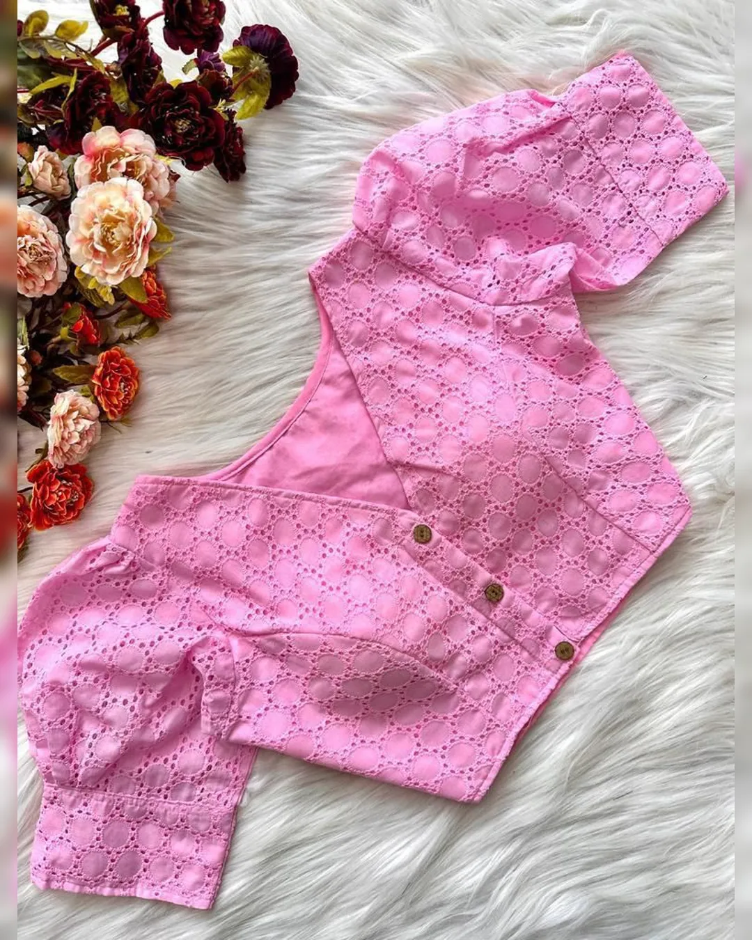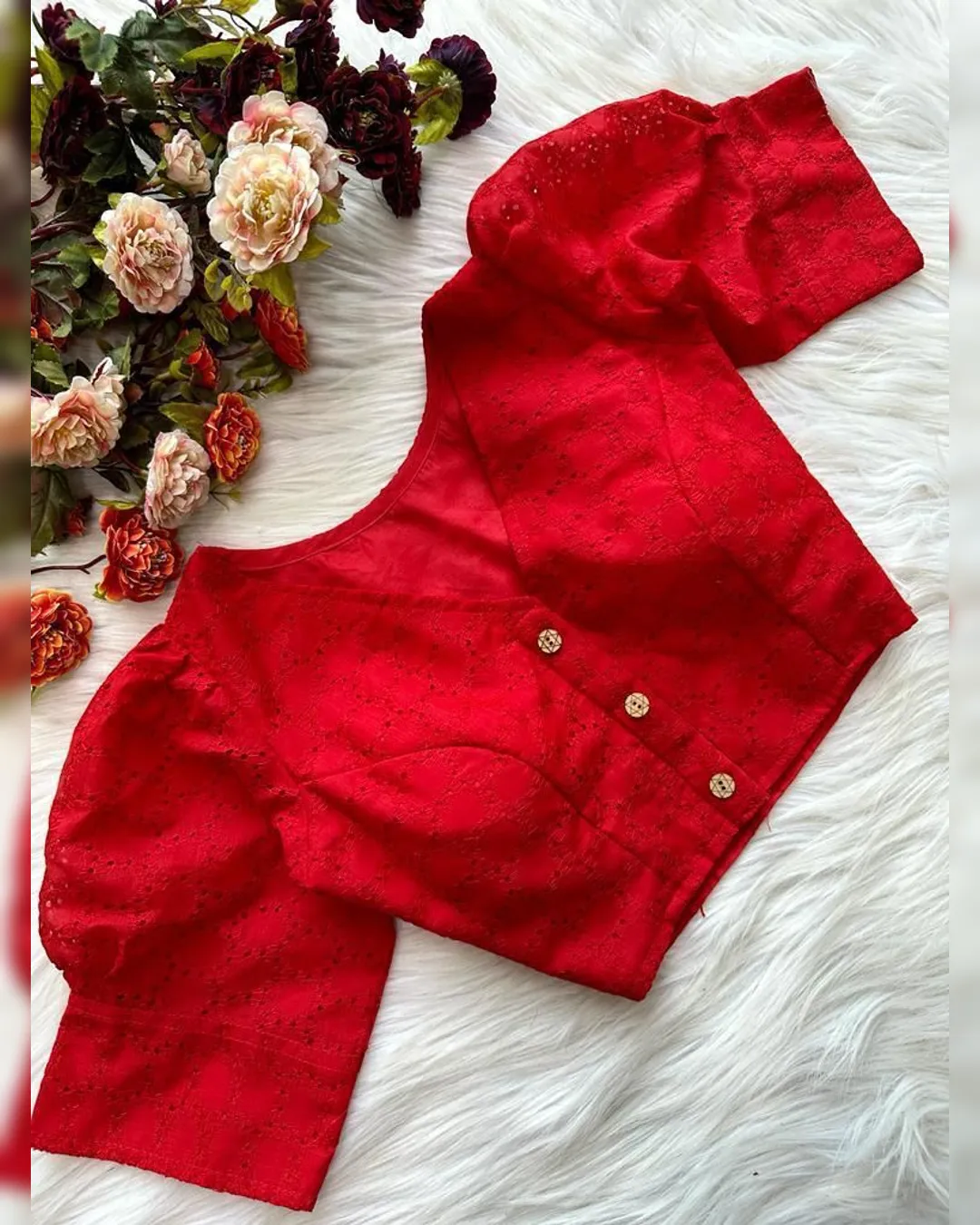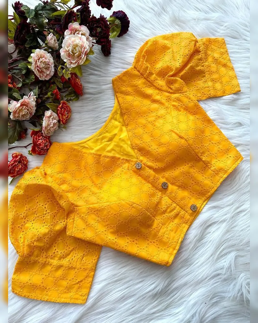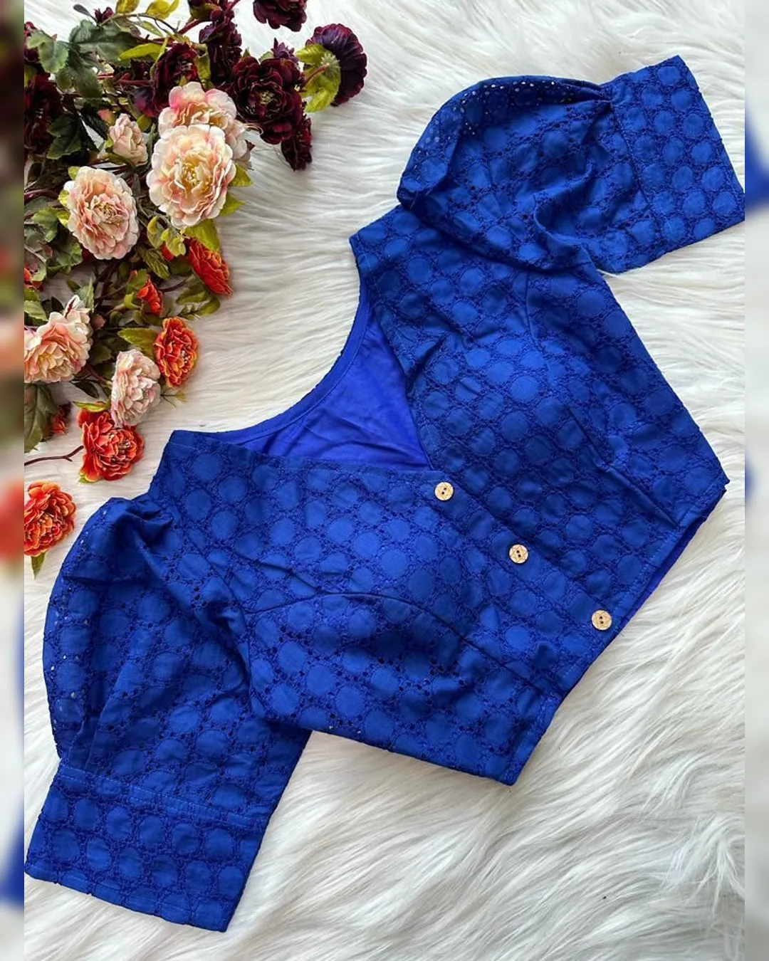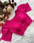 Enhance your ethnic wardrobe with this elegant Pure Cotton Hakoba Blouse, featuring a trendy football design and charming puff sleeves. Crafted with heavy stitching and padded for extra comfort, this partywear blouse is designed for both style and durability. The front-open style adds a touch of sophistication, making it an ideal choice for sarees and lehengas. Available in 14 vibrant colors, this blouse is a must-have for every fashion enthusiast.