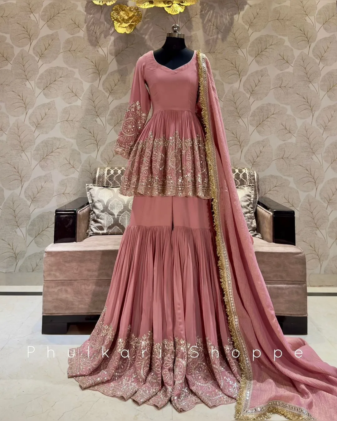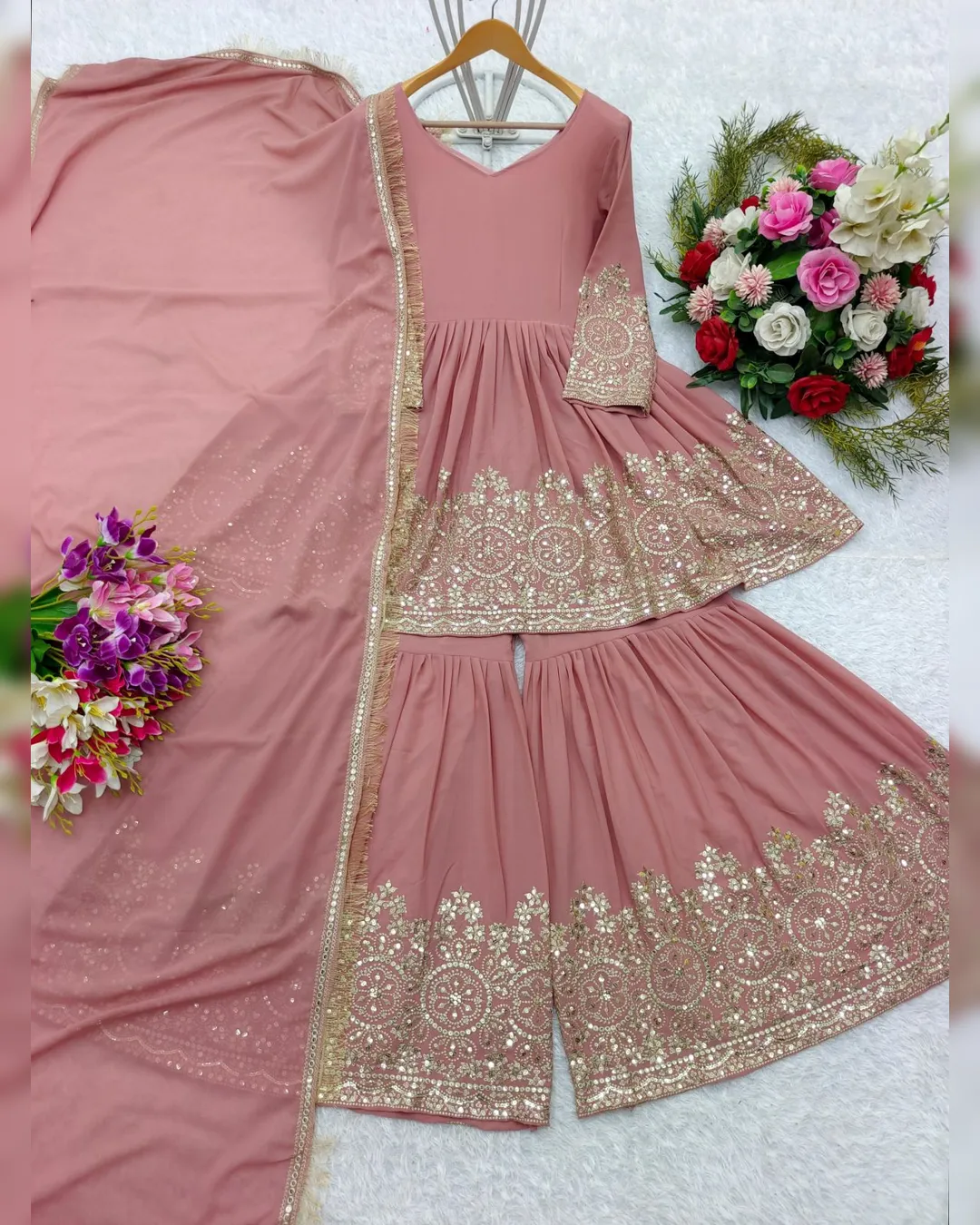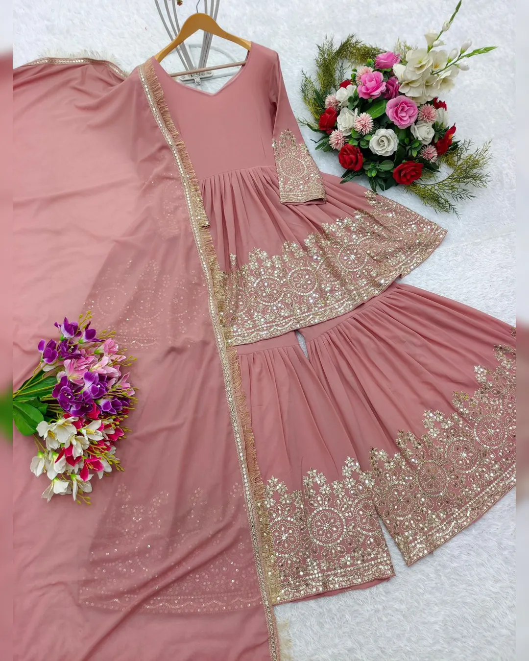 Sarara (Palazzo) is equally stunning, made from pure Fox Georgette and embellished with matching 5mm sequence embroidery. It features an