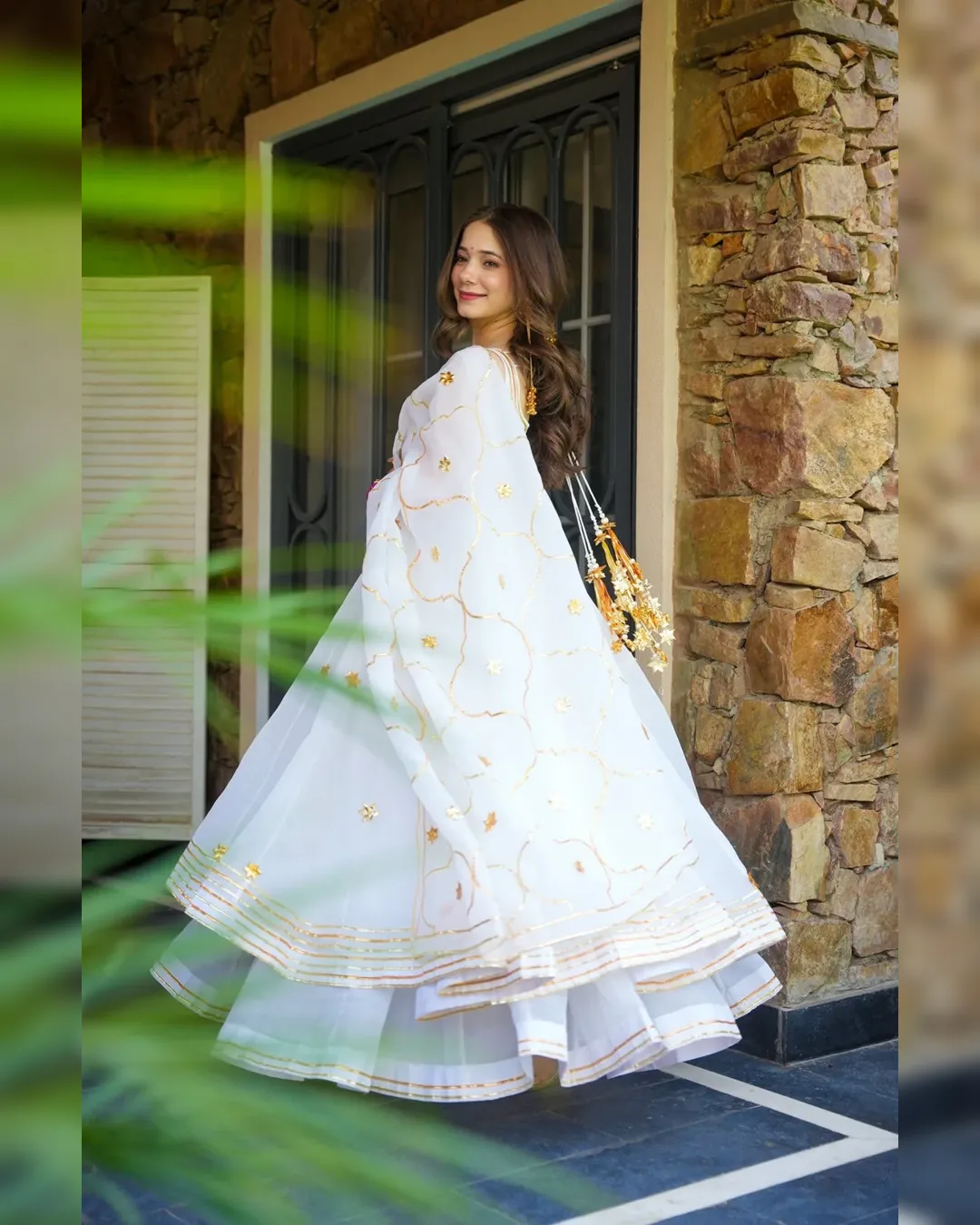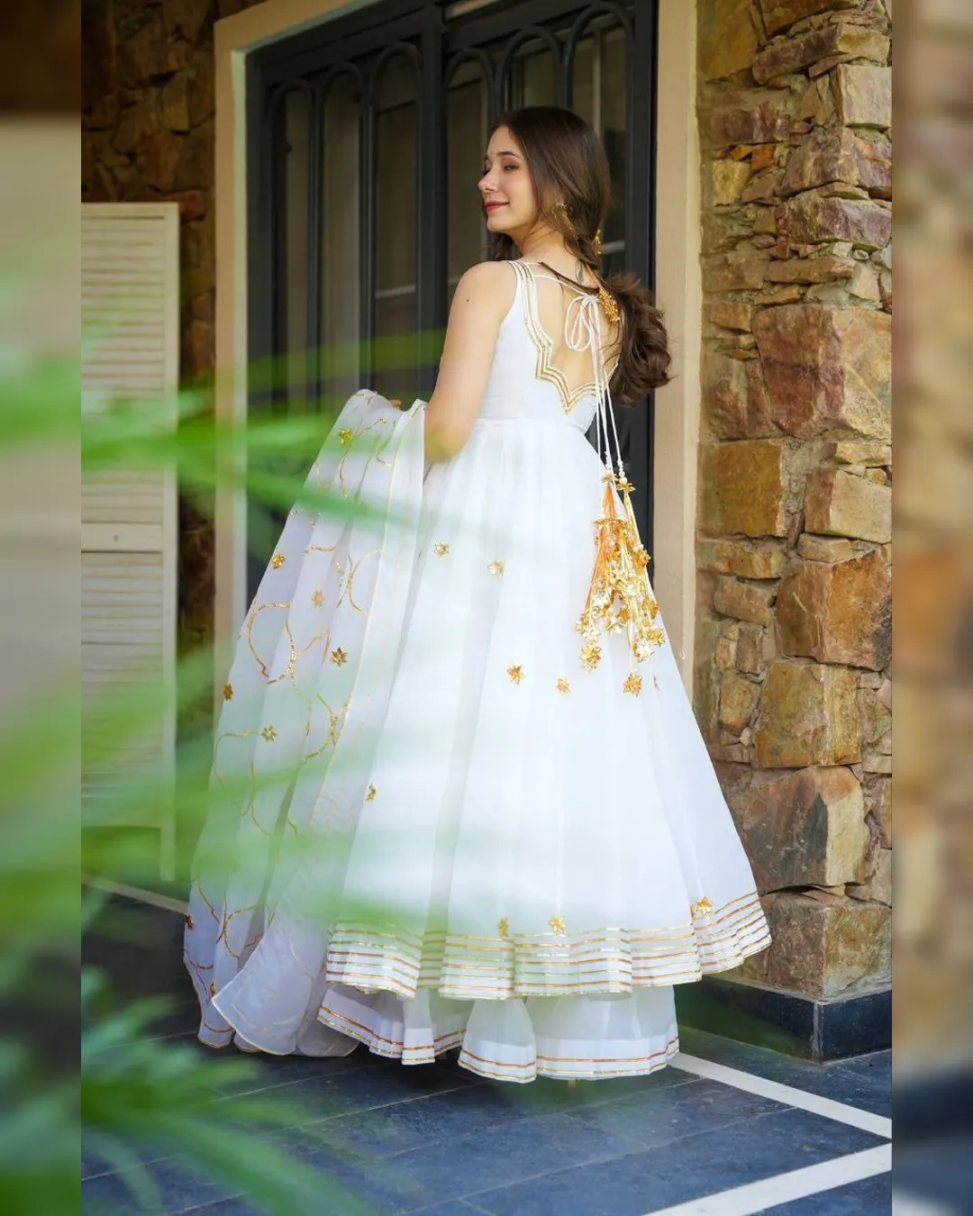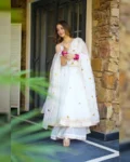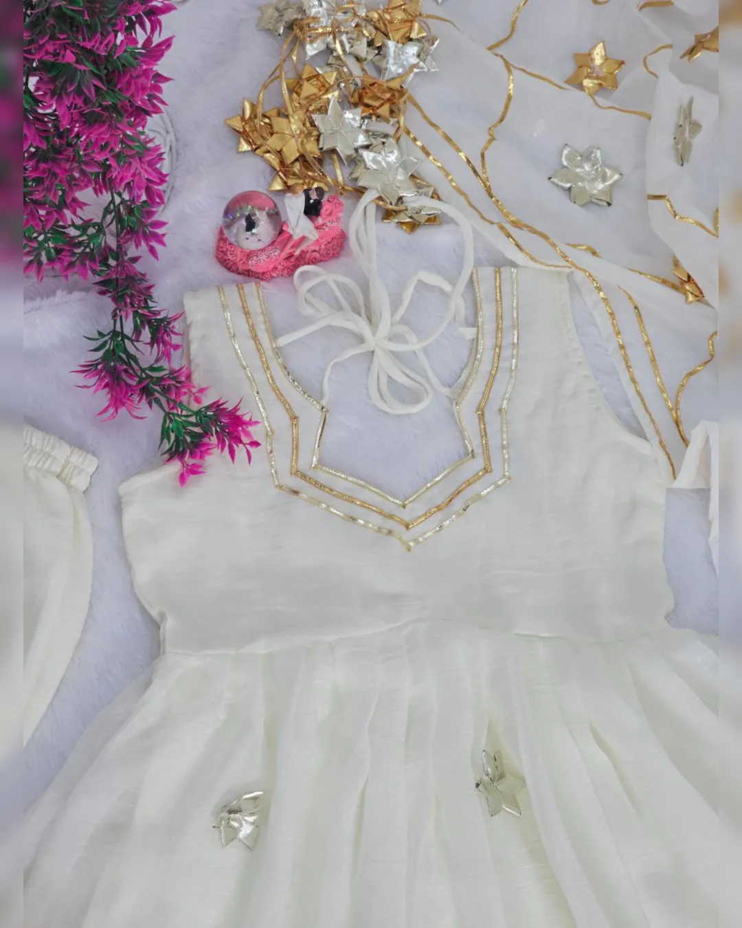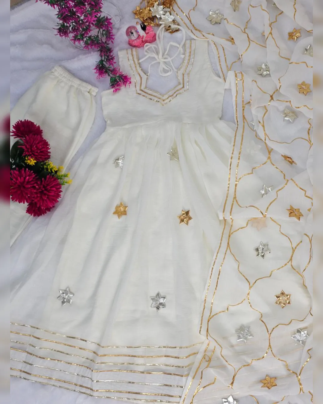 Introducing today’s new launch – a purely handmade Anarkali Plazzo Set designed to bring timeless elegance and festive charm to your wardrobe. Crafted from soft crunchy chiffon fabric, this exquisite ensemble features beautiful hand Gottapatti work enhanced with attractive gotta star heavy tussles, creating a rich and graceful look. The Anarkali comes with a high-quality cotton inner and an impressive 3.5+ meter flair for a regal flow. Paired with a fully flared plazzo with elastic waist and a matching dupatta adorned with heavy Gottapatti work, this set is perfect for weddings, festive celebrations, and special occasions.