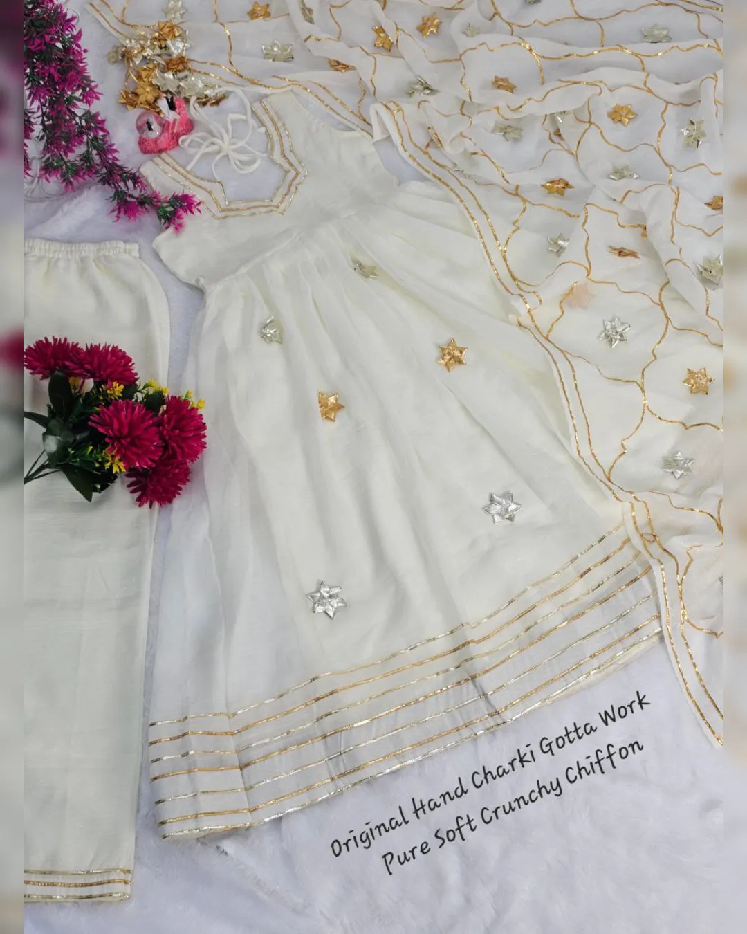 Purely handmade soft crunchy chiffon Anarkali plazzo set featuring hand Gottapatti work, 3.5+ meter flair, flared plazzo with elastic waist, and a heavily worked dupatta.