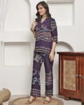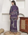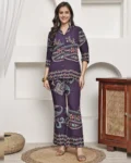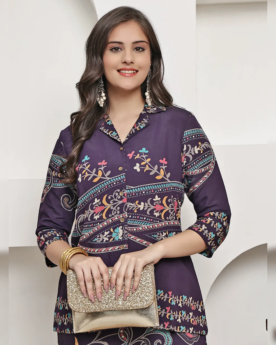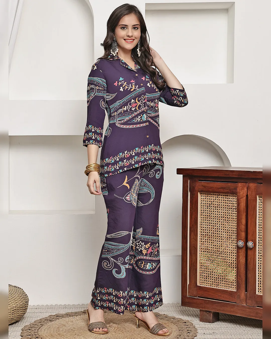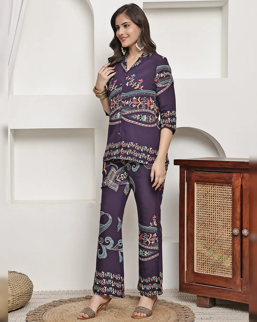 Purple abstract printed Chanderi co-ord set with a mandarin collar tunic and elasticated drawstring trousers—casual elegance made easy.