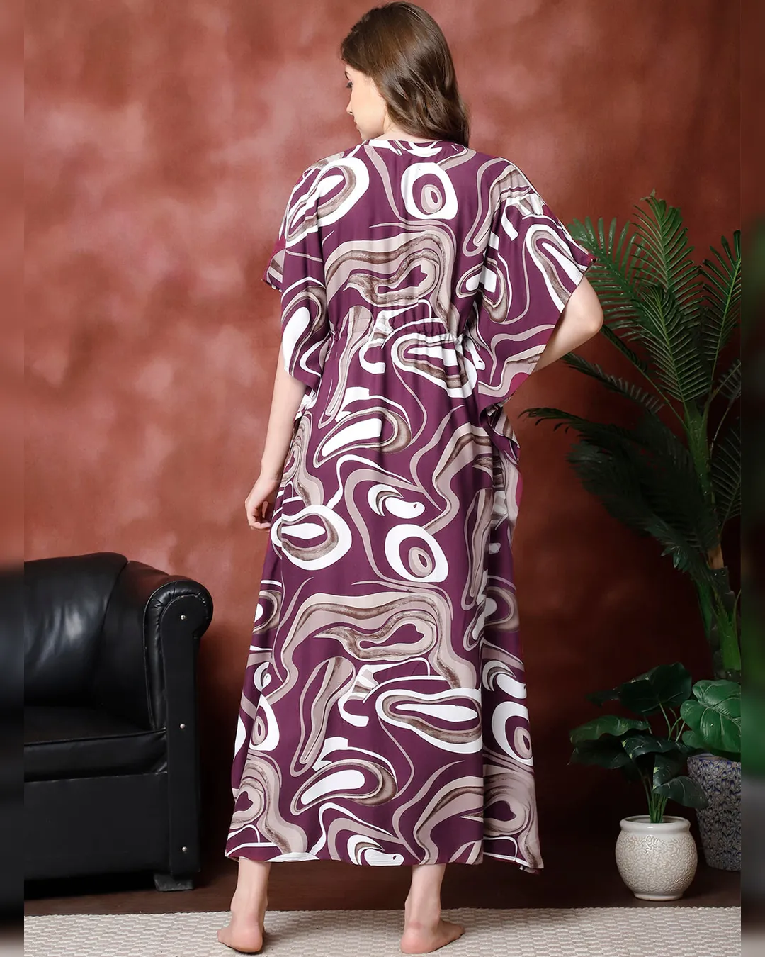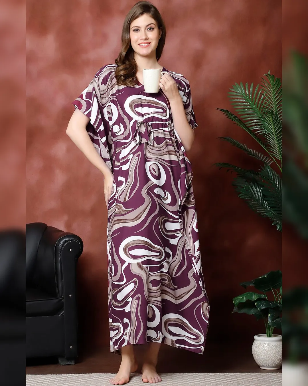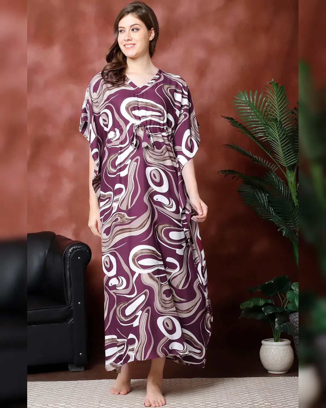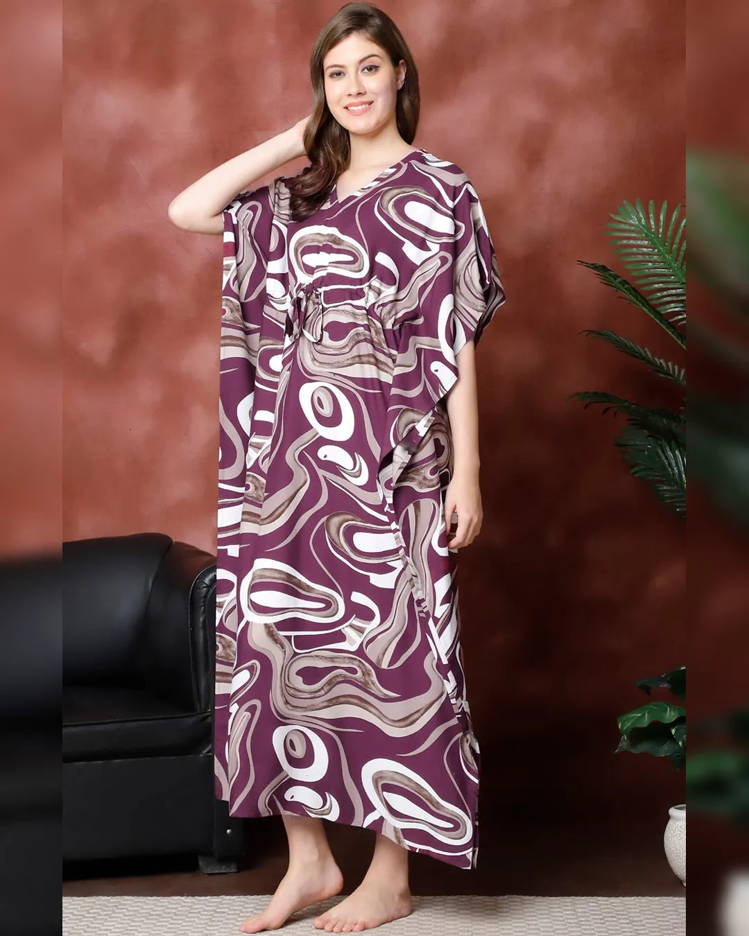 Unwind in effortless grace with the Purple Abstract Printed Viscose Rayon Kaftan, thoughtfully designed for women who seek both comfort and style in their loungewear. Crafted from luxuriously soft viscose rayon, this kaftan offers breathable ease and a feather-light feel—ideal for cozy evenings and relaxed weekends.