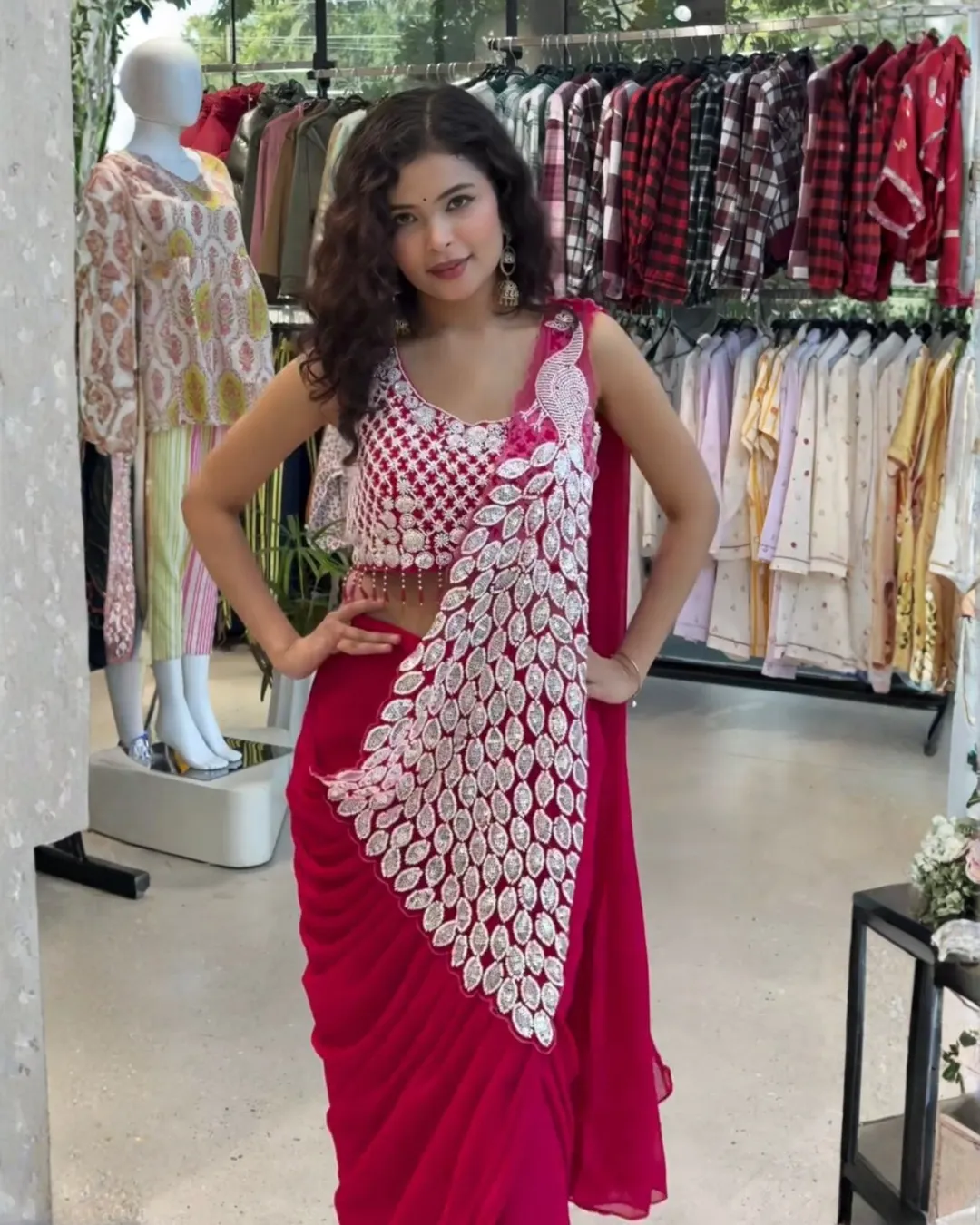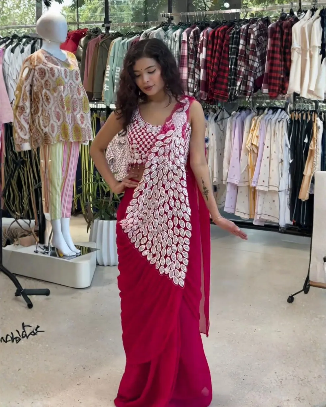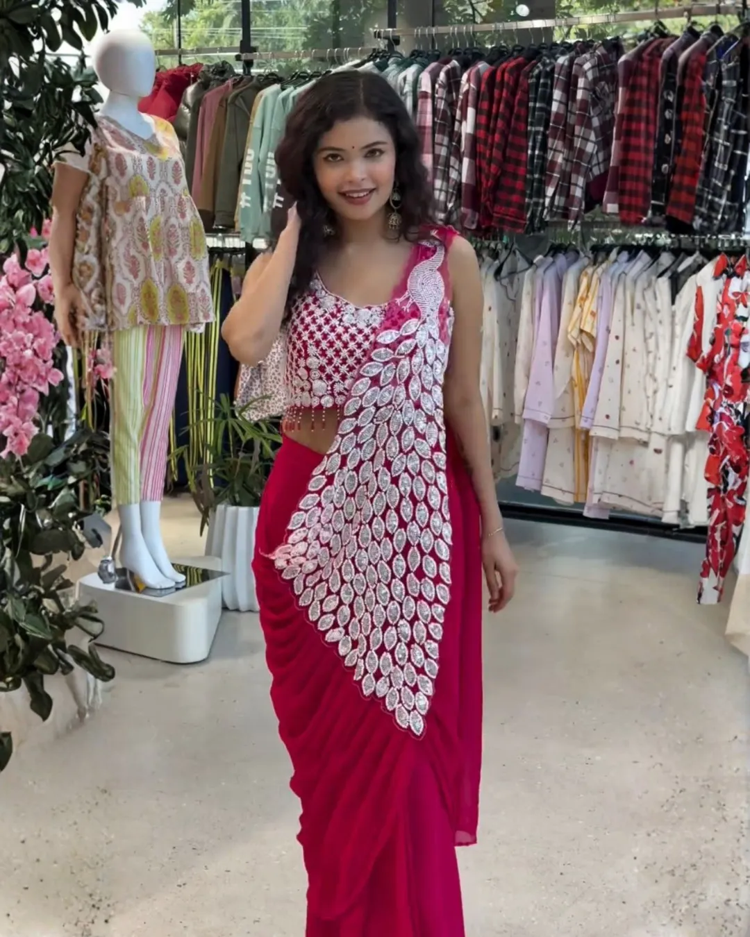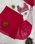 Trendy ready-to-wear drape saree crafted in faux georgette with elegant thread and sequins embroidery, paired with a fully embroidered stitched blouse for a stylish and effortless look.