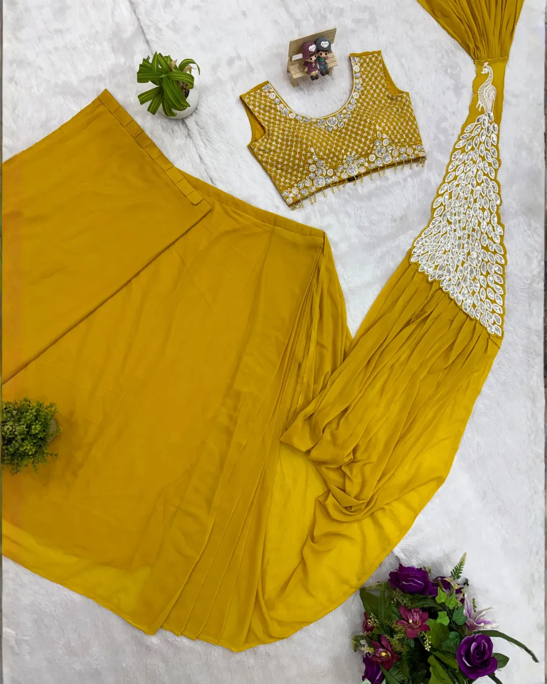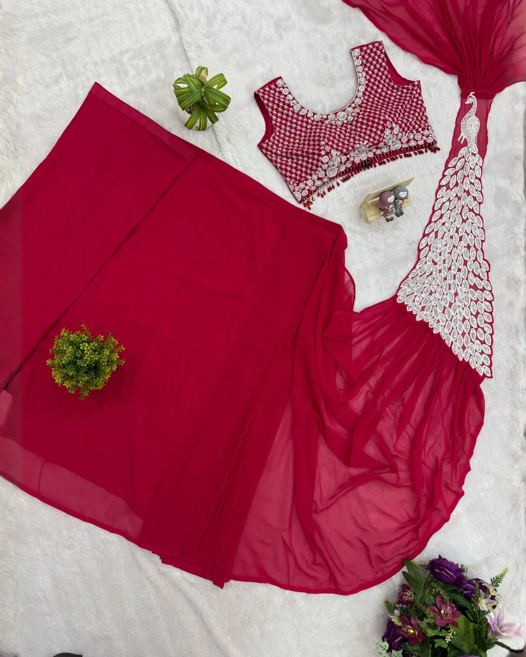 Paired with a fully embroidered faux georgette blouse, this outfit enhances the overall designer look. The blouse is fully stitched up to size 42 and includes extra sleeve fabric for customization, allowing you to tailor it according to your style preference.