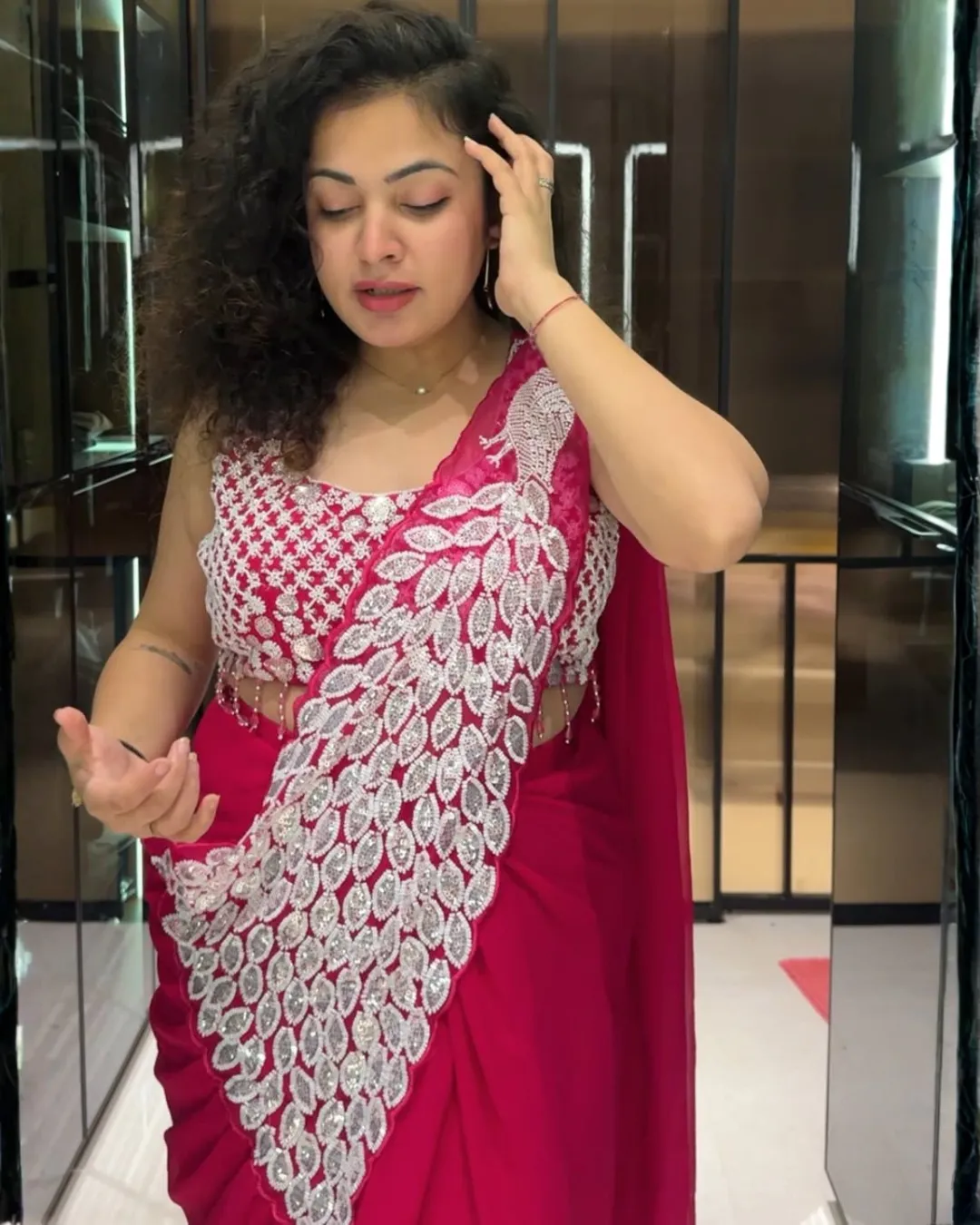 The saree features beautiful thread and sequins embroidery work, giving it a glamorous yet graceful appeal. Its ready-to-wear design makes it easy to style without the hassle of traditional draping, making it perfect for quick and stylish dressing.