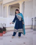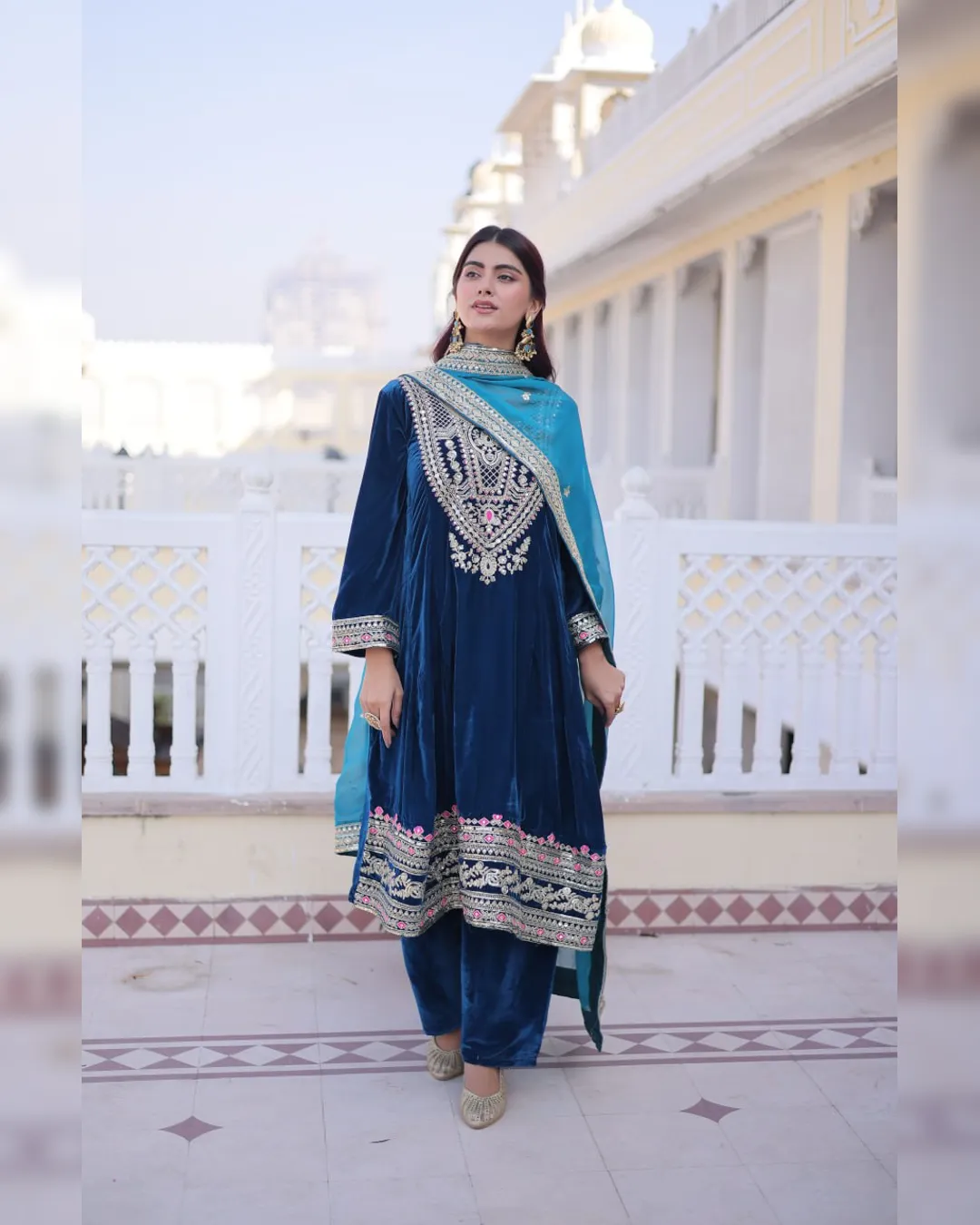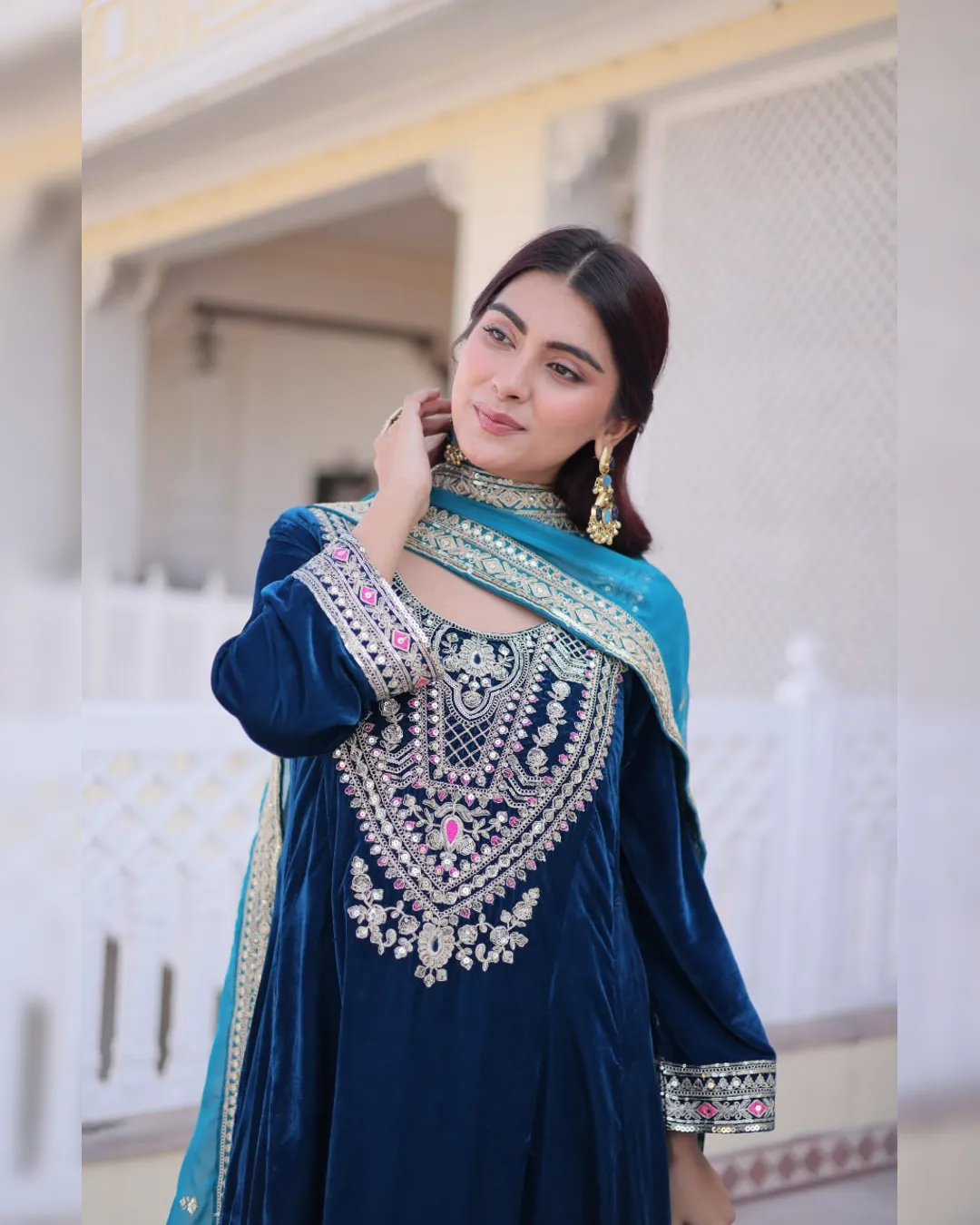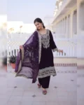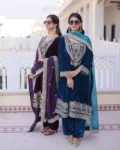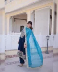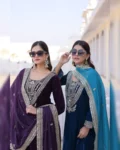 Make a grand style statement with this Readymade Velvet Top–Pant–Dupatta Set, designed for luxurious party and festive looks. Crafted from premium 9000 velvet fabric, the top is adorned with rich sequins, zari, coding, and thread embroidery work, creating an opulent and eye-catching appeal. The round neckline with mirror work pattern and full bell sleeves add a stylish designer touch. With a full cotton inner from top to bottom, this outfit ensures both comfort and elegance. The matching velvet pant with elasticated waist offers a perfect fit, while the Tebby silk dupatta with zari embroidery completes the regal look. Ideal for weddings, parties, and festive celebrations.