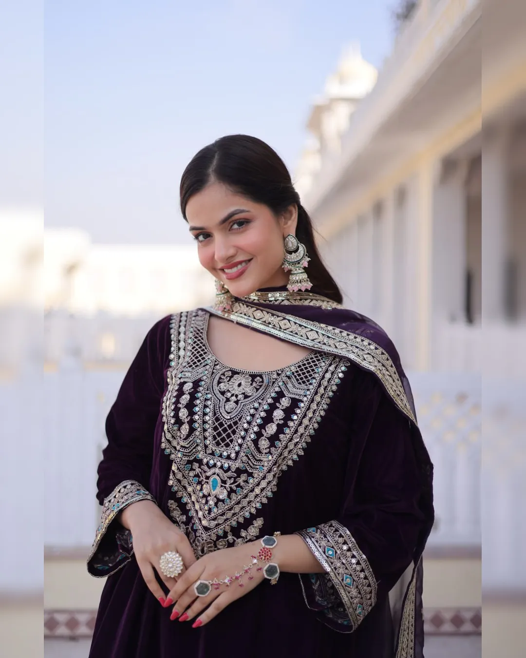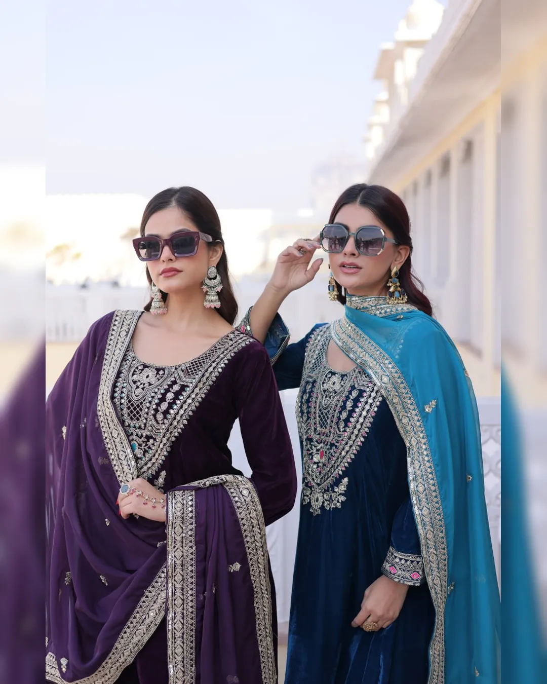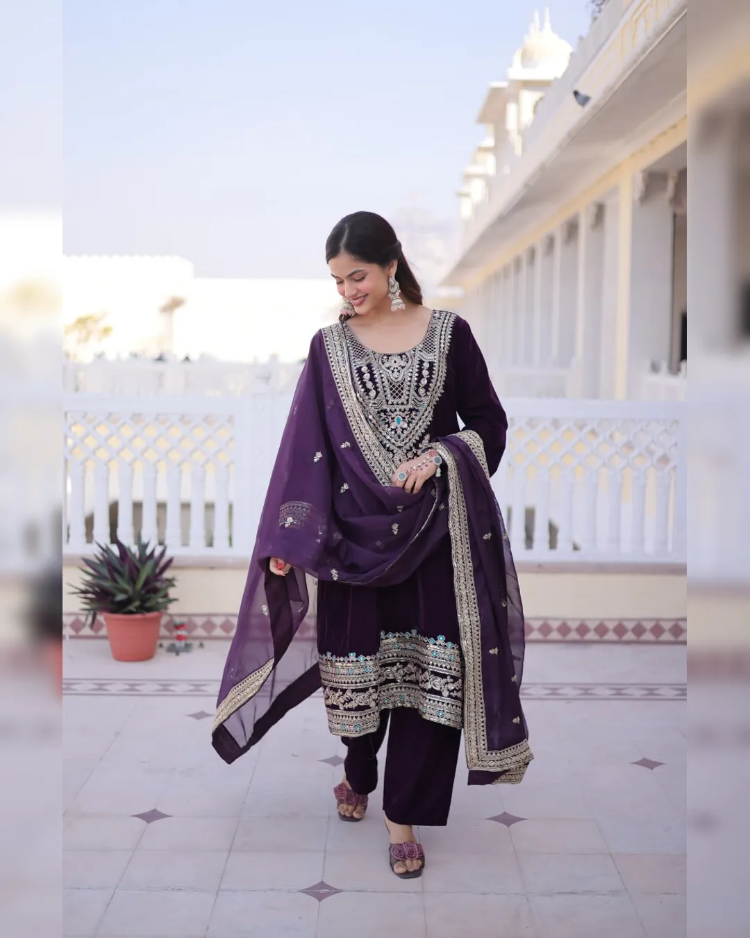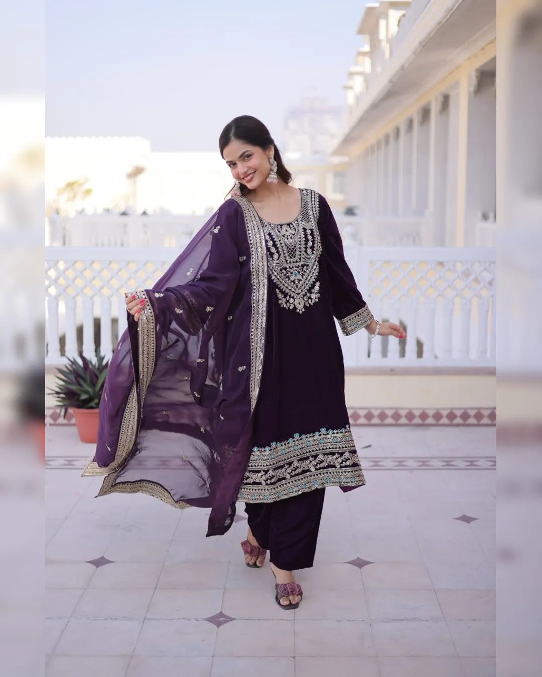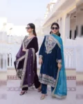 Luxury 9000 velvet fully stitched top pant dupatta set with rich sequins and zari embroidery, mirror work neckline, and Tebby silk dupatta—perfect for party and festive wear.
