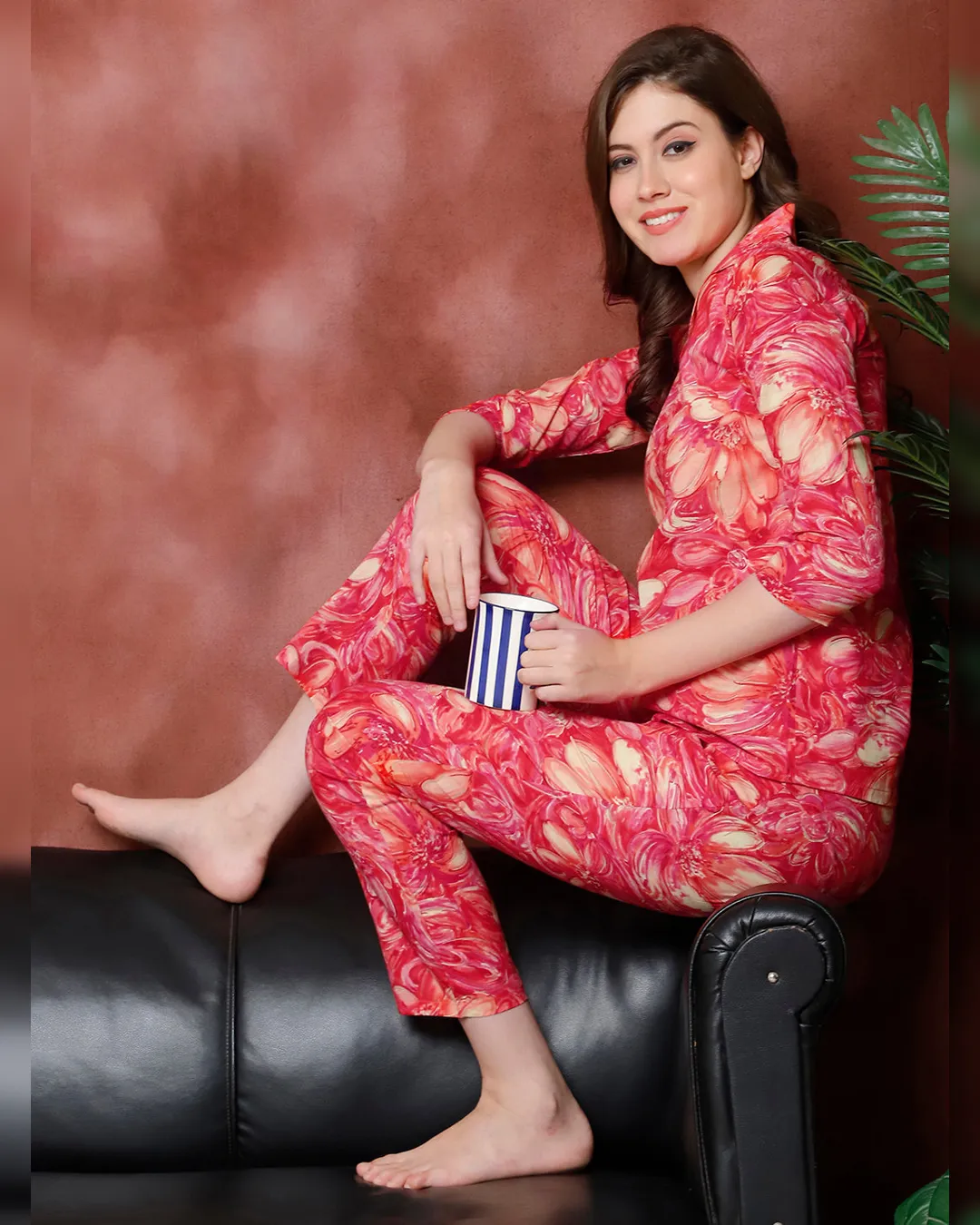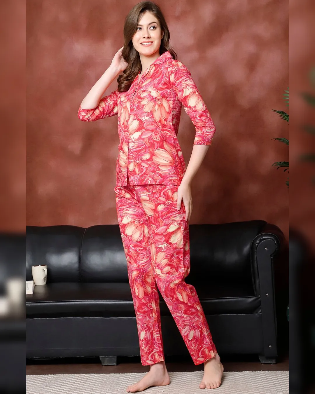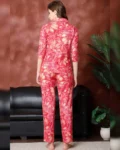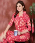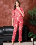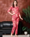 Pure cotton night suit with red floral print, mandarin collar, 3/4 sleeves, and relaxed-fit pyjama bottoms—crafted for all-day comfort and elegance.