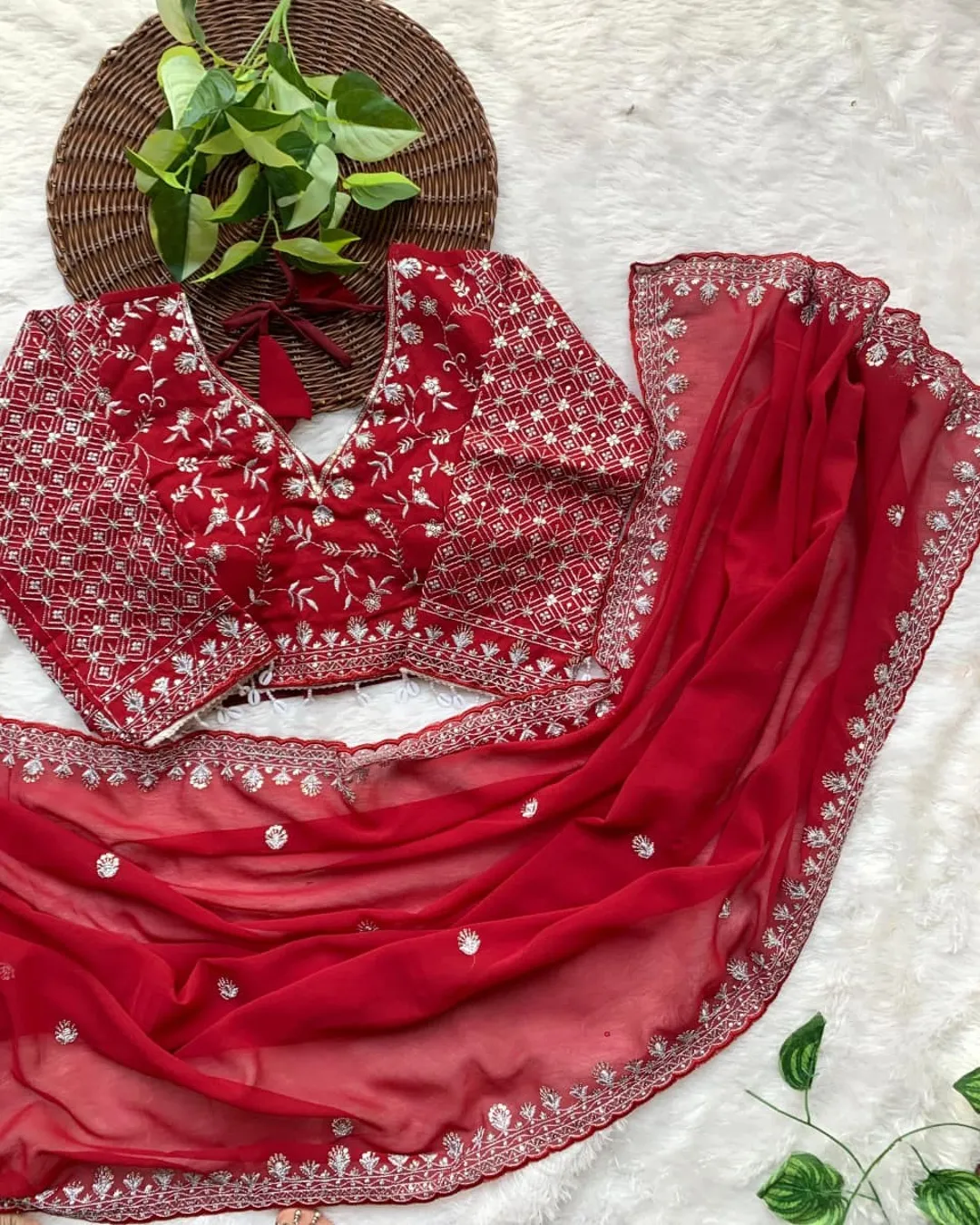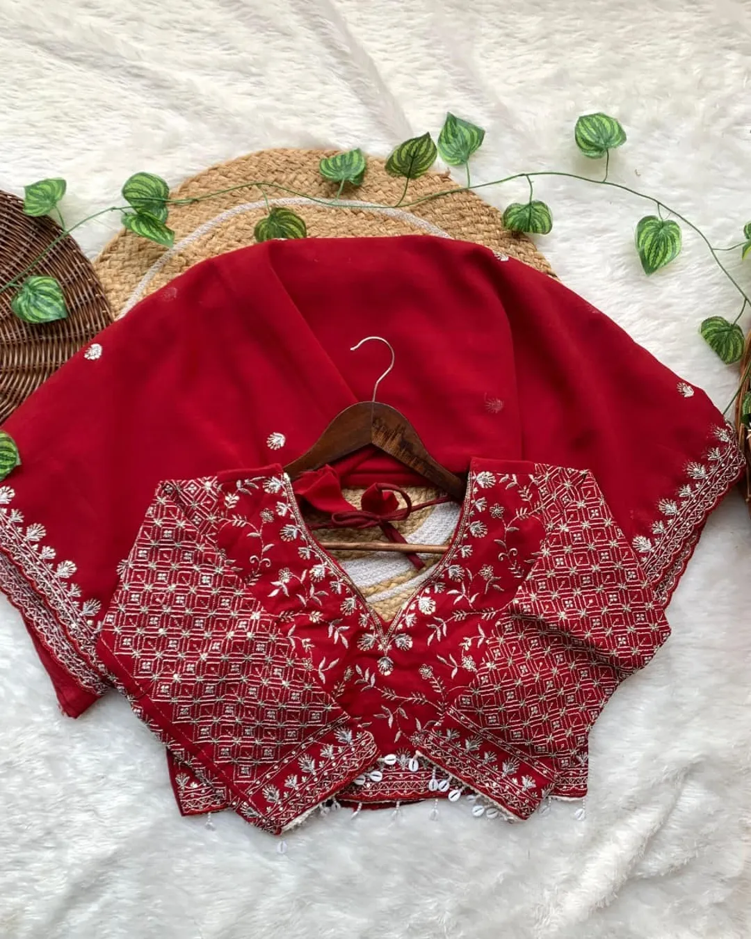 Elegant georgette saree featuring beautiful 3mm sequins embroidery with heavy border and all-over buttis, paired with a fully stitched embroidered full-sleeve blouse for a complete designer look.