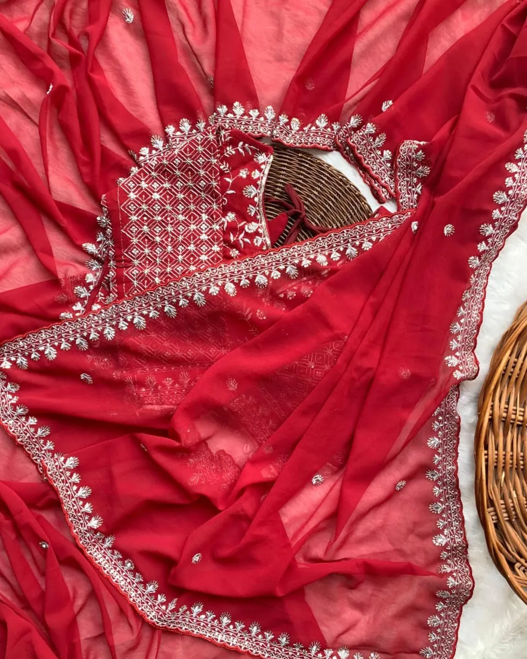 Step into elegance with this fresh new arrival georgette saree, designed to give you a rich and graceful appearance. Crafted from soft and flowy georgette fabric, this saree offers a lightweight feel with a luxurious drape.