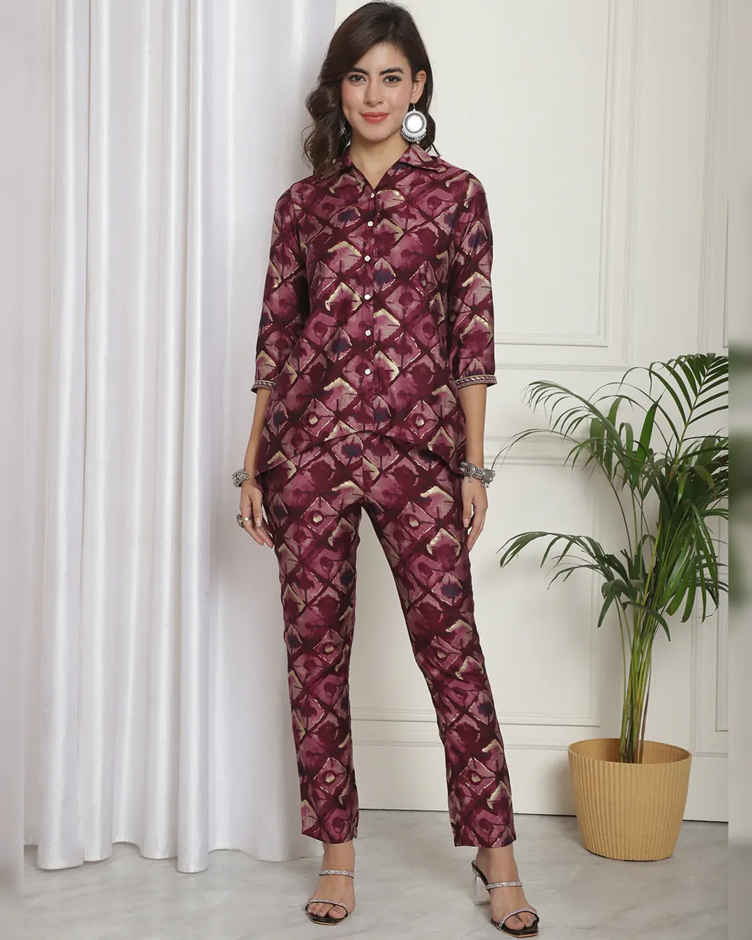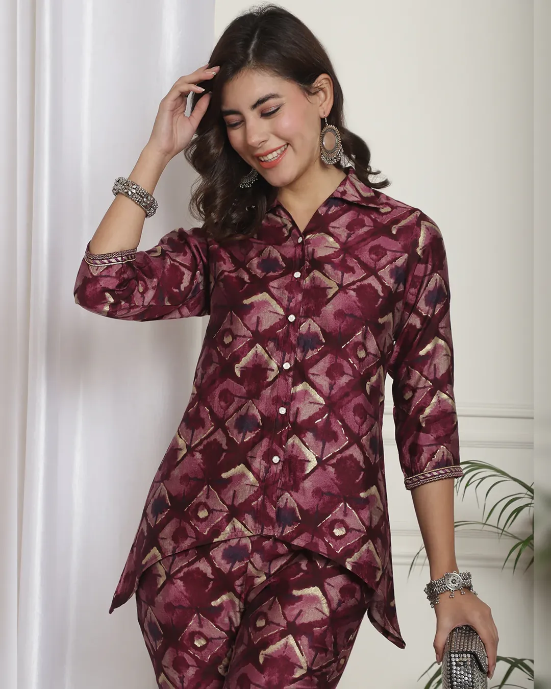 Elevate your ethnic attire with our Royal Orchid Ensemble, a captivating co-ord set designed to exude elegance and grace. Crafted from luxurious Chanderi Silk, this set features a Purple Printed Tunic paired with matching mid-rise Trousers, perfect for any ethnic occasion. The tunic showcases a refined Shirt Collar, Three-Quarter Sleeves, and a full placket button closure, offering a sophisticated silhouette. Complementing the tunic, the trousers feature a slip-on closure and a flattering flared hem, ensuring both style and comfort. Adorned with an abstract print, this ensemble emanates regal charm and timeless beauty. Whether you're attending a festive celebration or a cultural event, the Royal Orchid Ensemble will ensure you stand out with grace and poise.