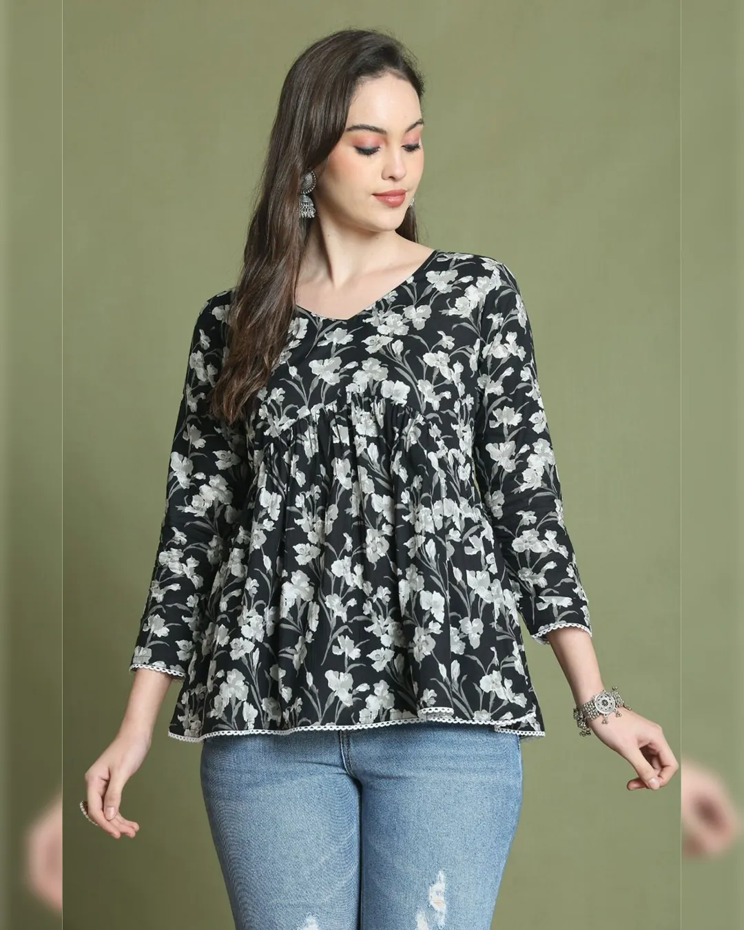 Slim-fit cotton short kurti with delicate thread work—ideal with jeans for a smart, effortless look.