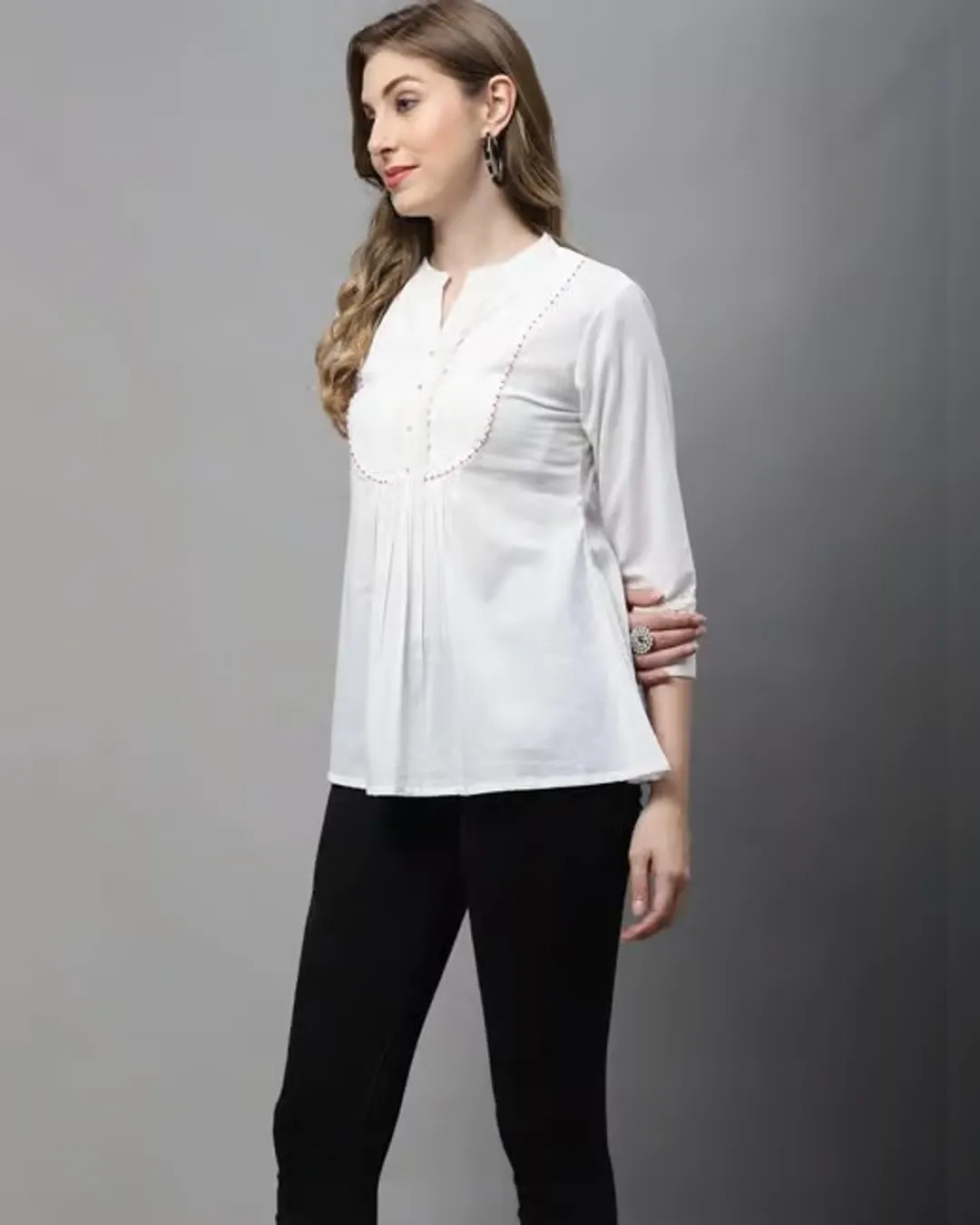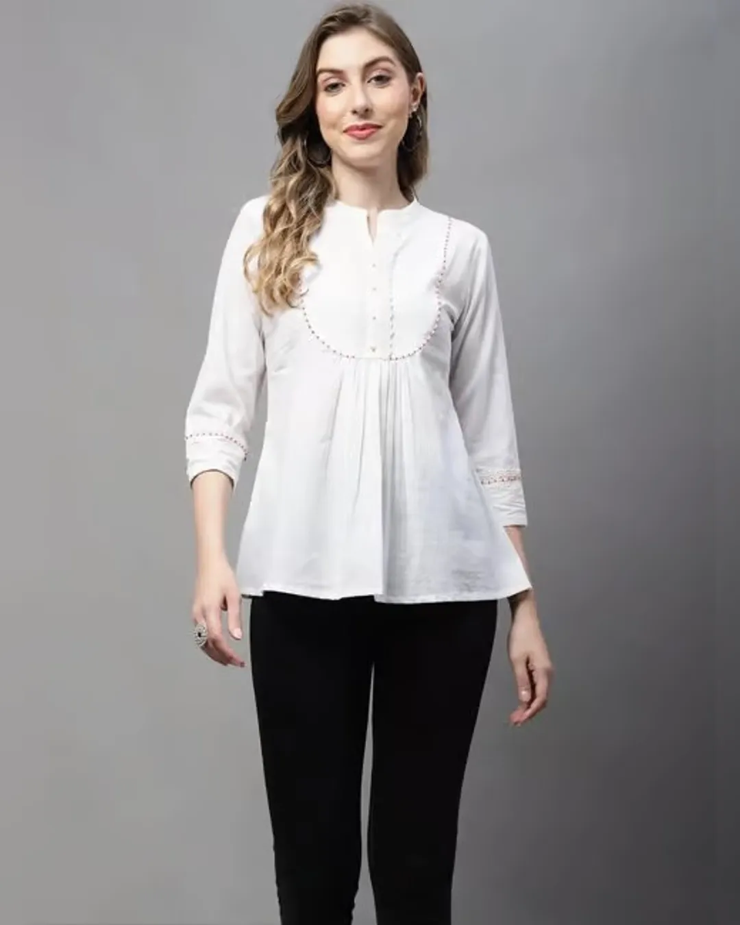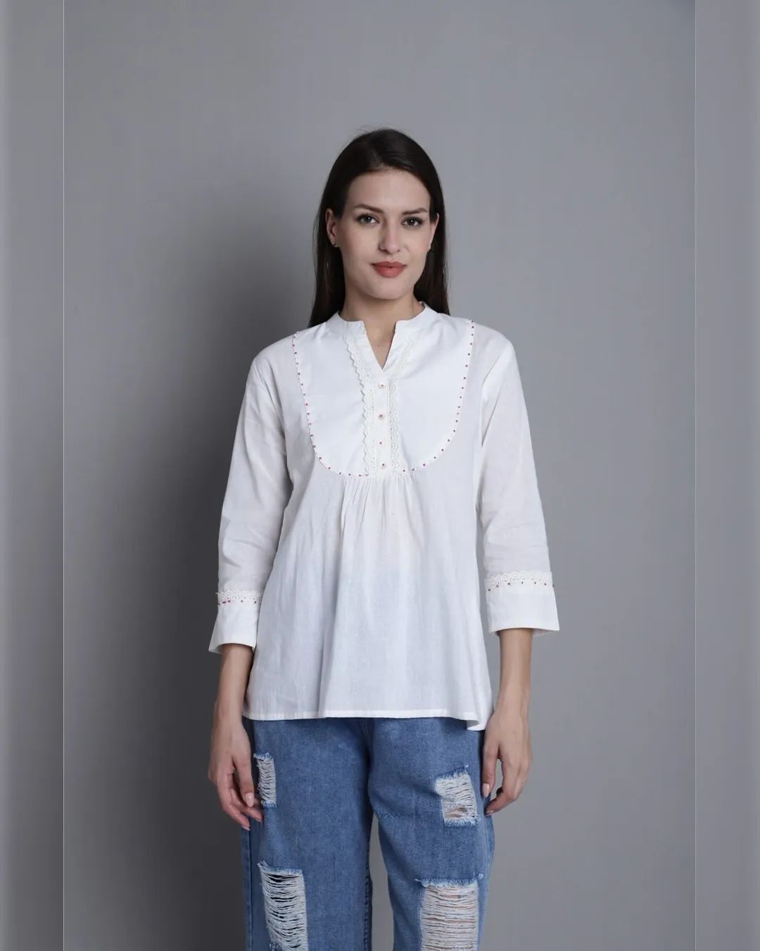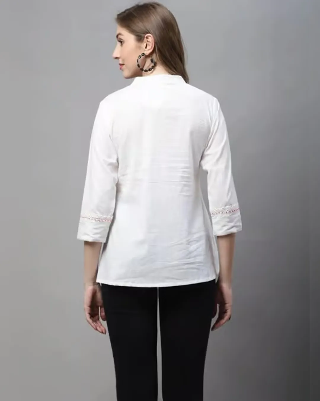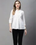 Slim-fit cotton short kurti with delicate thread work—ideal with jeans for a smart, effortless look.