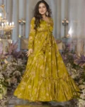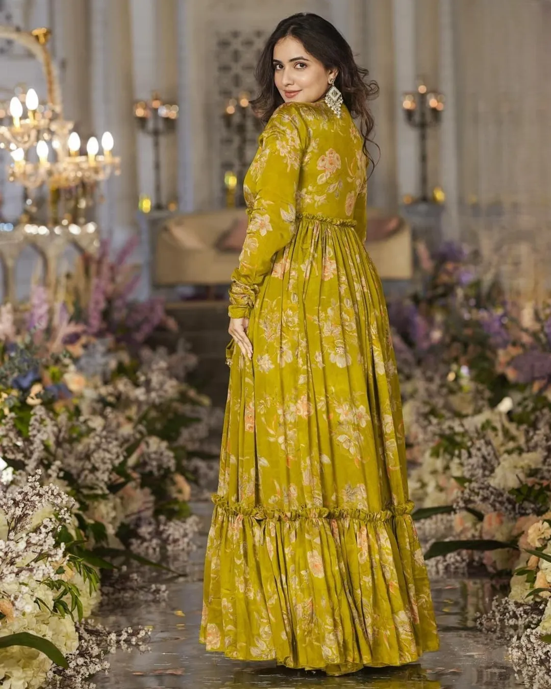 Make a bold fashion statement with this stunning 3-piece Koti-style Indo-western suit, designed to capture the essence of contemporary fashion fused with traditional charm. This set includes a printed crop top, layered sharara, and a long shrug that completes the look. Crafted in heavy Airtex Chinon fabric with intricate digital print, the outfit offers comfort and style for special occasions like weddings, festivals, and parties. The crop top features a perfect fitted design with a side zip, while the sharara comes with full elastic for a snug fit and layered panels for a dramatic look. The shrug has an impressive 5-meter flair and is adorned with a latkan, enhancing the overall elegance. Available in sizes XS to 6XL, this ensemble provides a flattering fit for all body types, making it a versatile addition to your wardrobe. Product Details: