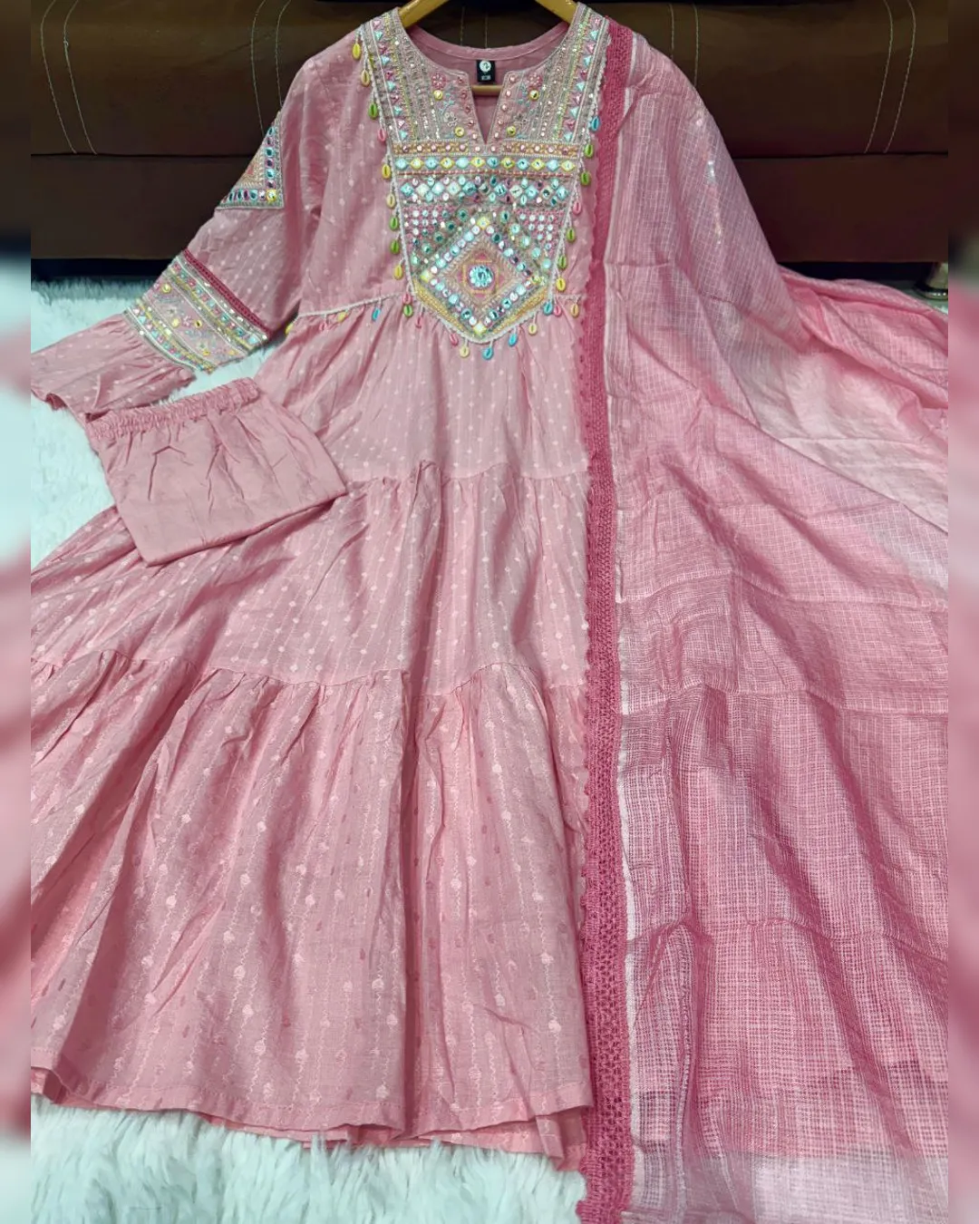 Refresh your ethnic wardrobe with this Flex Buti Cotton Kurta-Pant-Dupatta Set, designed for everyday elegance and all-day comfort. Crafted from breathable Flex Buti Cotton, this outfit features subtle embroidery work that adds a touch of grace without compromising comfort. The Cota Chex dupatta brings a light and airy finish, making this set ideal for casual gatherings, office wear, and festive daytime events.