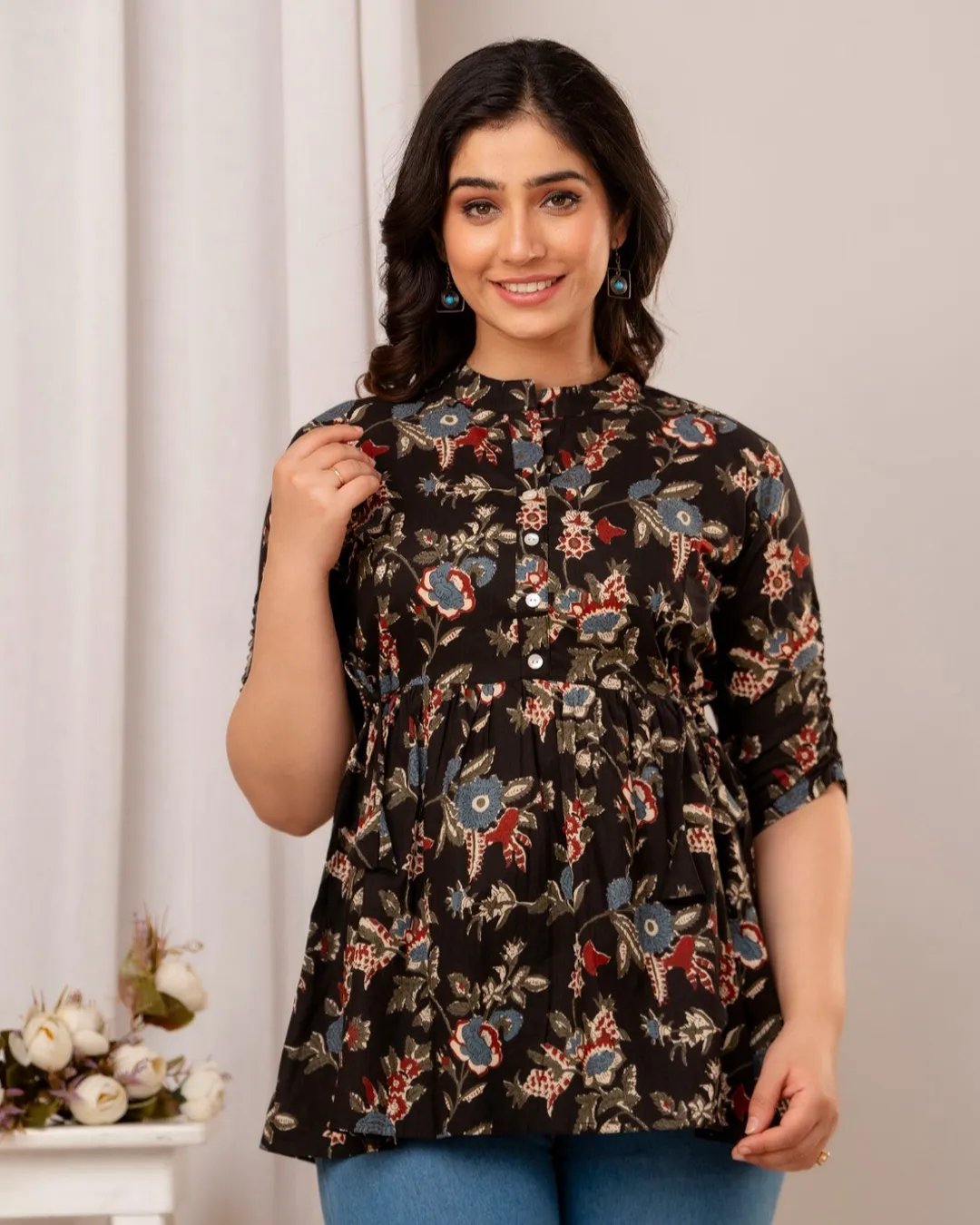 Trendy summer tops and short kurtis in soft cotton fabric, featuring stylish wooden button detailing for a chic casual look.