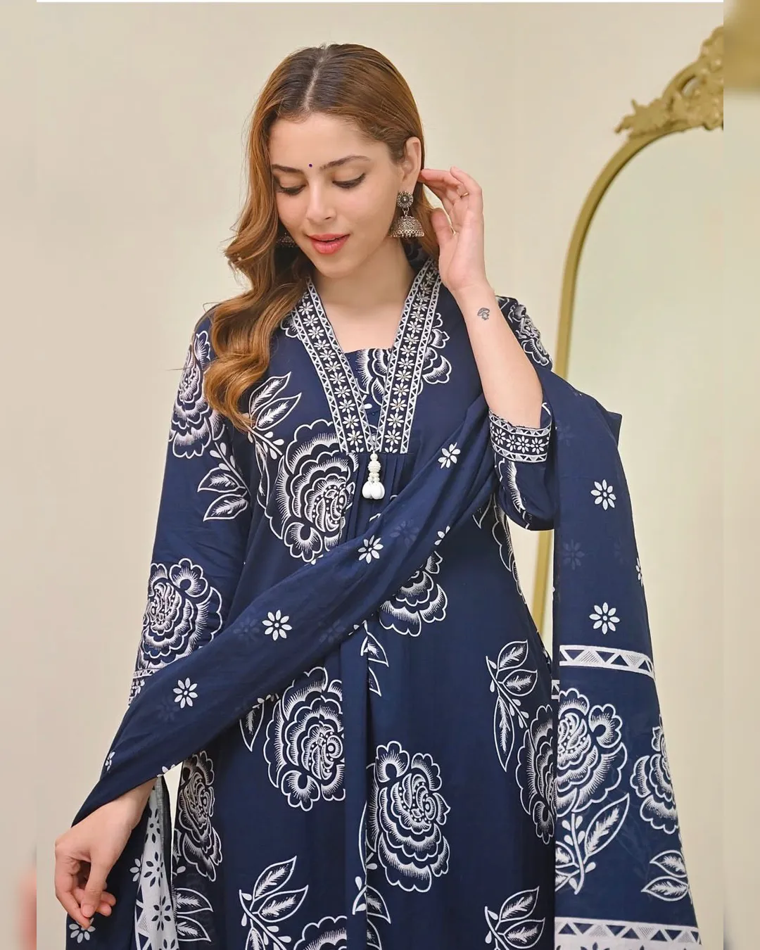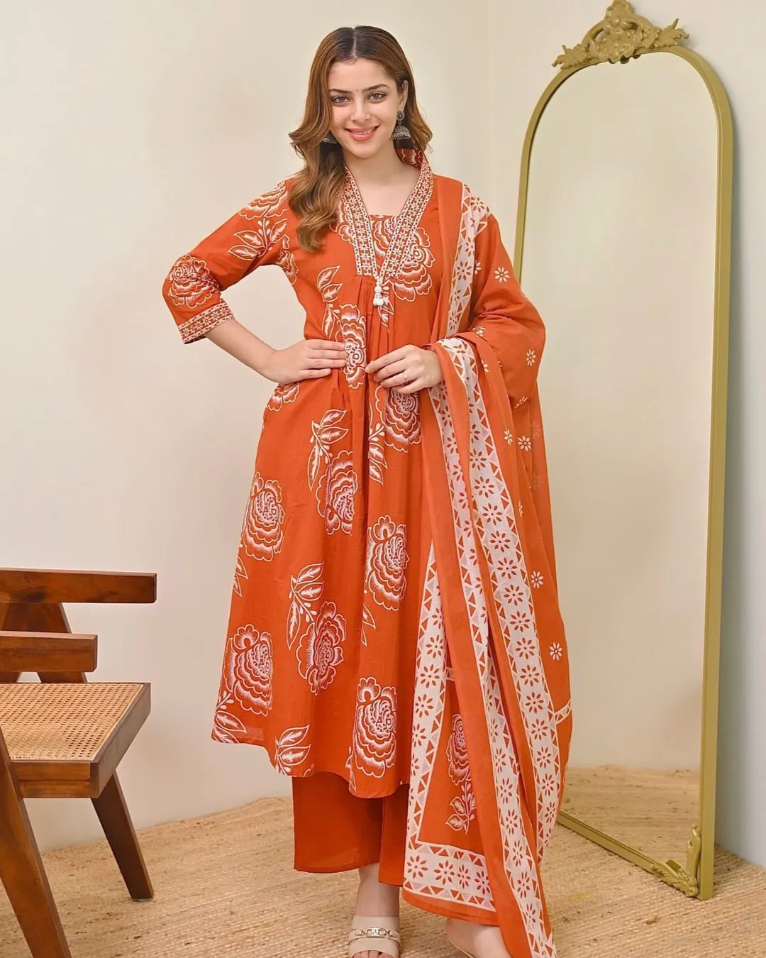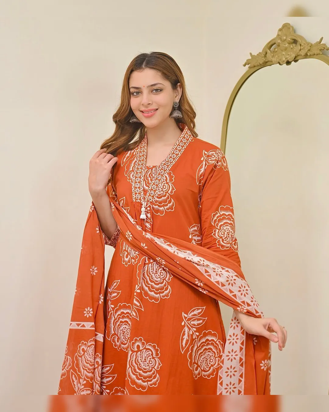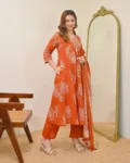 Elegant Cotton 60x60 A-line kurti with pant and dupatta set featuring yoke detailing—perfect for daily wear and festive occasions.