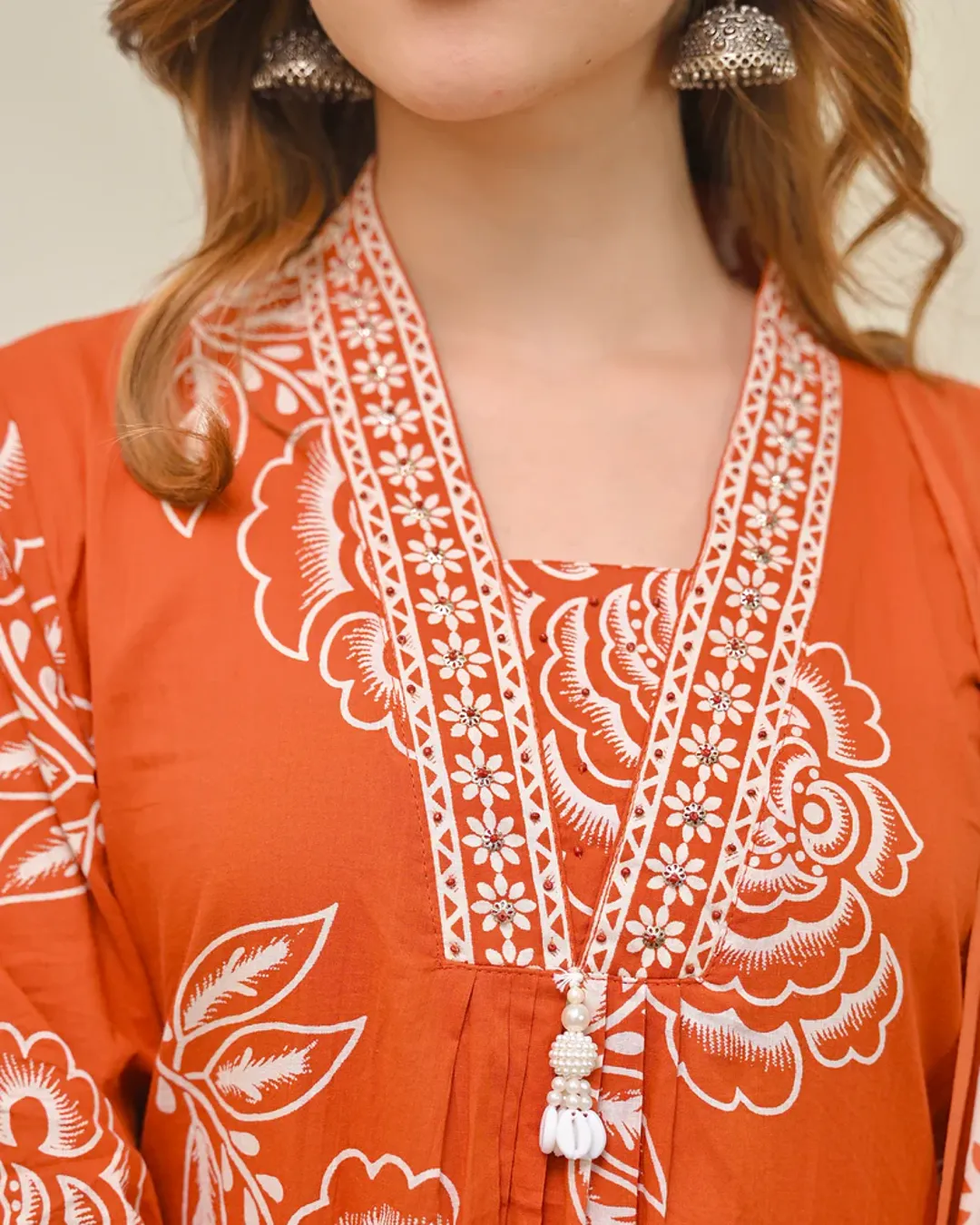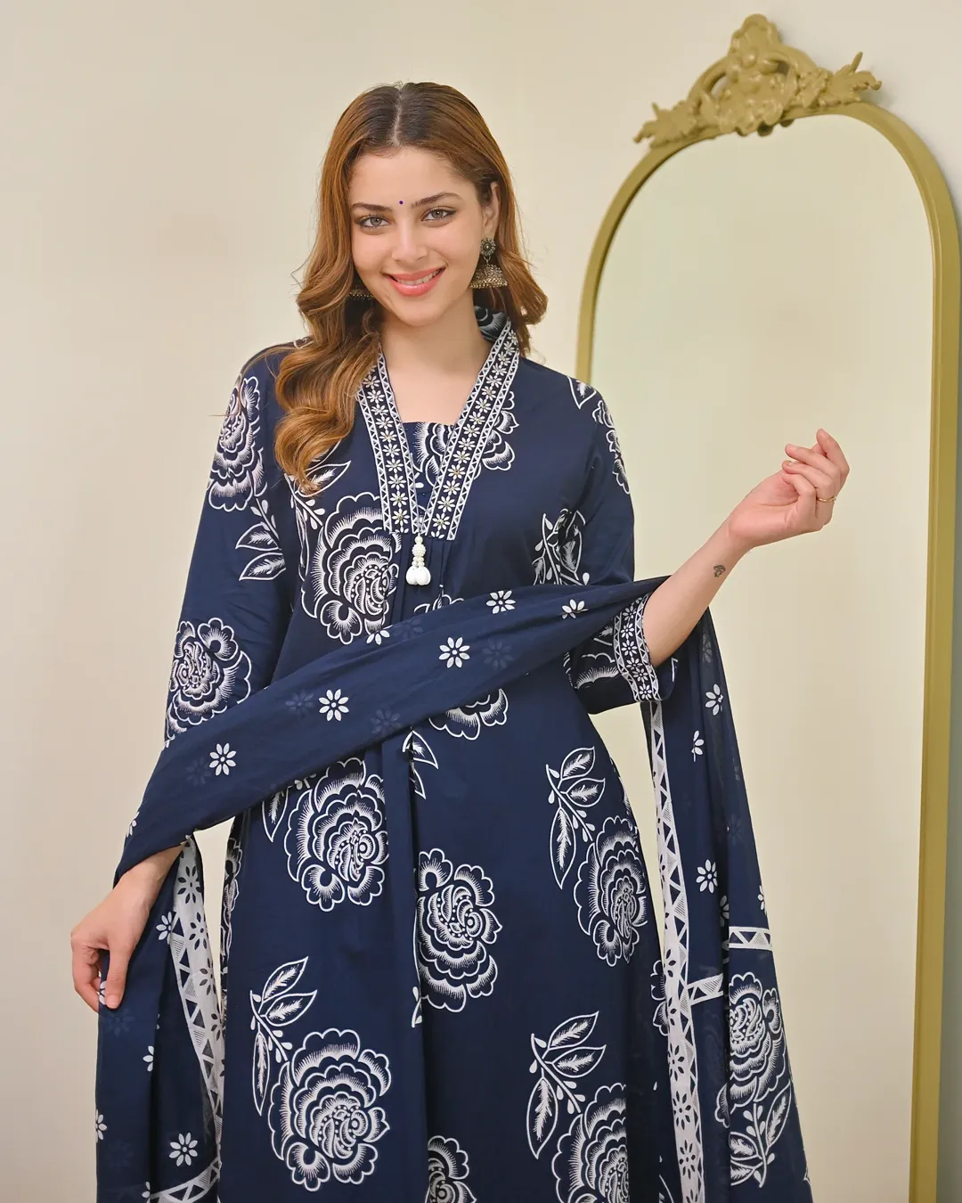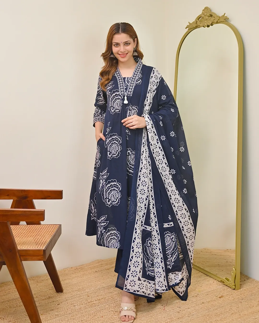 Elegant Cotton 60x60 A-line kurti with pant and dupatta set featuring yoke detailing—perfect for daily wear and festive occasions.