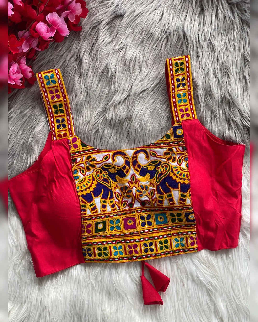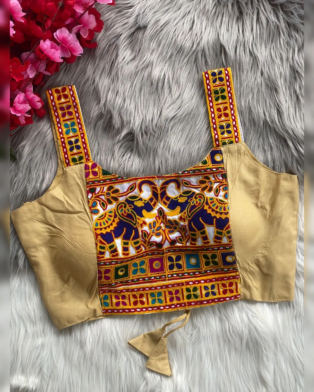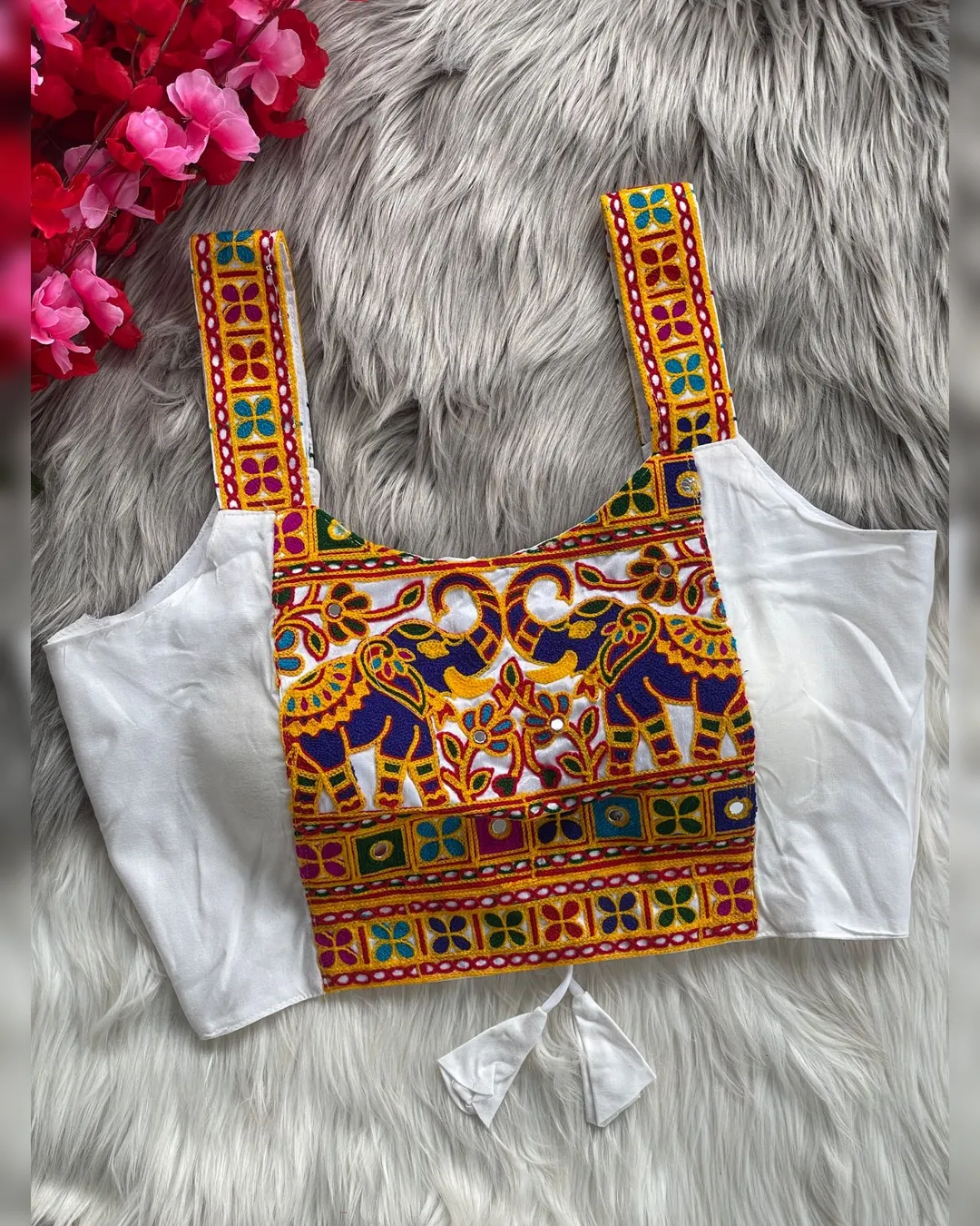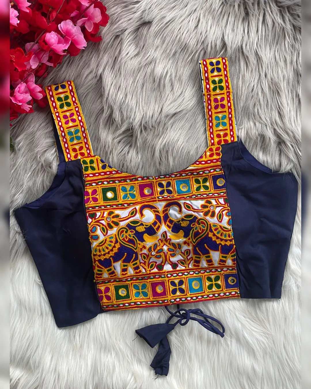Celebrate this Navratri in true traditional style with our halter neck sleeveless blouse, specially crafted for the festive season. Made from premium heavy Magic Cotton, this designer blouse features intricate embroidery work that reflects the essence of ethnic craftsmanship.