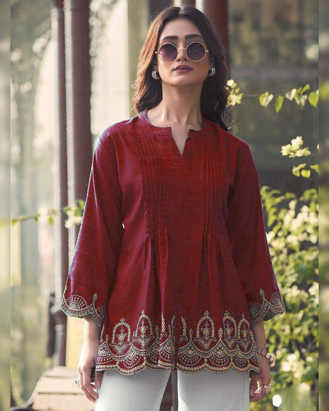 Step up your casual and festive wardrobe with this stylish short-length Kurti, crafted from heavy rayon slub fabric. Adorned with intricate embroidery and elegant cut work, this Kurti brings together comfort and modern ethnic flair. Its 34-inch length makes it perfect for pairing with jeans, palazzos, or straight pants—ideal for college, office wear, or casual outings.