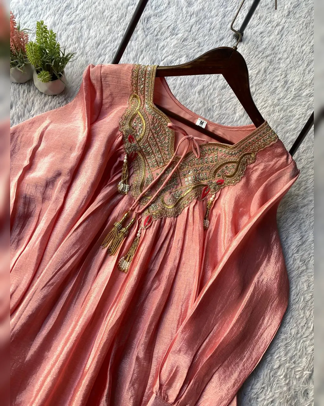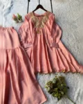 Make a stylish statement this wedding season with our Trendy 2-Piece Kurti Sharara Set, designed to bring together elegance and comfort. Crafted in pure chinon fabric, this outfit features beautiful sequin embroidery work, tassels on the yoke border, and delicate coin lace detailing, giving it a festive and fashionable appeal.