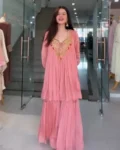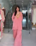 The kurti comes with a micro inner lining for added comfort and a flattering fall, while the fully stitched chinon sharara offers effortless grace and flow. Perfect for weddings, sangeet nights, festive gatherings, and party celebrations — this ensemble ensures you stand out with charm and confidence.