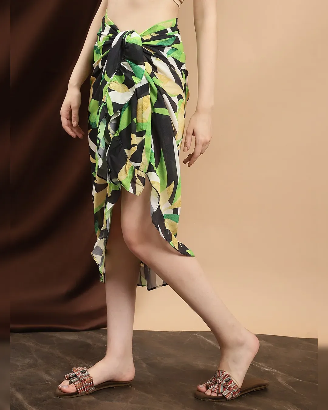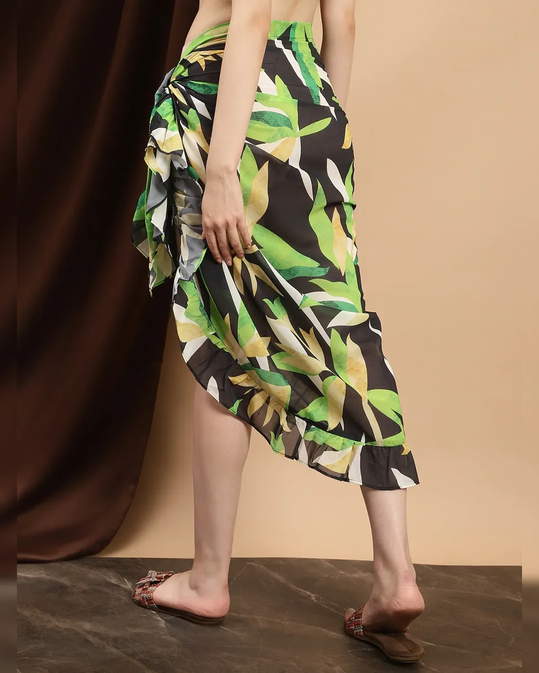 Step into paradise with our Tropical Tranquility Wrap-Around Sarong. Crafted from lightweight georgette fabric, this ankle-length sarong features a vibrant tropical print, perfect for casual beach outings.
