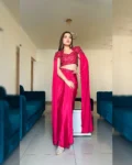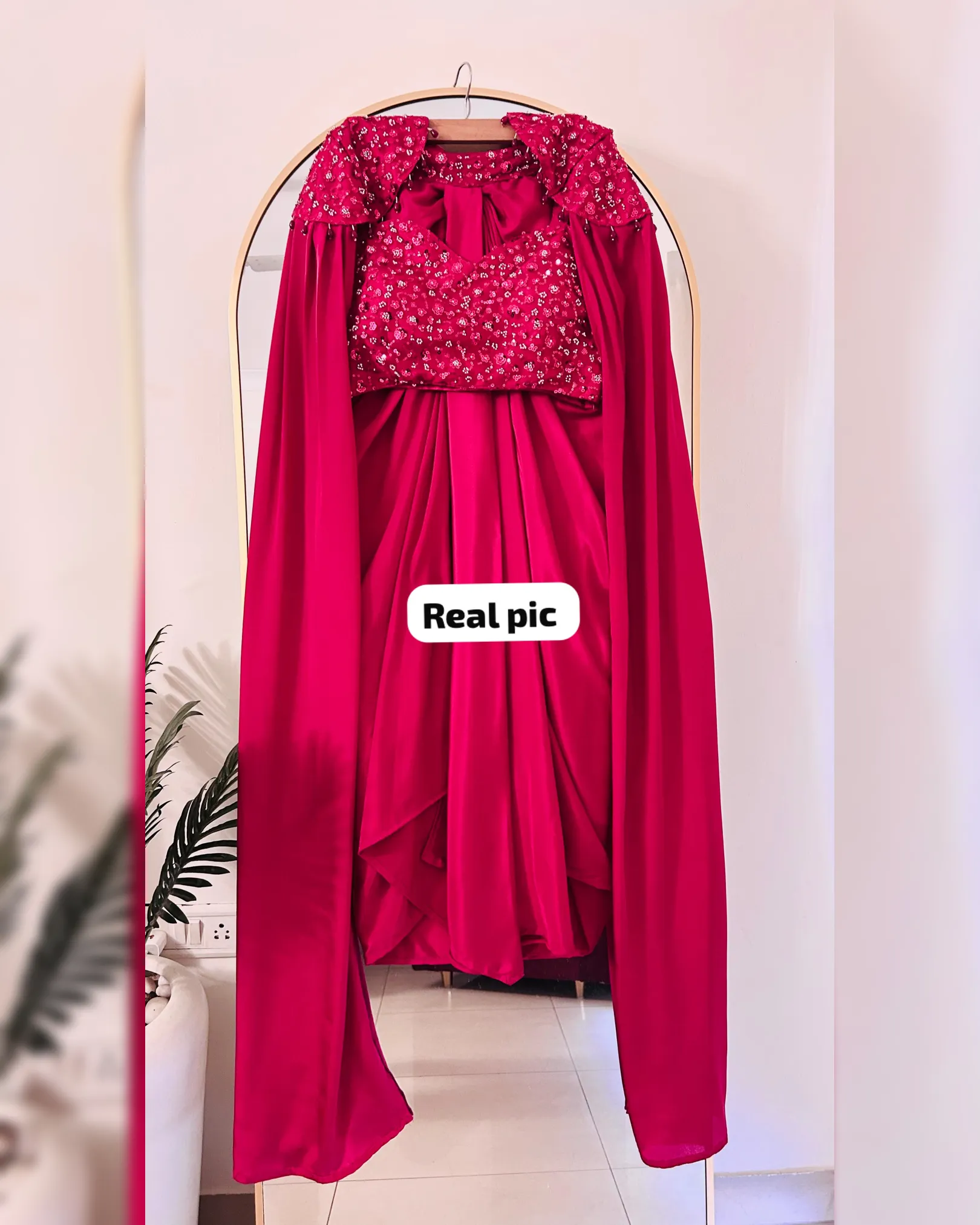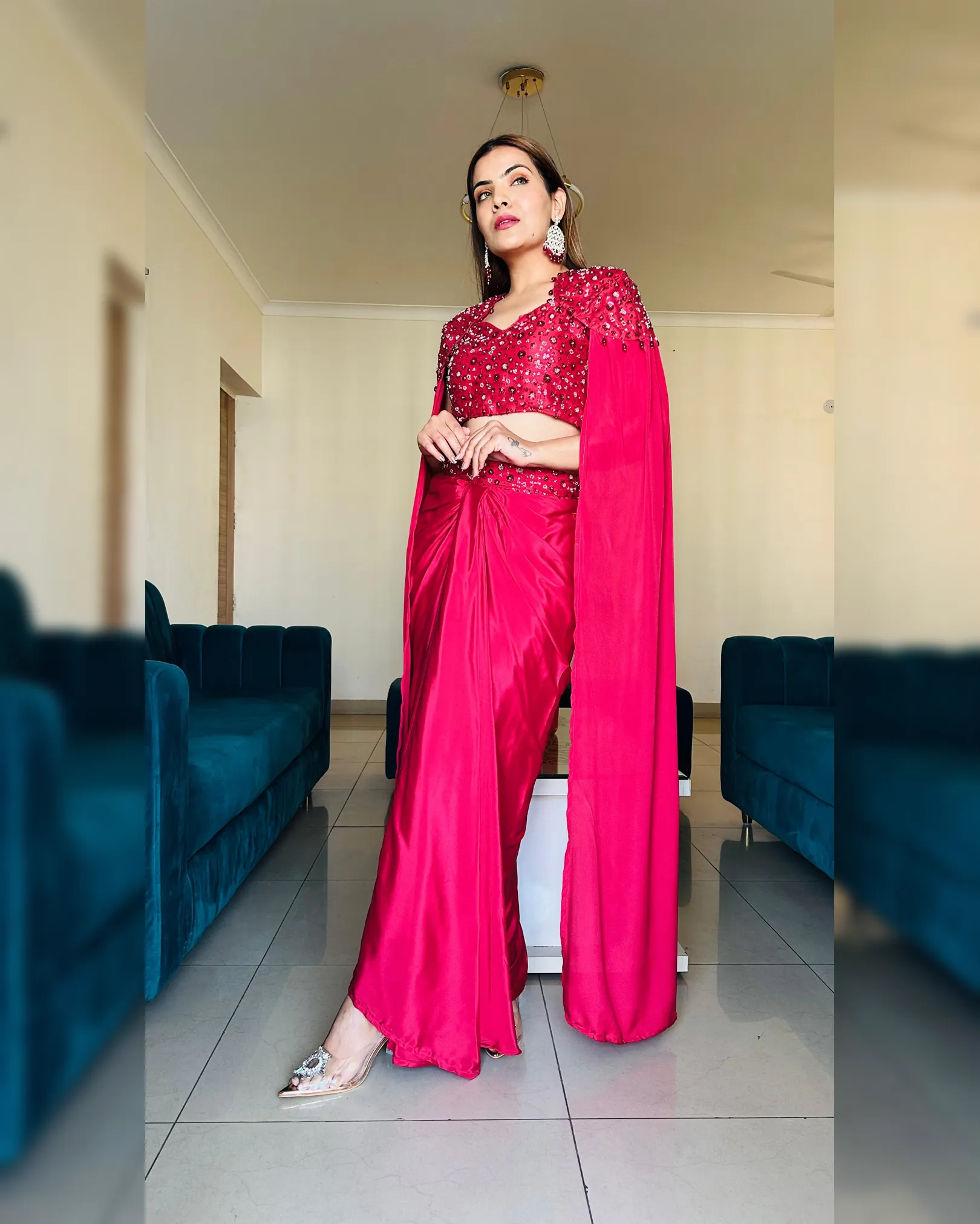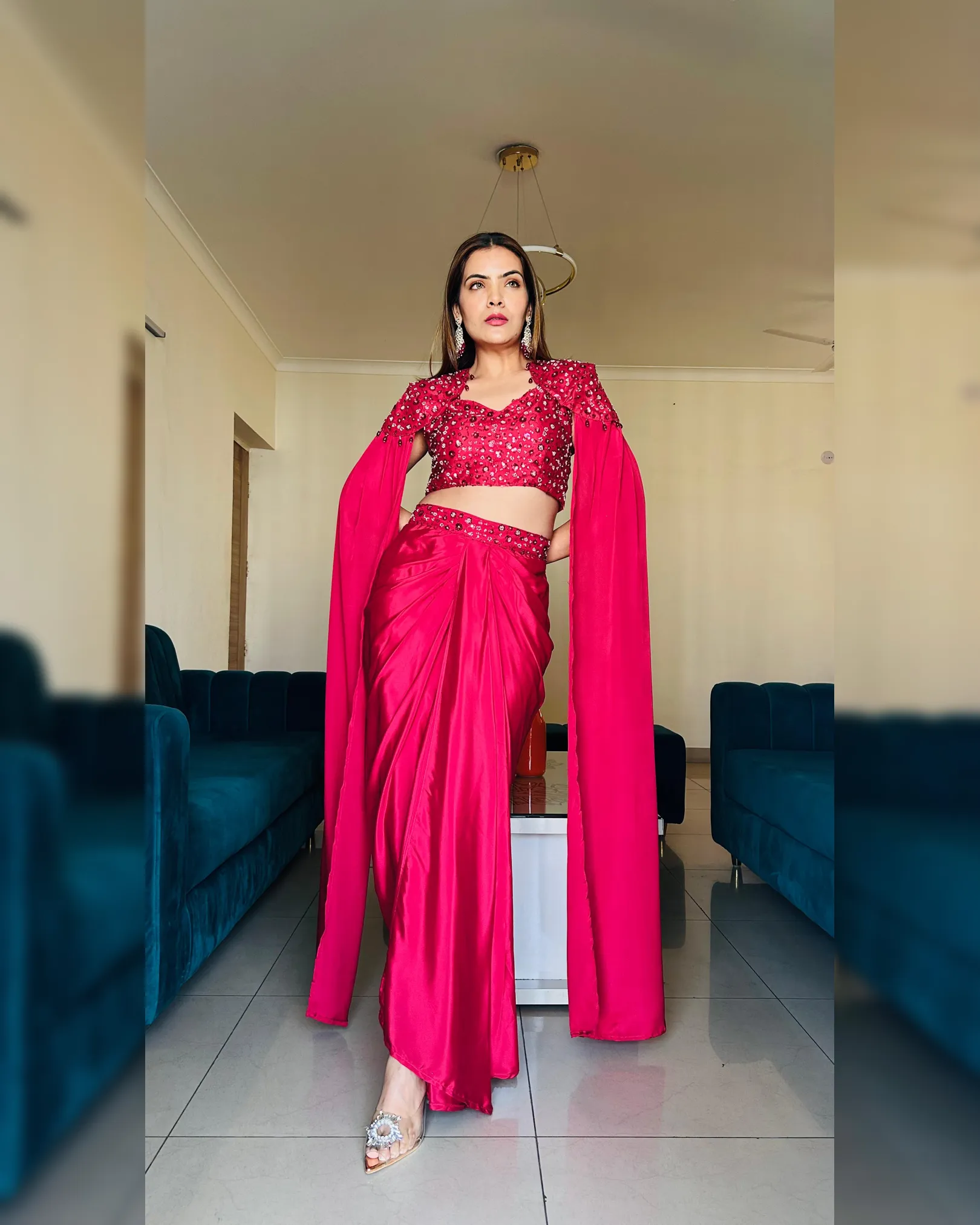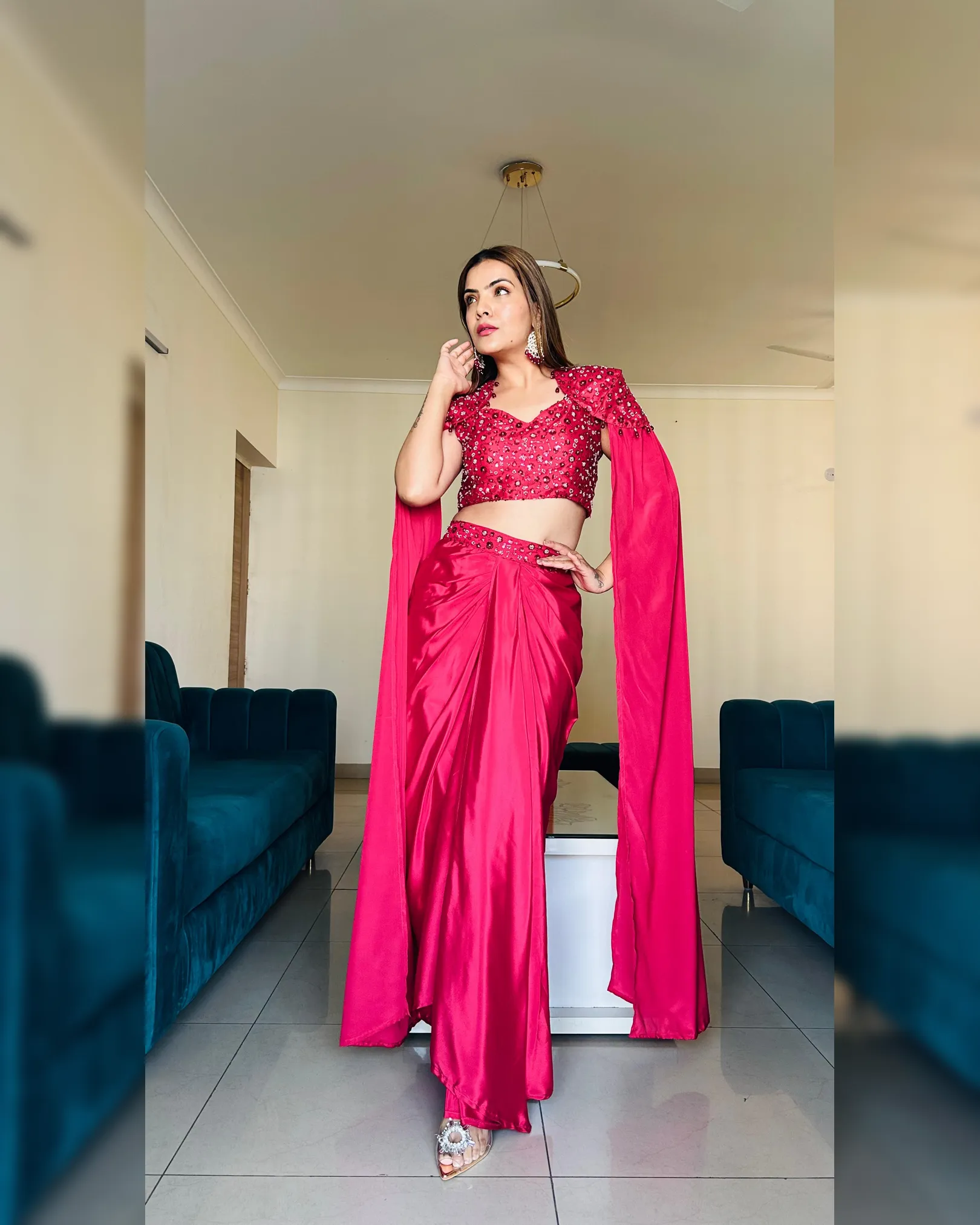 This luxurious ready-to-wear Indo-western ensemble features a beautifully draped skirt paired with a stylish crop top and an elegant long-sleeve cape. Crafted in rich crepe silk and embellished with intricate sequins and beads work, this outfit blends modern glamour with bridal elegance—perfect for wedding functions, receptions, cocktail parties, and festive celebrations.