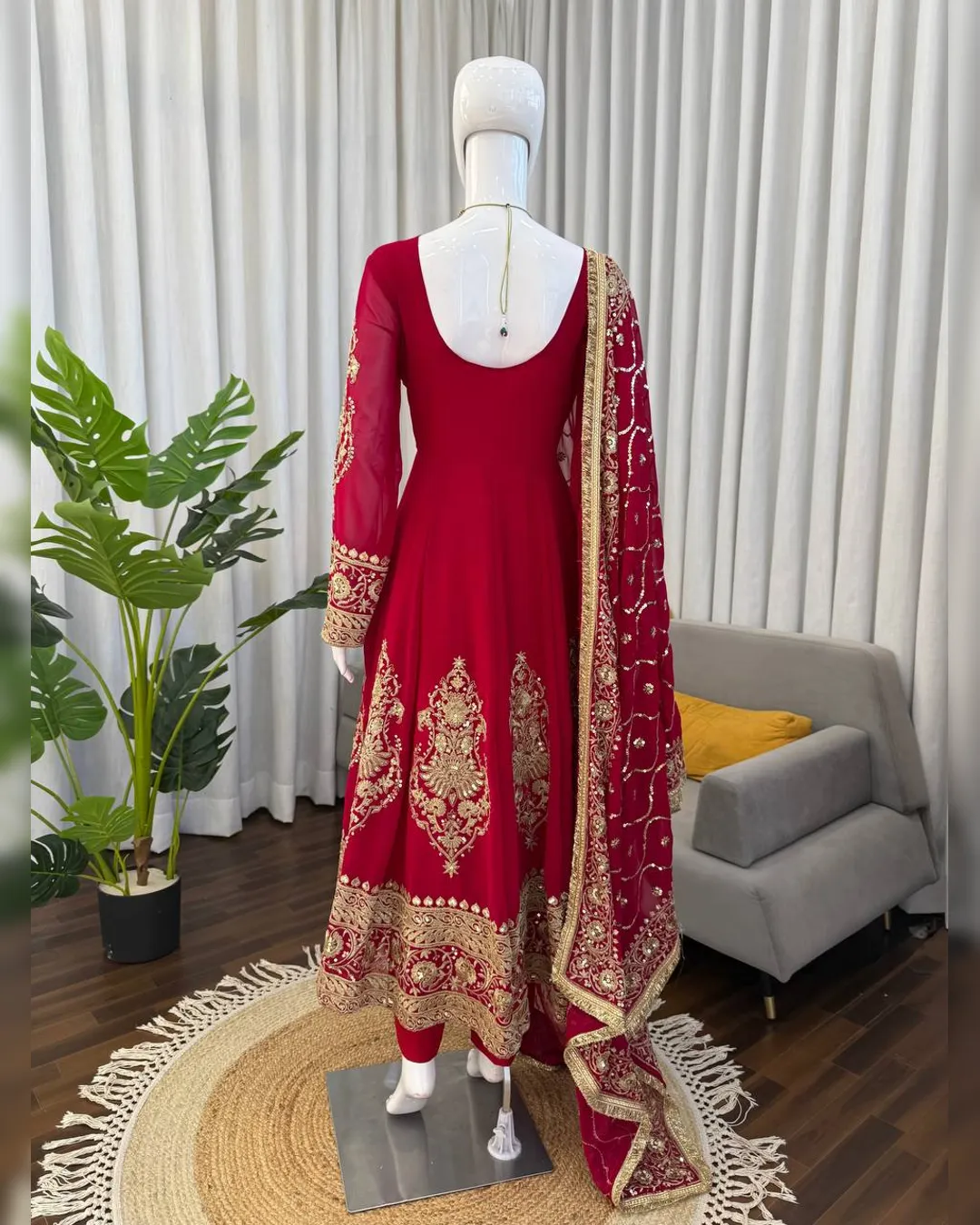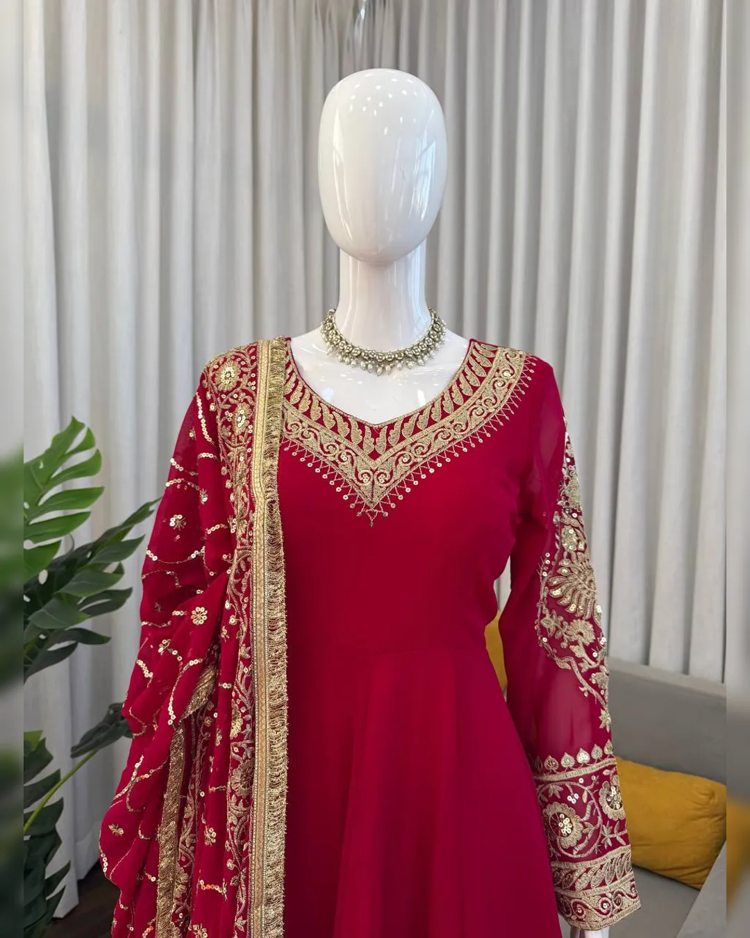 Make a grand style statement at weddings and festive celebrations with this Designer Faux Georgette Anarkali Pant Set. Crafted in premium faux georgette fabric, the Anarkali features elegant thread and sequence embroidery that adds a graceful shimmer to your look. The soft micro cotton lining ensures comfort for long hours, while the well-flared silhouette enhances your festive charm.