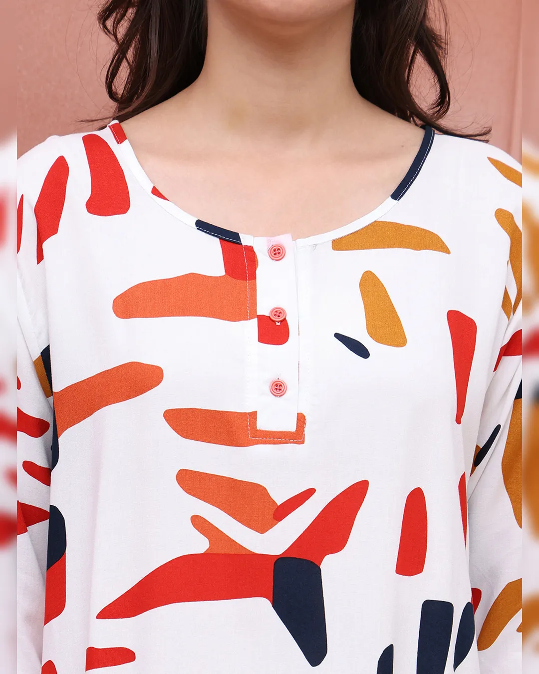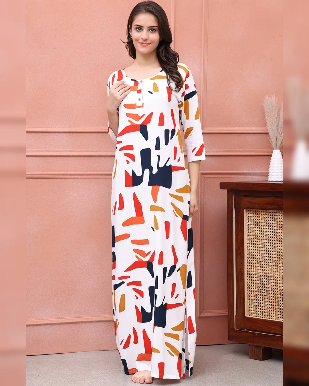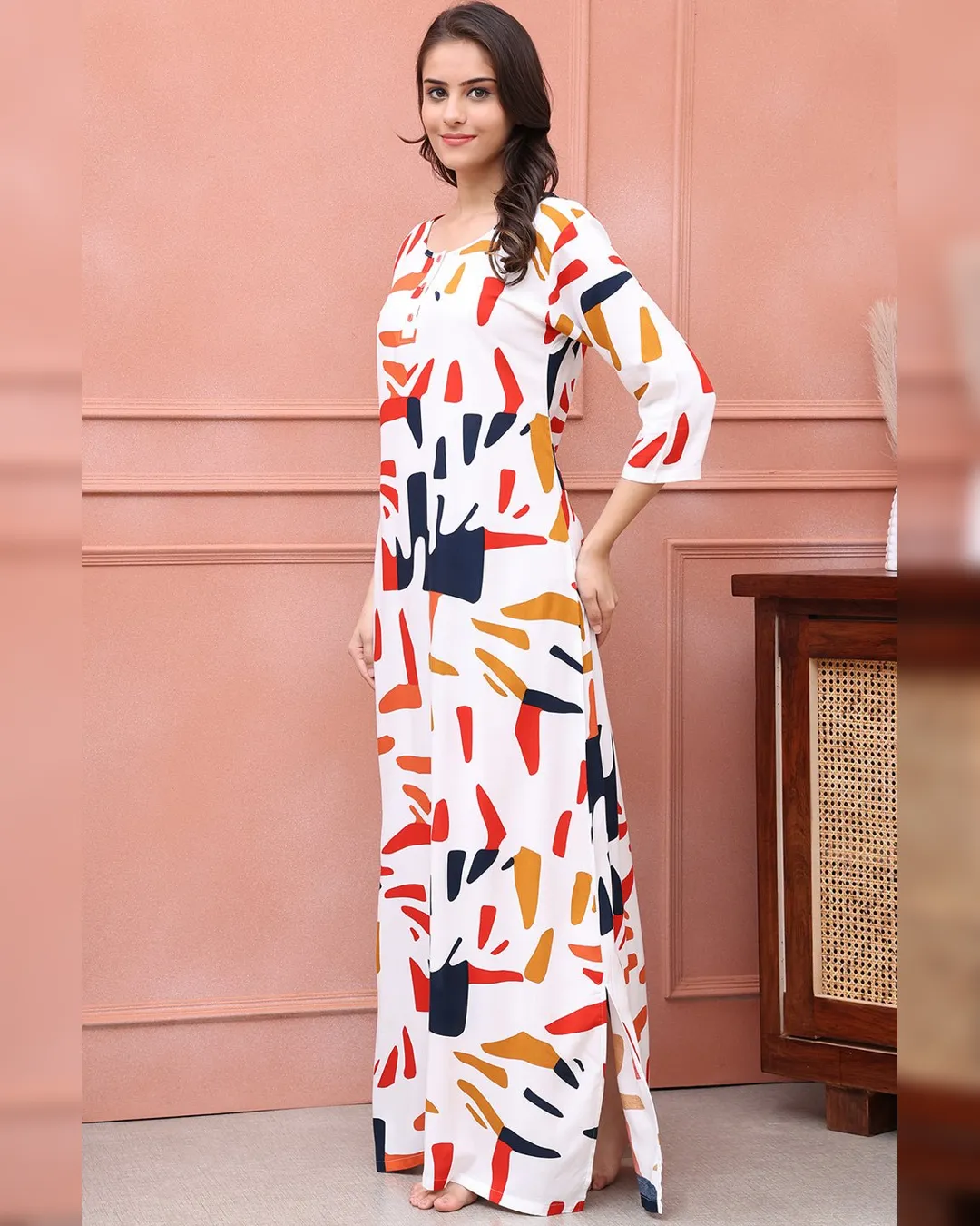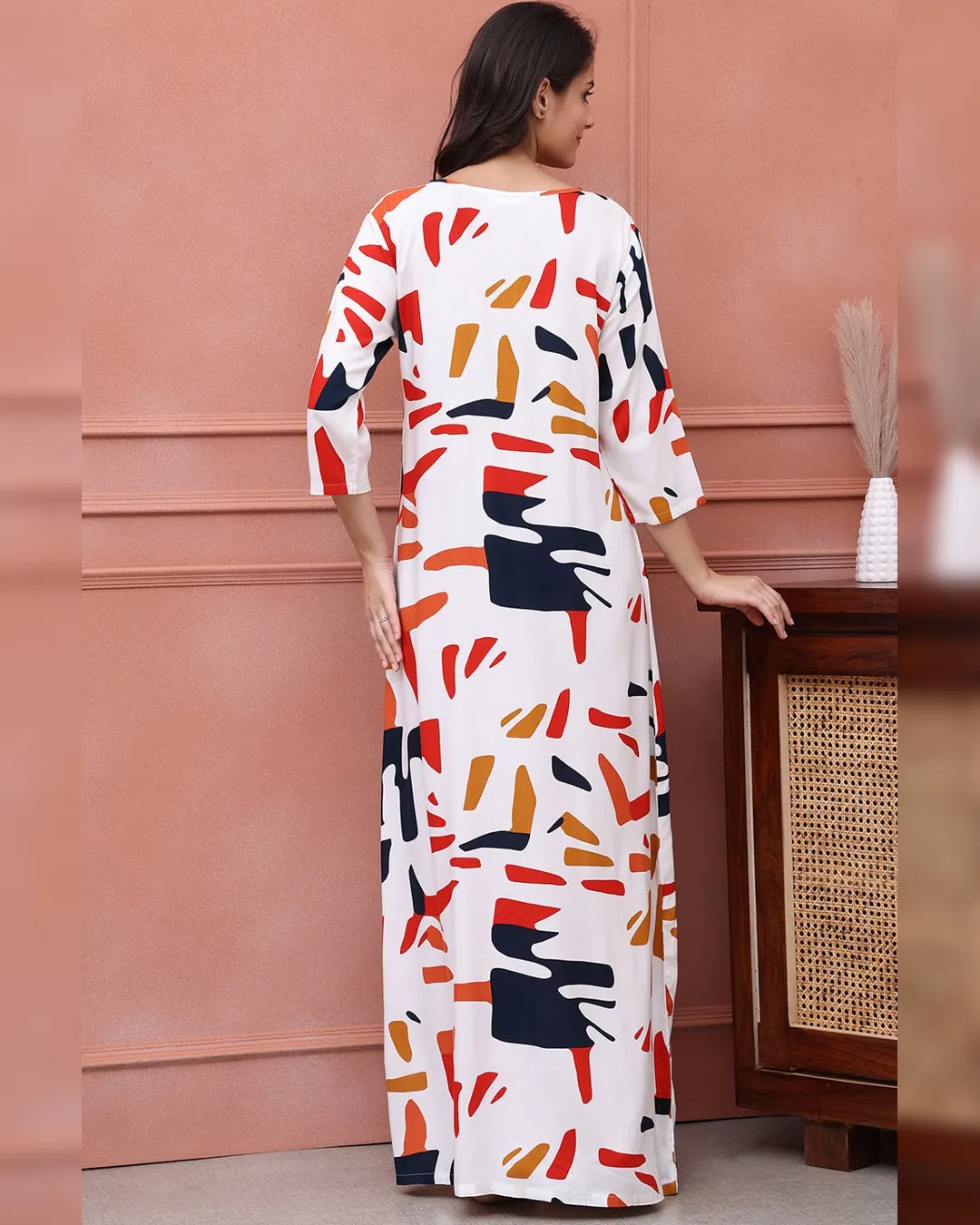 Slip into timeless elegance with this White Abstract Printed Viscose Rayon Maxi Nightdress, a perfect fusion of softness, style, and sophistication. Designed with comfort in mind, the premium viscose rayon fabric offers a lightweight and breathable feel against the skin. Featuring a flattering round neck, three-quarter sleeves, and a flowing maxi length, this nightdress is ideal for relaxing evenings and peaceful nights. The modern abstract print on a white base adds a fresh and chic vibe to your nighttime wardrobe.