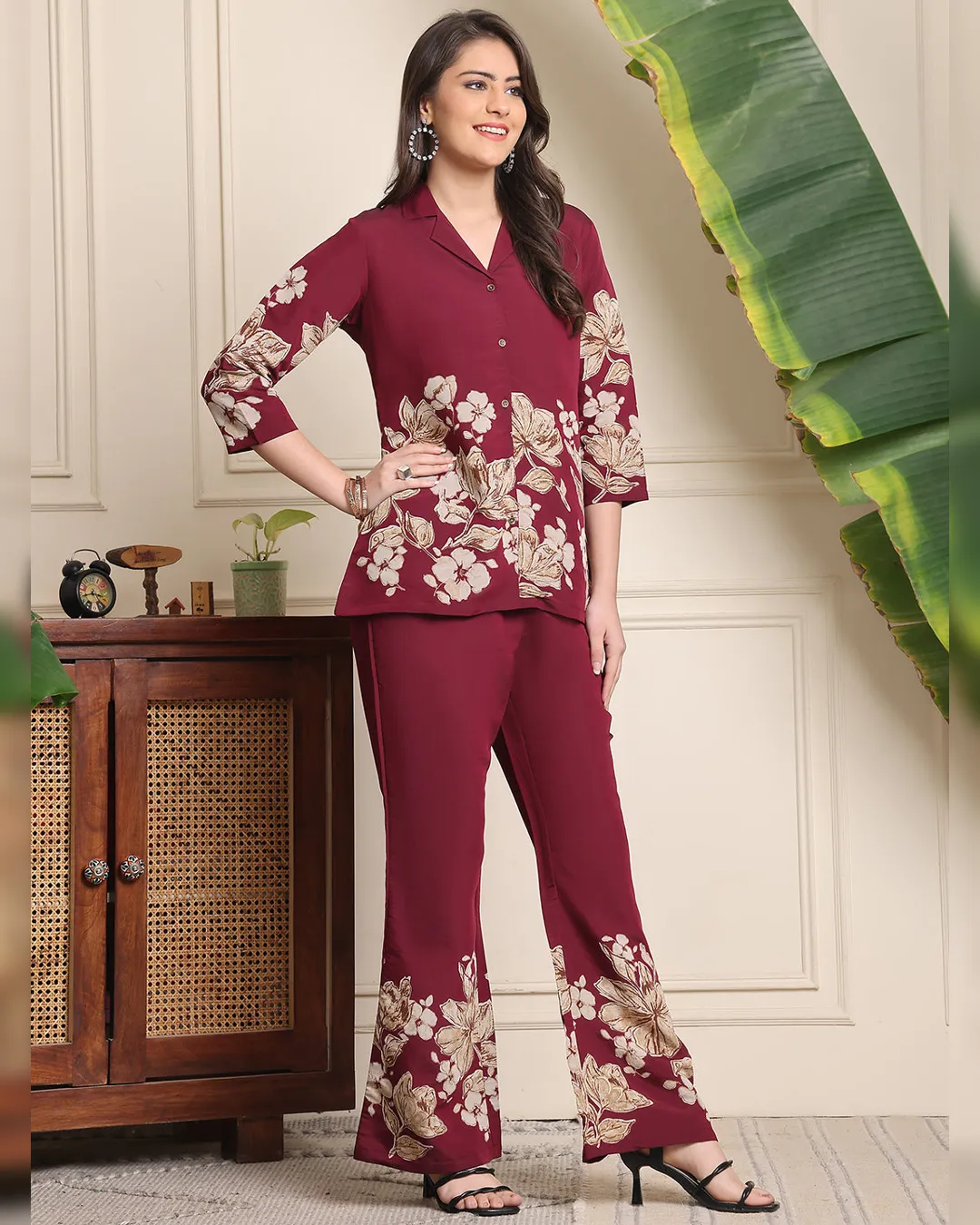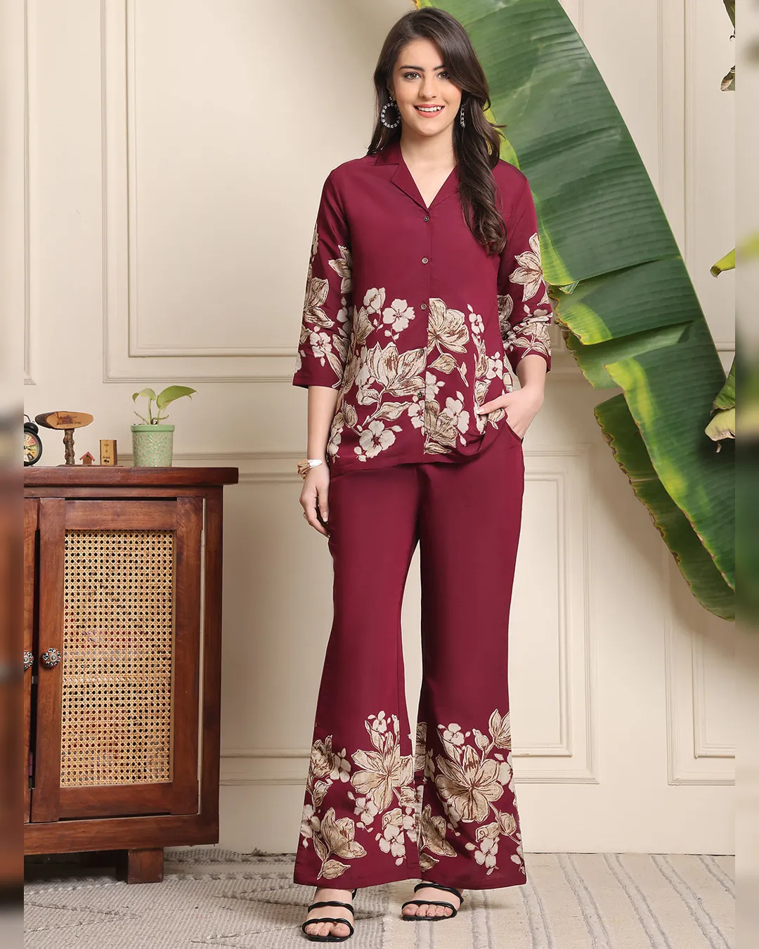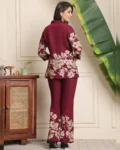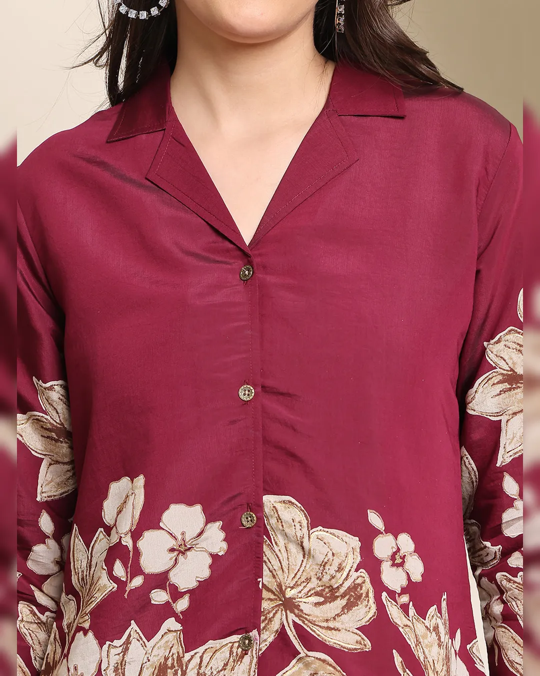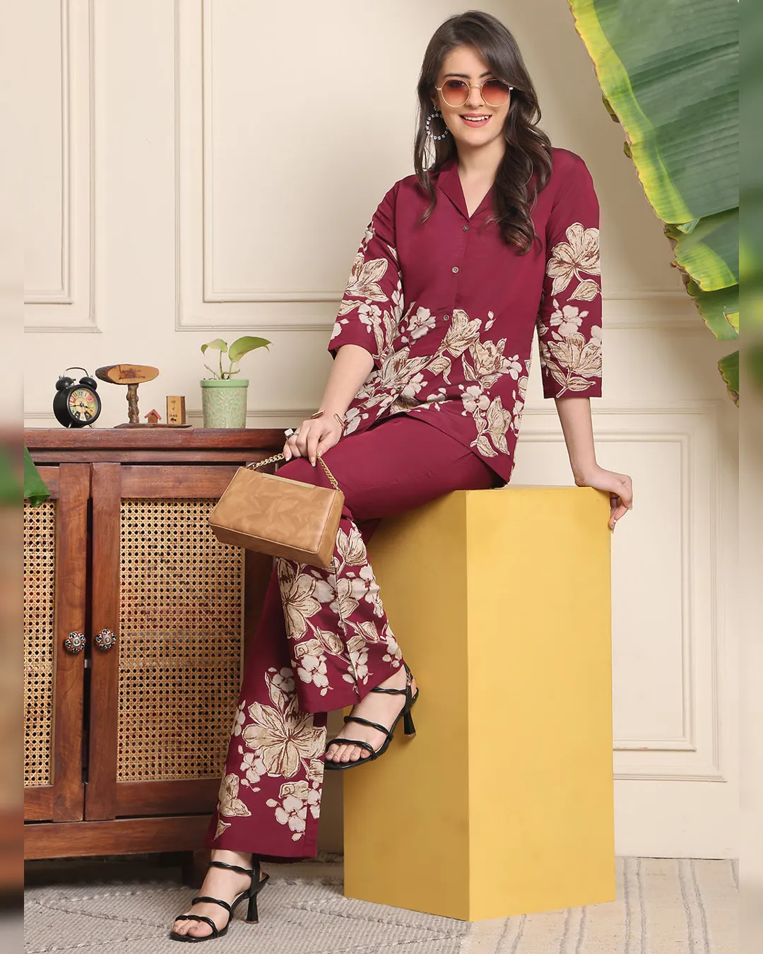 Premium wine floral co-ord set in Chanderi silk with a stylish tunic and slip-on trousers—perfect for elegant casual wear, office looks, or festive gatherings.