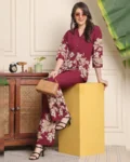 Step into refined elegance with this Wine Floral Printed Premium Chanderi Co-Ord Set, crafted for the modern woman who values both style and comfort. Made from luxurious and breathable Chanderi silk, this set features a wine-colored tunic adorned with delicate floral prints, a lapel mandarin collar, three-quarter sleeves, and a sleek button-down front with a straight hem. The look is completed with matching printed trousers featuring a comfortable slip-on waistband. This versatile ensemble is perfect for office wear, festive occasions, or elevated everyday outings.