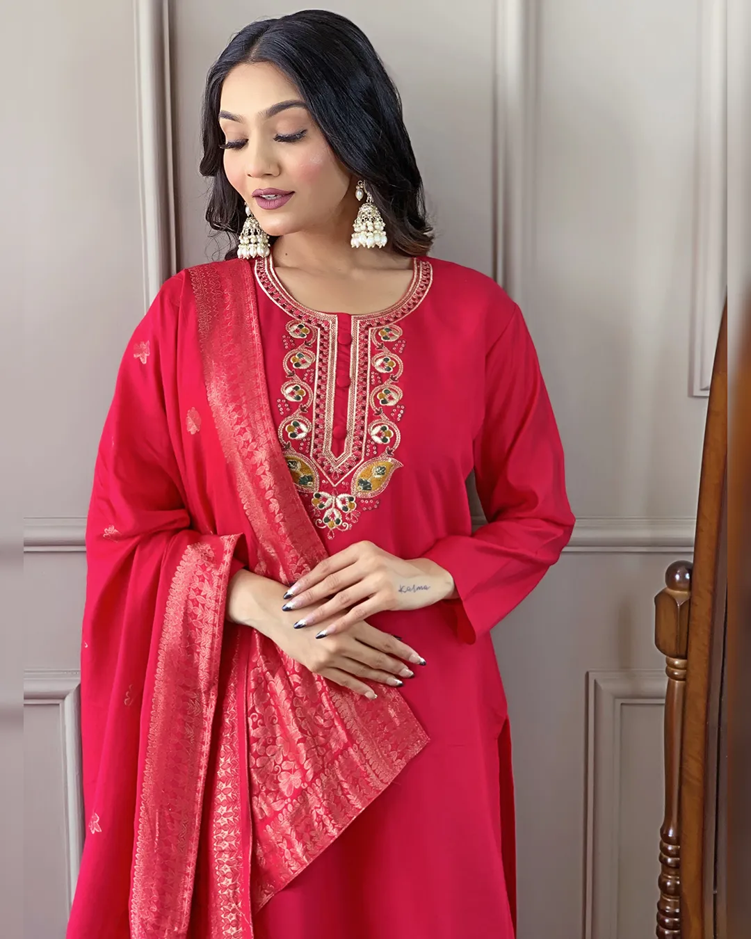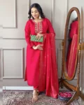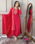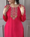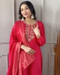 Elegant Viscose Chanderi Embroidered Kurta Set with matching pants and a nylon jacquard dupatta – a perfect blend of style and comfort!