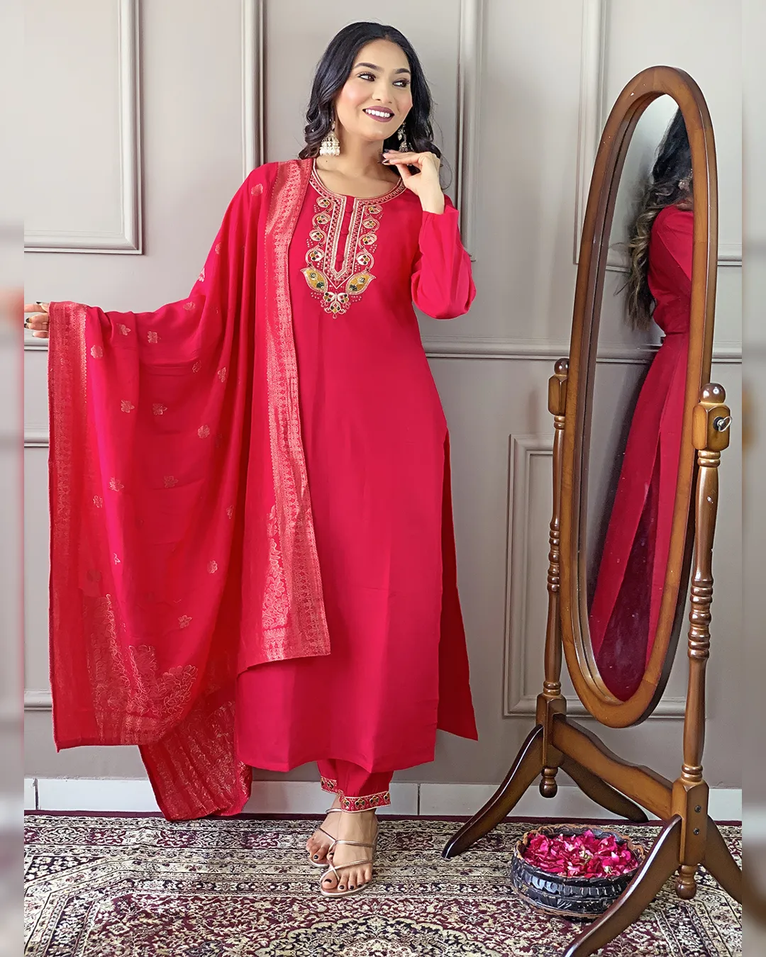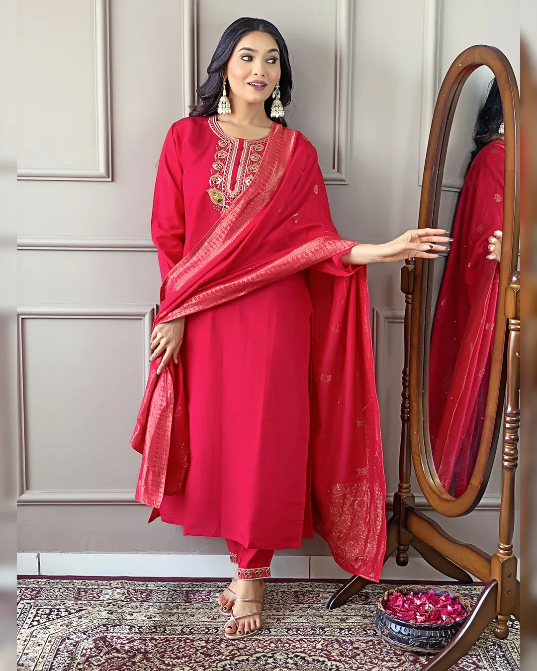Make a bold statement with this Women's Red Viscose Chanderi Kurta Set, designed for elegance and comfort. Featuring a beautifully embroidered straight kurta, this set is paired with matching viscose chanderi pants and a stunning nylon jacquard dupatta. The lightweight fabric ensures all-day comfort, making it an ideal choice for festive occasions, office wear, and casual outings. Elevate your ethnic wardrobe with this exquisite ensemble!