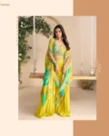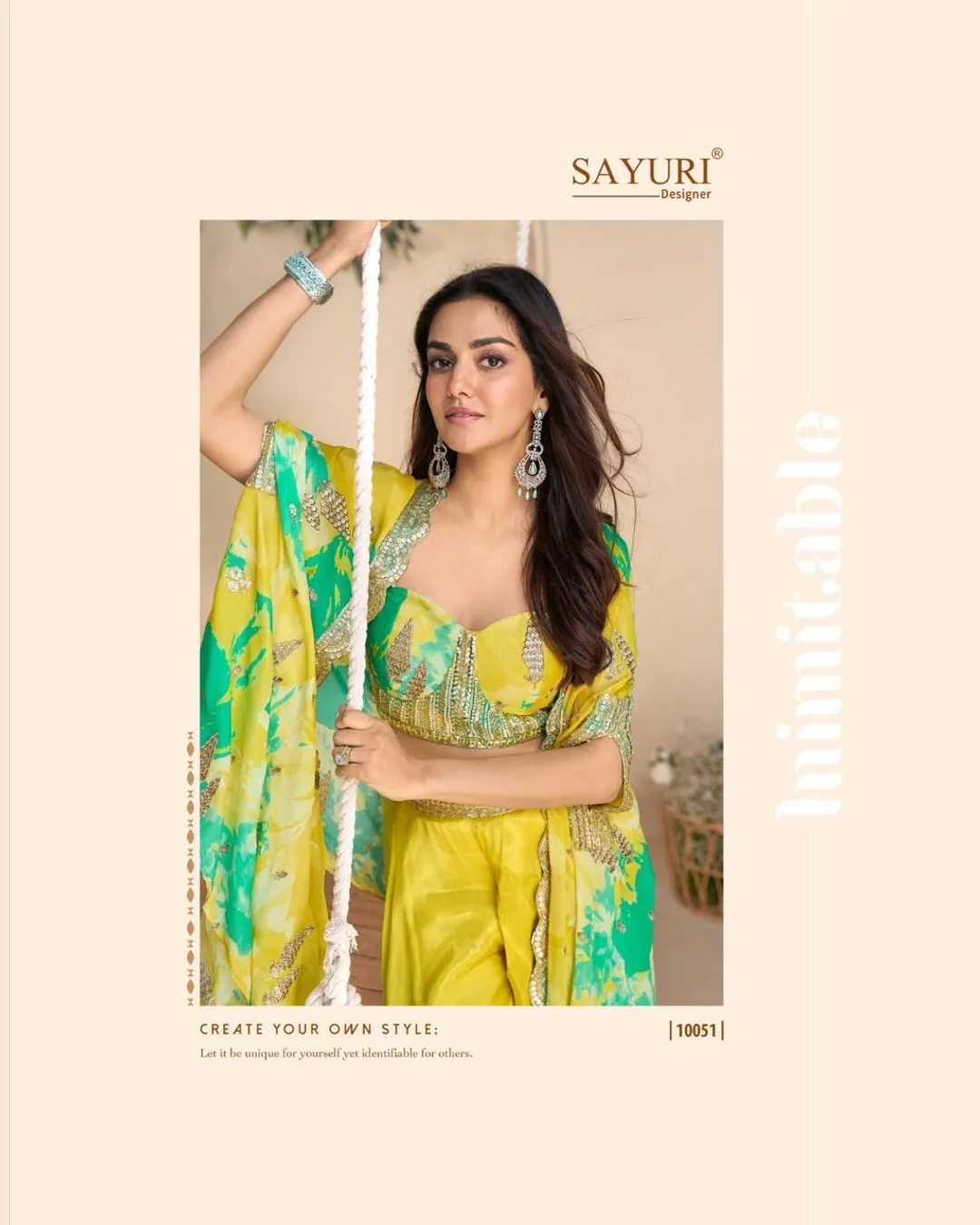 Bring brightness to every occasion with this stunning yellow and green Sayuri WONAYA 10051 set. Made from luxurious real Chinon silk, the ensemble includes a hand-embroidered blouse, a soft flowing plazzo, and a lightweight floral shrug. The vibrant color palette and intricate detailing make it a statement piece for haldi, mehendi, and festive celebrations.