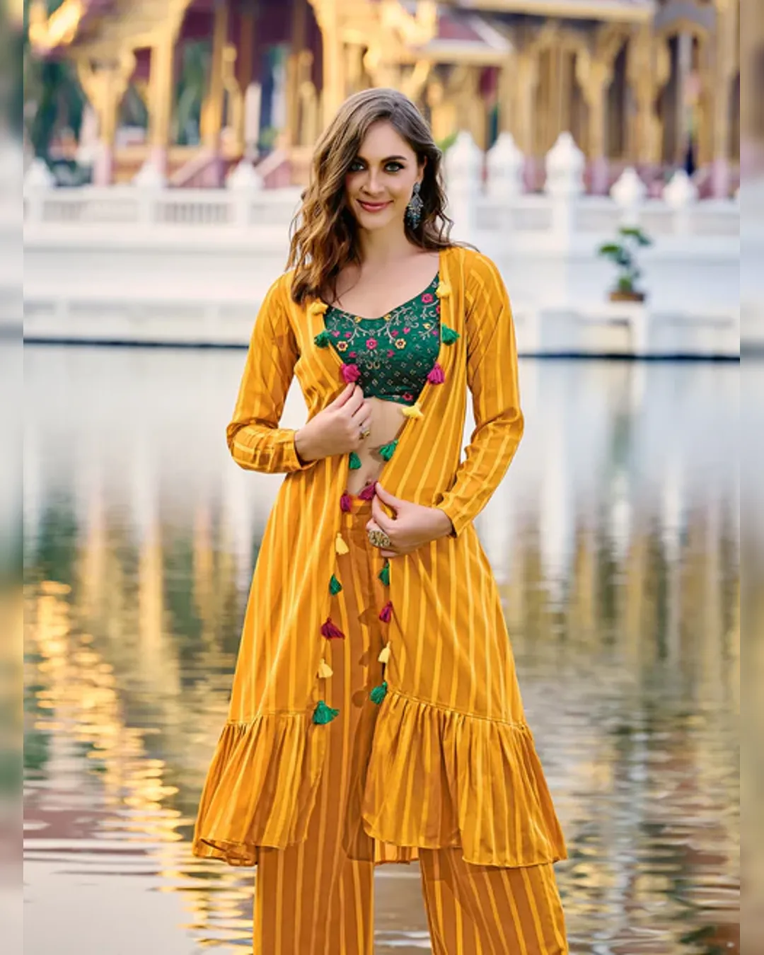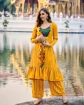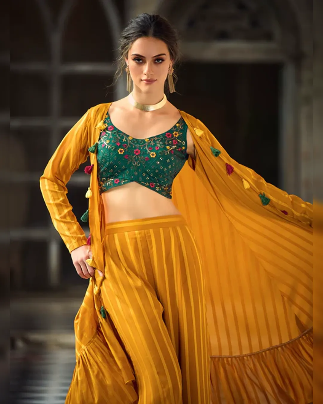 Yellow embroidered chinon choli with georgette koti and palazzo – a vibrant festive-ready set blending style and tradition.