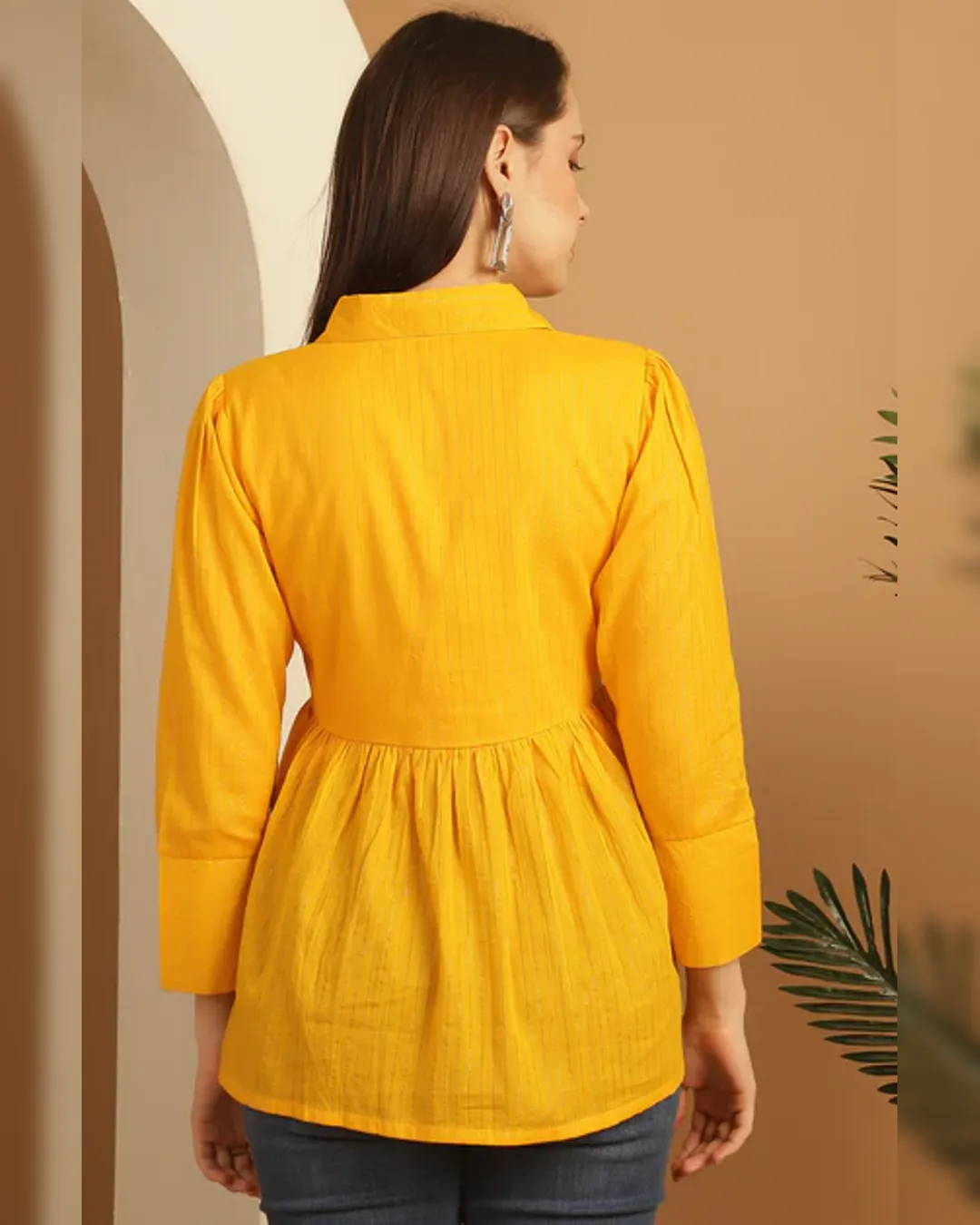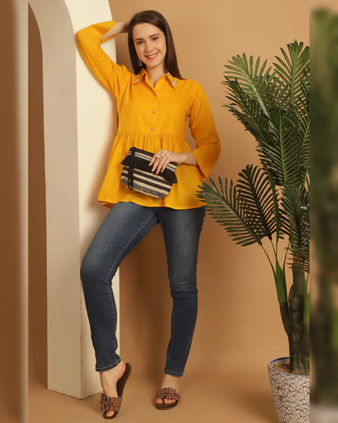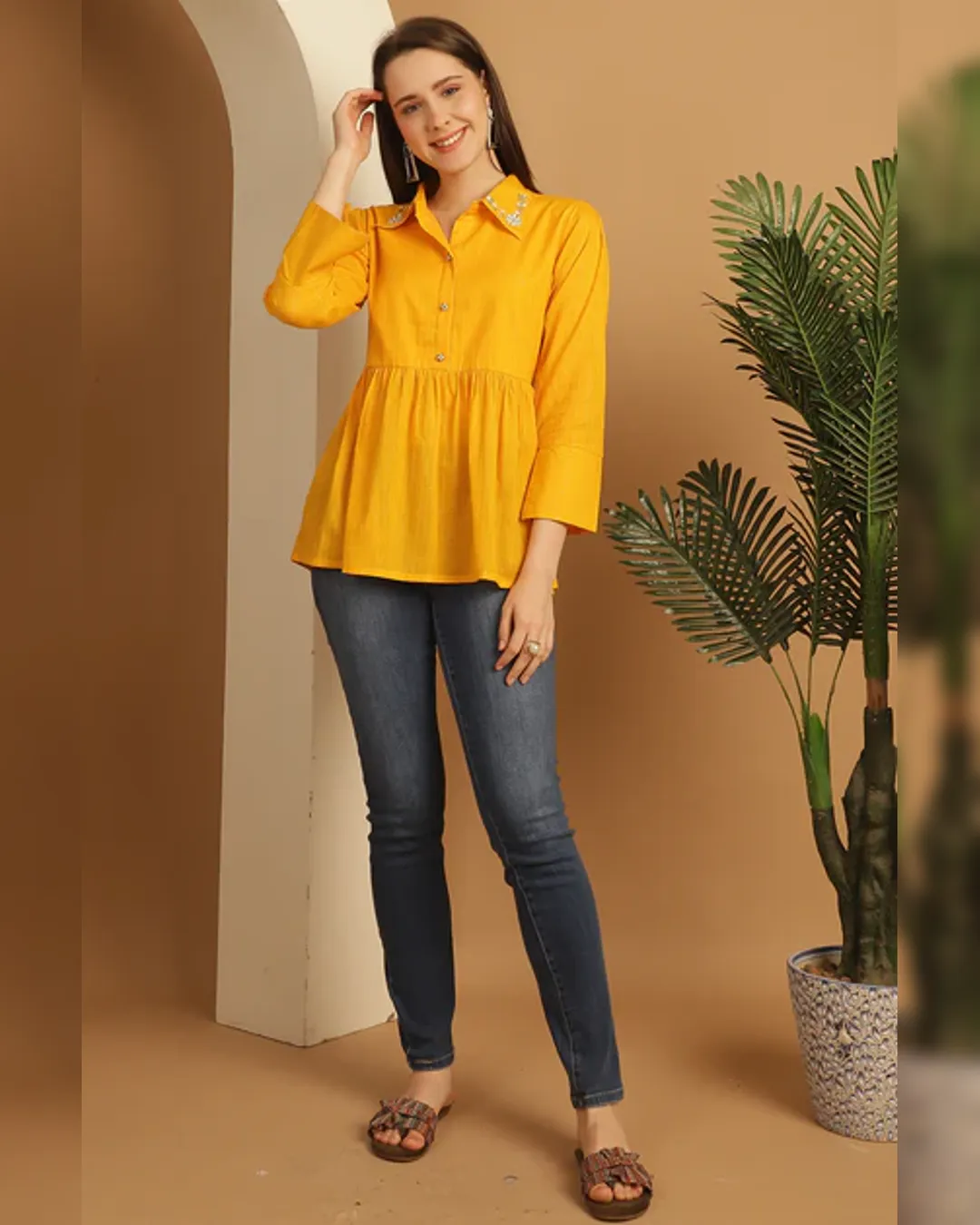 Elevate your casual style with this Slim Fit Cotton Short Kurti, designed to pair effortlessly with denim jeans or trousers. Crafted from breathable cotton and adorned with subtle thread work, this 29-inch kurti offers both comfort and elegance, making it ideal for office hours, college days, or casual outings.